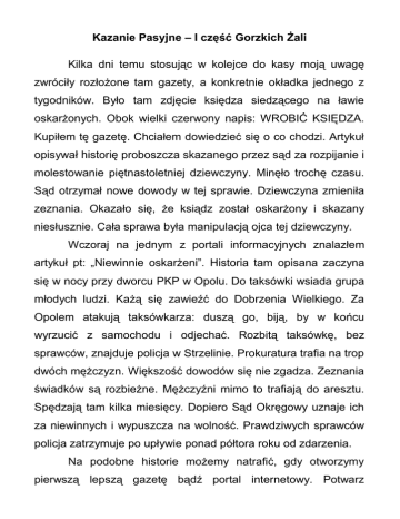Kazanie Pasyjne – I część Gorzkich Żali Kilka dni temu stosując w kolejce do kasy moją uwagę zwróciły rozłożone tam gazety, a konkretnie okładka jednego z tygodników. Było tam zdjęcie księdza siedzącego na ławie oskarżonych. Obok wielki czerwony napis: WROBIĆ KSIĘDZA. Kupiłem tę gazetę. Chciałem dowiedzieć się o co chodzi. Artykuł opisywał historię proboszcza skazanego przez sąd za rozpijanie i molestowanie piętnastoletniej dziewczyny. Minęło trochę czasu. Sąd otrzymał nowe dowody w tej sprawie. Dziewczyna zmieniła zeznania. Okazało się, że ksiądz został oskarżony i skazany niesłusznie. Cała sprawa była manipulacją ojca tej dziewczyny. Wczoraj na jednym z portali informacyjnych znalazłem artykuł pt: „Niewinnie oskarżeni”. Historia tam opisana zaczyna się w nocy przy dworcu PKP w Opolu. Do taksówki wsiada grupa młodych ludzi. Każą się zawieźć do Dobrzenia Wielkiego. Za Opolem atakują taksówkarza: duszą go, biją, by w końcu wyrzucić z samochodu i odjechać. Rozbitą taksówkę, bez sprawców, znajduje policja w Strzelinie. Prokuratura trafia na trop dwóch mężczyzn. Większość dowodów się nie zgadza. Zeznania świadków są rozbieżne. Mężczyźni mimo to trafiają do aresztu. Spędzają tam kilka miesięcy. Dopiero Sąd Okręgowy uznaje ich za niewinnych i wypuszcza na wolność. Prawdziwych sprawców policja zatrzymuje po upływie ponad półtora roku od zdarzenia. Na podobne historie możemy natrafić, gdy otworzymy pierwszą lepszą gazetę bądź portal internetowy. Potwarz obmowa, niesłuszne oskarżenia. To wszystko wydaje się już być naturalnym elementem naszego życia. Ludzie lubią wydawać osąd o innych, lubią mówić o innych. Powiem więcej. Lubią mówić źle o innych. Czy zawsze tak było? A może jest to charakterystyczne tylko dla naszych czasów? Moi drodzy, przed chwilą byliśmy świadkami sądu sprzed ponad 2. tysięcy lat. Sądu na Jezusem. To nie dzisiejsze gazety opisują ten proces. Relacjonują go Ewangeliści. Chrystusa przyprowadzono przed Wysoką Radę. Odbył się sąd. Ale cóż to był za sąd? Na podstawie czego? Według przekazu Mateusza, sąd nad Jezusem odbył się natychmiast po aresztowaniu. Sądzono Go pod osłoną nocy w domu arcykapłana. Dlaczego nie skorzystano z sali Sanhedrynu? Czyżby liczył się czas? Czy może chciano się ukryć? Arcykapłan nie przestrzegałby Prawa? Chyba tak. Według Talmudu w czasie procesu należy robić wszystko, by ocalić oskarżonego od śmierci. Proces należy przeprowadzić w dzień. Gdy mamy do czynienia ze sprawą gardłową, wyrok nie może być wydany w dzień procesu. Ktoś powie, że Talmud to II wiek po Chrystusie. Mimo możemy przypuszczać, że spisane tam nakazy obowiązywały już w czasach Jezusa. A gdyby jednak nie obowiązywały ? To mamy jeszcze przepis zawarty w Księdze Liczb i Powtórzonego Prawa. Wyrok może zapaść tylko wtedy, gdy winę oskarżonego udowodni zgodnie co najmniej dwóch świadków. Ten pseudoproces nie spełnia żadnego przepisu prawa. Gdy nawet podstawieni świadkowie zawiedli, bo jak pisze Mateusz: „Ich zeznania nie były zgodne”, zostało już tylko wymuszenie na Jezusie przyznania się do winy. Jednak nie można było skazać człowieka na śmierć, tylko dlatego, ze uważał się za Mesjasza Niech więc wyzna, że jest Synem Bożym. Niech zbluźni! I faktycznie potwierdzi swoje boskie pochodzenie. Jezus nie mógł zrobić inaczej. Miał świadomość, że jest Bogiem, a zatem odpowiada zgodnie z prawdą. Dla Sanhedrynu jednak nie liczyła się prawda. Dla nich najważniejsze było zaspokojenie swoich żądz i pragnień. A pragnęli śmierci Jezusa. Dostali powód do wydania wyroku. Wydają go od razu, chociaż, powinni poczekać przynajmniej jeden dzień. Tu jednak liczy się czas, chęć władzy i pragnienie śmierci Tego, który zagraża ich pozycji i wygodnemu życiu. Cały ten proces to jedna wielka farsa, o wcześniej przesądzonym werdykcie. Kochani, dzisiejszy fragment Ewangelii ma w pewnym sensie swoje odzwierciedlenie we wcześniej przytoczonych historiach. Historiach ludzi niesłusznie oskarżonych. Co więcej niesłusznie skazanych. Wyroki na ludzi – sprawiedliwe bądź nie – wydają dzisiaj nie tylko sądy i trybunały. Dzisiaj to głównie dziennikarze przedstawiają opinii publicznej potencjalnych winnych. Posługują się oni potężnymi środkami wpływania na opinię publiczną. Radio, telewizja, Internet, codzienna prasa to ich największa broń. W jednym ze swoich przemówień, bł. Jan Paweł II zauważył, że środki społecznego przekazu ulegają dzisiaj pokusie manipulacji informacją, zakłamując tym samym prawdę o człowieku. Często więc osądy dziennikarzy są krzywdzące i niesprawiedliwe. Musimy przyznać rację papieżowi. Ile to razy już słyszeliśmy w mediach takie hasła jak: „złapany”, „osądzony”, „złodziej”, „morderca”, „gwałciciel”, „pedofil”. To zwroty, które bardzo chętnie podawane są przez prasę, telewizję i internet. Im więcej pikantnych historyjek, tym większe zainteresowanie odbiorców. Tak, nazbyt często ludzie pozwalają, by emocje brały górę nad zdrowym rozsądkiem. Jak często słyszymy takie opinie: „Panie ja to takiego bym od razu…” Człowiek szybko ocenia innych. Muszę się wam przyznać, że i ja kiedy wszedłem na tę ambonę. Popatrzyłem na was. I już w myślach wydałem osąd kto mnie będzie słuchał, kto spał, a kto skrytykuje bądź powie, że za długo. Człowiek uwielbia oceniać drugiego człowieka. Tymczasem przebieg procesu Jezusa powinien być dla każdego z nas ostrzeżeniem. Ostrzeżeniem przed pochopnym wydawaniem sądów o kimkolwiek z naszych bliźnich, nawet o tym którego zbytnio nie lubimy. Ostrzeżeniem przed bezmyślnym powielanie opinii. Tym bardziej przed powielaniem tej opinii w celu przypodobania się jakiejś grupie. Jan Paweł II mówiąc o osądzani