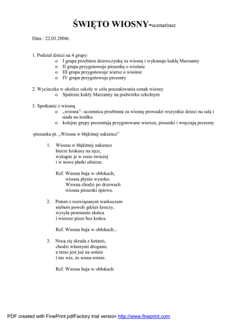 Ś WIĘ TO WIOSNY-scenariusz Data : 22.03.2004r. 1. Podział dzieci na 4 grupy: o I grupa przebiera dziewczynkę za wiosnę i wykonuje kukłę Marzanny o II grupa przygotowuje piosenkę o wiośnie o III grupa przygotowuje wiersz o wiośnie o IV grupa przygotowuje prezenty 2. Wycieczka w okolice szkoły w celu poszukiwania oznak wiosny o Spalenie kukły Marzanny na podwó rku szkolnym 3. Spotkanie z wiosną o „wiosna” - uczennica przebrana za wiosnę prowadzi wszystkie dzieci na salę i siada na środku o kolejne grupy prezentują przygotowane wiersze, piosenki i wrę czają prezenty -piosenka pt. „Wiosna w błę kitnej sukience” 1. Wiosna w błę kitnej sukience bierze krokusy na rę ce, wyką pie je w rosie śwież ej i w nowe płatki ubierze. Ref. Wiosna buja w obłokach, wiosna płynie wysoko. Wiosna chodzi po drzewach wiosna piosenki śpiewa. 2. Potem z rozwiązanym warkoczem niebem powoli gdzieś kroczy, wysyła promienie słońca i wiersze pisze bez końca. Ref. Wiosna buja w obłokach... 3. Nocą się skrada z kotami, chodzi własnymi drogami, a teraz jest już na sośnie i nie wie, ż e sosna rośnie. Ref. Wiosna buja w obłokach PDF created with FinePrint pdfFactory trial version http://www.fineprint.com -wiersz pt. „Zielony wiersz” Wyjdę do parku z rana, założ ę zielone ubranie: spodnie zielone, marynarkę zieloną , zielony krawat poprawię zieloną dłonią . Zielony nad stawem przystanę , rozepnę zielone ubranie, włosy rozczeszę w koronę , rę ce uniosę do gó ry jak dwie gałę zie zielone, by w locie zatrzymać chmury. -prezenty: konewka, kwiaty, kalosze, 4. Wspó lne wiosenne śniadanie 5. Zabawa taneczno- inscenizacyjna pt. „Deszczyk” Pada deszczyk, pada deszczyk, wieje, wieje wiatr. Pada deszczyk, pada deszczyk, wieje, wieje wiatr. Błyskawica, grzmot. Błyskawica, grzmot, a na niebie kolorowa tę cza. Opracowała: mgr Jolanta Ciepiela PDF created with FinePrint pdfFactory trial version http://www.fineprint.com Ś WIĘ TO JESIENI -scenariusz Data: 23.09.2004r. 1. Wycieczka w okolice szkoły w celu poszukiwania oznak jesieni. 2. Podział dzieci na 4 grupy: o I grupa przebiera dziewczynkę za jesień o II grupa przygotowuje piosenkę o jesieni o III grupa przygotowuje wiersz o jesieni o IV grupa przygotowuje prezenty 3. Spotkanie z jesienią -„Jesień” - uczennica przebrana za jesień prowadzi wszystkie dzieci na salę i siada na środku o kolejne grupy prezentują przygotowane wiersze, piosenki i wrę czają prezenty -piosenka pt. „Jarzę binka” Już lato odeszło i kwiaty przekwitły, a jednak coś w słońcu się mieni. To w polu i w lesie czerwienią się spó jrzcie, korale, korale jesieni. Ref. Idzie lasem Pani Jesień, jarzę binę w koszu niesie. Daj korali nam troszeczkę , nawleczemy na niteczkę . Włoż ymy korale, korale czerwone, i biegać bę dziemy po lesie. Bę dziemy śpiewali piosenkę jesienną , niech echo daleko ją niesie. Ref. Idzie lasem... -wiersz pt .” Idzie jesień z pełnym koszem” : - Jestem jesień z pełnym koszem. Dobre rzeczy wam przynoszę : gruszki klapsy, gruszki bery, pomidory i selery, rzodkiew, rzepkę , kalarepkę i pietruszkę na przyczepkę . Przyszła jesień do gosposi: - Czy gosposia o coś prosi? Mam kapustę do kwaszenia, dobre grzyby do suszenia, borowiki- same głó wki, słodkie śliwki i boró wki, pyszne jabłka na kompoty, PDF created with FinePrint pdfFactory trial version http://www.fineprint.com no, i gruszki bergamoty. Idzie jesień z wielkim koszem. -Bierzcie, proszę ! Jedzcie, proszę ! Komu jabłka? Komu rydze? Komu śwież ą kukurydzę ? I z koszyka wszystko znika, ż e już widać dno koszyka. Ludzie biorą te podarki i chowają do spiż arki. Nasze mamy smaż ą dż emy, a my potem wszystko zjemy. - piosenka pt. „Zbieramy grzyby” Z wielkim koszem idzie jesień po lesie. Co w tym koszu Pani Jesień nam niesie? Ref. Kurki, rydze i maślaki, borowiki i kozaki, pozbieramy dziś.(bis) Muchomora ominiemy z daleka. Niech muchomor na złe muchy tu czeka. Ref. Kurki, rydze... Poszukamy ż ó łtych kurek pod sosną . Nad potokiem smaczne rydze nam rosną . Ref. Kurki, rydze... -prezenty: konewka, kwiaty, kalosze, jesienne owoce, szyszki, liście 4. Rozwią zywanie zagadek o tematyce jesiennej: -Ocieniamy dzieciom głowy, gdy pora gorą ca. Zaszumimy pod nogami, gdy nas chłó d postrą ca.(liście) -Gdy ładna pogoda, stoję w ką cie skromnie. Za to gdy deszcz pada, pamię taj o mnie.(parasol) -Nie ma ust- a dmucha! Nie ma skrzydeł- a leci! Czasami mrozi, czasem chucha. Co to? Czy odgadną dzieci?(wiatr) -Ostatni liść z drzewa spadł! Koniec pogody to...(listopad) -Choć rą k nie ma, zgina drzewa. Choć ust nie ma, pieśni śpiewa.(wiatr) -Spadają z drzewa ż ó łte, czerwone, wicher je niesie w tę i tamtą stronę .(liście) PDF created with FinePrint pdfFactory trial version http://www.fineprint.com 5. Zabawa taneczno- ruchowa pt. „Sałatka owocowa” - dzieci dzielą się na grupy „owoce” tj. jabłka, gruszki, śliwki, winogrona(każ dy uczeń ma naklejony znaczek z papieru samoprzylepnego) . Prowadzą cy pokazuje ilustracje owocó w, a uczniowie na dany sygnał tańczą w rytm muzyki. 6.Jesienne śniadanie-„Pani Jesień” czę stuje wszystkich owocami. 7. Zabawa taneczno- inscenizacyjna pt. „Deszczyk” Pada deszczyk, pada deszczyk, wieje, wieje wiatr. Pada deszczyk, pada deszczyk, wieje, wieje wiatr. Błyskawica, grzmot. Błyskawica, grzmot, a na niebie kolorowa tę cza. 8. „Jesienne drzewo” - malowanie ró ż nymi technikami (praca w grupach wcześniej wyznaczonych). 9. Zabawy z chustą w kolory jesieni. Opracowała : Jolanta Ciepiela PDF created with FinePrint pdfFactory trial version http://www.fineprint.com