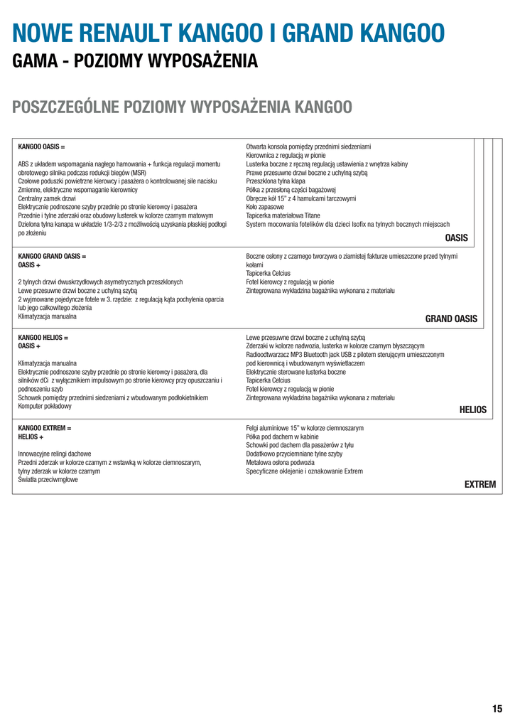 NOWE RENAULT KANGOO I GRAND KANGOO GAMA - POZIOMY WYPOSAŻENIA POSZCZEGÓLNE POZIOMY WYPOSAŻENIA KANGOO KANGOO OASIS = ABS z układem wspomagania nagłego hamowania + funkcja regulacji momentu obrotowego silnika podczas redukcji biegów (MSR) Czołowe poduszki powietrzne kierowcy i pasażera o kontrolowanej sile nacisku Zmienne, elektryczne wspomaganie kierownicy Centralny zamek drzwi Elektrycznie podnoszone szyby przednie po stronie kierowcy i pasażera Przednie i tylne zderzaki oraz obudowy lusterek w kolorze czarnym matowym Dzielona tylna kanapa w układzie 1/3-2/3 z możliwością uzyskania płaskiej podłogi po złożeniu KANGOO GRAND OASIS = OASIS + 2 tylnych drzwi dwuskrzydłowych asymetrycznych przeszklonych Lewe przesuwne drzwi boczne z uchylną szybą 2 wyjmowane pojedyncze fotele w 3. rzędzie: z regulacją kąta pochylenia oparcia lub jego całkowitego złożenia Klimatyzacja manualna KANGOO HELIOS = OASIS + Klimatyzacja manualna Elektrycznie podnoszone szyby przednie po stronie kierowcy i pasażera, dla silników dCi z wyłącznikiem impulsowym po stronie kierowcy przy opuszczaniu i podnoszeniu szyb Schowek pomiędzy przednimi siedzeniami z wbudowanym podłokietnikiem Komputer pokładowy KANGOO EXTREM = HELIOS + Innowacyjne relingi dachowe Przedni zderzak w kolorze czarnym z wstawką w kolorze ciemnoszarym, tylny zderzak w kolorze czarnym Światła przeciwmgłowe Otwarta konsola pomiędzy przednimi siedzeniami Kierownica z regulacją w pionie Lusterka boczne z ręczną regulacją ustawienia z wnętrza kabiny Prawe przesuwne drzwi boczne z uchylną szybą Przeszklona tylna klapa Półka z przesłoną części bagażowej Obręcze kół 15” z 4 hamulcami tarczowymi Koło zapasowe Tapicerka materiałowa Titane System mocowania fotelików dla dzieci Isofix na tylnych bocznych miejscach OASIS Boczne osłony z czarnego tworzywa o ziarnistej fakturze umieszczone przed tylnymi kołami Tapicerka Celcius Fotel kierowcy z regulacją w pionie Zintegrowana wykładzina bagażnika wykonana z materiału GRAND OASIS Lewe przesuwne drzwi boczne z uchylną szybą Zderzaki w kolorze nadwozia, lusterka w kolorze czarnym błyszczącym Radioodtwarzacz MP3 Bluetooth jack USB z pilotem sterującym umieszczonym pod kierownicą i wbudowanym wyświetlaczem Elektrycznie sterowane lusterka boczne Tapicerka Celcius Fotel kierowcy z regulacją w pionie Zintegrowana wykładzina bagażnika wykonana z materiału HELIOS Felgi aluminiowe 15” w kolorze ciemnoszarym Półka pod dachem w kabinie Schowki pod dachem dla pasażerów z tyłu Dodatkowo przyciemniane tylne szyby Metalowa osłona podwozia Specyficzne oklejenie i oznakowanie Extrem EXTREM 15 NOWE RENAULT KANGOO I GRAND KANGOO GAMA - WYPOSAŻENIE KOLORY NADWOZIA BIAŁY MINERAL (1) CZERWIEŃ CARMEN (1) SZARY TAUPE (1) BŁĘKIT GWIAZD (2) BRĄZOWY MOKA (2) JASNY SREBRNY (2) SZARY KASJOPEA (2) CZARNY METAL (2) (1) : lakier niemetalizowany (2) : lakier metalizowany NOWE OBRĘCZE KÓŁ I KOŁPAKI Oasis Helios Extrem Grand Kangoo S Kołpaki kół 15'' BRIGANTIN S - - Kołpaki kół 15'' EGEE - S - W pakiecie Style Aluminiowe obręcze kół ARIA 15" Matowoszary O O - O Aluminiowe obręcze kół ARIA 15" Ciemnoszary - - S - Aluminiowe obręcze kół EGEUS 16'' Matowoszary O O O - Helios Extrem Grand Kangoo TAPICERKA Oasis Titane DRAP01 S - - - Celcius DRAP08 - S S S 16