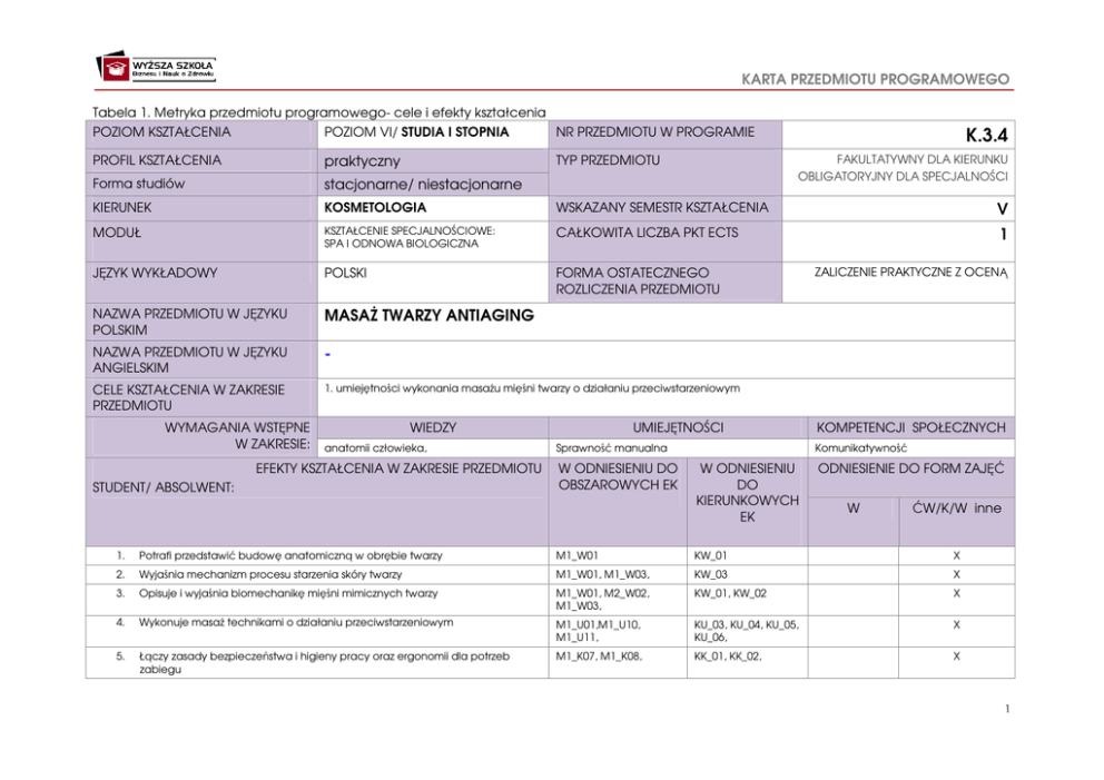 KARTA PRZEDMIOTU PROGRAMOWEGO Tabela 1. Metryka przedmiotu programowego- cele i efekty kształcenia POZIOM KSZTAŁCENIA POZIOM VI/ STUDIA I STOPNIA NR PRZEDMIOTU W PROGRAMIE K.3.4 FAKULTATYWNY DLA KIERUNKU OBLIGATORYJNY DLA SPECJALNOŚCI PROFIL KSZTAŁCENIA praktyczny Forma studiów stacjonarne/ niestacjonarne KIERUNEK KOSMETOLOGIA WSKAZANY SEMESTR KSZTAŁCENIA V MODUŁ KSZTAŁCENIE SPECJALNOŚCIOWE: SPA I ODNOWA BIOLOGICZNA CAŁKOWITA LICZBA PKT ECTS 1 JĘZYK WYKŁADOWY POLSKI FORMA OSTATECZNEGO ROZLICZENIA PRZEDMIOTU NAZWA PRZEDMIOTU W JĘZYKU POLSKIM MASAŻ TWARZY ANTIAGING NAZWA PRZEDMIOTU W JĘZYKU ANGIELSKIM - CELE KSZTAŁCENIA W ZAKRESIE PRZEDMIOTU 1. umiejętności wykonania masażu mięśni twarzy o działaniu przeciwstarzeniowym WYMAGANIA WSTĘPNE W ZAKRESIE: TYP PRZEDMIOTU WIEDZY anatomii człowieka, EFEKTY KSZTAŁCENIA W ZAKRESIE PRZEDMIOTU STUDENT/ ABSOLWENT: UMIEJĘTNOŚCI Sprawność manualna W ODNIESIENIU DO OBSZAROWYCH EK ZALICZENIE PRAKTYCZNE Z OCENĄ KOMPETENCJI SPOŁECZNYCH Komunikatywność W ODNIESIENIU DO KIERUNKOWYCH EK KW_01 ODNIESIENIE DO FORM ZAJĘĆ W ĆW/K/W inne 1. Potrafi przedstawić budowę anatomiczną w obrębie twarzy M1_W01 X 2. Wyjaśnia mechanizm procesu starzenia skóry twarzy M1_W01, M1_W03, KW_03 X 3. Opisuje i wyjaśnia biomechanikę mięśni mimicznych twarzy M1_W01, M2_W02, M1_W03, KW_01, KW_02 X 4. Wykonuje masaż technikami o działaniu przeciwstarzeniowym M1_U01,M1_U10, M1_U11, KU_03, KU_04, KU_05, KU_06, X 5. Łączy zasady bezpieczeństwa i higieny pracy oraz ergonomii dla potrzeb zabiegu M1_K07, M1_K08, KK_01, KK_02, X 1 KARTA PRZEDMIOTU PROGRAMOWEGO Tabela 2. Walidacja i weryfikacja efektów kształcenia EFEKTY KSZTAŁCENIA- student Formy prezentacji EK Poziomy osiągnięcia EK i odpowiadające im oceny ndst (2) dst (3) db (4) bdb (5) 1. Potrafi przedstawić budowę anatomiczną w obrębie twarzy Ćwiczenia: ustnie i praktycznie wymienienie i przedstawienie topografii mięśni twarzy Popełnia błędy w przedstawianiu struktur anatomicznych w obrębie twarzy Prawidłowo ale bardzo wąsko przedstawia struktury anatomiczne w obrębie twarzy Prawidłowo i dość obszernie przedstawia struktury anatomiczne w obrębie twarzy, Prawidłowo i wyczerpująco przedstawia struktury anatomicznych w obrębie twarzy 2. Wyjaśnia mechanizm procesu starzenia skóry twarzy Ćwiczenia: ustne wyjaśnia mechanizm starzenia skóry Popełnia błędy w opisie procesu starzenia skóry Prawidłowo ale bardzo wąsko przedstawia mechanizm starzenia skóry Prawidłowo ale bardzo wąsko mechanizm starzenia skóry Prawidłowo i wyczerpująco przedstawia mechanizm starzenia skóry 3. Opisuje i wyjaśnia biomechanikę mięśni mimicznych twarzy Ćwiczenia: ustne wyjaśnia biomechanikę poszczególnych mięśni twarzy Popełnia błędy w opisie biomechaniki mięśni twarzy Prawidłowo ale bardzo wąsko przedstawia biomechanikę mięśni twarzy Prawidłowo ale bardzo wąsko mechanizm biomechaniki mięśni twarzy Prawidłowo i wyczerpująco przedstawia biomechanikę mięśni twarzy 4. Wykonuje masaż technikami o działaniu przeciwstarzeniowym Ćwiczenia: praktyczne wykonanie masażu Popełnia błędy w trakcie masażu twarzy Prawidłowo wykonuje zabieg masażu twarzy z niewielkimi błędami Prawidlowo wykonuje zabieg masażu twarzy Prawidłowo wykonuje zabieg masażu twarzy i wyjaśnia 5. Łączy zasady bezpieczeństwa i higieny pracy oraz ergonomii dla potrzeb zabiegu Ćwiczenia: praktyczne wykonanie masażu z uwzględnieniem zasad bhp Popełnia błędy w bhp w trakcie wykonywania zabiegu masażu Przestrzega przepisy bhp w trakcie wykonywania zabiegu masażu Przestrzega przepisy bhp i zasady ergonomii w trakcie wykonywania zabiegu Przestrzega przepisy bhp i zasady ergonomii w trakcie wykonywania zabiegu dostosowuje je dla potrzeb klienta 2 KARTA PRZEDMIOTU PROGRAMOWEGO Tabela 3 A. Treści kształcenia według form zajęć i liczby godzin dla studiów stacjonarnych LICZBA GODZIN WG FORM ZAJĘĆ Treści kształcenia według formy zajęć i liczby godzin w kontakcie z prowadzącym 1. Zasady bhp i ergonomia stanowiska pracy 2. Budowa skóry i topografia anatomiczna twarzy 3. Charakterystyka i biomechanika mięśni mimicznych twarzy 4. Wykonywanie sprężystego odkształcania tkanek w obrębie twarzy za pomocą oklepywania i wstrząsania Wykonanie masażu antyagin twarzy 5. 6. WYKŁAD ĆWICZENIA WARSZTAT INNE 1 2 3 Wykonywanie sprężystego odkształcania tkanek w obrębie twarzy za pomocą głaskania rozcierania i ugniatanie 3 3 i 3 ŁĄCZNIE GODZIN WG FORM ZAJĘĆ RAZEM GODZIN ZAJĘĆ 15 15 3 KARTA PRZEDMIOTU PROGRAMOWEGO Tabela 3 B. Treści kształcenia według form zajęć i liczby godzin dla studiów niestacjonarnych LICZBA GODZIN WG FORM ZAJĘĆ Treści kształcenia według formy zajęć i liczby godzin w kontakcie z prowadzącym WYKŁAD ĆWICZENIA 1. Zasady bhp i ergonomia stanowiska pracy 1 2. Budowa skóry i topografia anatomiczna twarzy 1 3. Charakterystyka i biomechanika mięśni mimicznych twarzy 2 4. Wykonywanie sprężystego odkształcania tkanek w obrębie twarzy za pomocą głaskania i rozcierania i ugniatanie 5. Wykonywanie sprężystego odkształcania tkanek w obrębie twarzy za pomocą głaskania i rozcierania i ugniatanie 6. Wykonanie masażu antyaging twarzy 2 INNE 2 2 ŁĄCZNIE GODZIN WG FORM ZAJĘĆ RAZEM GODZIN ZAJĘĆ WARSZTAT 10 10 Tabela 4. Końcowa walidacja efektów kształcenia METODA KOŃCOWEJ OCENY EFEKTÓW KSZTAŁCENIA DLA FORM ZAJĘĆ WYKŁAD WARSZTAT ĆWICZENIA Praktyczne wykonanie zabiegu - INNE - 4 KARTA PRZEDMIOTU PROGRAMOWEGO Tabela 5 A. Nakład pracy studenta- rozliczenie punktów ECTS dla przedmiotu dla studiów stacjonarnych FORMA AKTYWNOŚCI STUDENTA LICZBA GODZIN ODPOWIADAJĄCA JEJ LICZNA PUKTÓW ECTS (szacowana dla EK; obliczamy dzieląc liczbę godzin przez 25) Liczba godzin wykładów w kontakcie z prowadzącym zajęcia 15 0,6 Samodzielne czytanie wskazanej literatury 4 0,1 Przygotowanie do zajęć (wykonywanie zlecanych zadań)