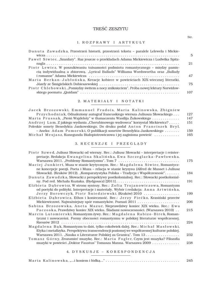 TREŚĆ ZESZYTU Str. 1. R O Z P R A W Y I ARTYKUŁY D a n u t a Z a w a d z k a, Przestrzeń historii, przestrzeń tekstu – paralele Lelewela i Mickie wicza . . . . . . . . . . . . . . . . . . . . . . . . . . . . . . . . . . . . . . . . . . . . . . . . . . . . . . . . . . . . . . . P a w e ł S i w i e c, „Szanfary”. Raz jeszcze o przekładach Adama Mickiewicza i Ludwika Spitz nagla . . . . . . . . . . . . . . . . . . . . . . . . . . . . . . . . . . . . . . . . . . . . . . . . . . . . . . . . . . . . . . . P i o t r L e w i c z, W poszukiwaniu tożsamości podmiotu romantycznego – między pamięcią indywidualną a zbiorową. „Lyrical Ballads” Williama Wordswortha oraz „Ballady i romanse” Adama Mickiewicza . . . . . . . . . . . . . . . . . . . . . . . . . . . . . . . . . . . . . . . . . . . M a r i a B e r k a n - J a b ł o ń s k a, Kreacje kobiece w powieściach XIX-wiecznej literatki, Józefy ze Śmigielskich Dobieszewskiej . . . . . . . . . . . . . . . . . . . . . . . . . . . . . . . . . . . . . . P i o t r C h l e b o w s k i, „Pomiędzy świtem a nocy zniknięciem”. Próba nowej lektury Norwidow skiego poematu „Quidam” . . . . . . . . . . . . . . . . . . . . . . . . . . . . . . . . . . . . . . . . . . . . . . . 2. M A T E R I A Ł Y I I 21 47 75 107 NOTATKI J a c e k B r z o z o w s k i, E m m a n u e l F r a d o i s, M a r i a K a l i n o w s k a, Z b i g n i e w P r z y c h o d n i a k, Odnaleziony autograf francuskiego wiersza Juliusza Słowackiego . . . M a r i a P r u s s a k, „Pieśń Wajdeloty” w tłumaczeniu Wasilija Żukowskiego . . . . . . . . . . . . . A n d r z e j L a m, Z jakiego wydania „Cherubinowego wędrowca” korzystał Mickiewicz? . . . . Poleskie sonety Benedykta Jankowskiego. Do druku podał A n t o n F r a n c i s z e k B r y l. – Aneks: A d a m P o m o r s k i, O publikacji sonetów Benedykta Jankowskiego . . . . . . . M i c h a ł M e s j a s z, Kunegunda Białopiotrowiczowa i jej zaginiona powieść . . . . . . . . . . . . 3. R E C E N Z J E 5 127 147 151 159 165 PRZEGLĄDY P i o t r S z w e d, Juliusz Słowacki od wierszy. Rec.: Juliusz Słowacki – interpretacje i reinterpretacje. Redakcja E w a n g e l i n a S k a l i ń s k a, E w a S z c z e g l a c k a - P a w ł o w s k a. Warszawa 2011. „Problemy Romantyzmu”. Tom 7 . . . . . . . . . . . . . . . . . . . . . . . . . . . . . M a c i e j J u n k i e r t, Muza w stanie krytycznym. Rec.: M a g d a l e n a S i w i e c, Romantyczne koncepcje poezji. Poeta i Muza – relacja w stanie kryzysu (Alfred de Musset i Juliusz Słowacki). (Kraków 2012). „Komparatystyka Polska – Tradycja i Współczesność” . . . . . . D a n u t a Z a w a d z k a, Słowacki z perspektywy postkolonialnej. Rec.: Słowacki postkolonial ny. Pod red. Michała Kuziaka. (Bydgoszcz) [2011] . . . . . . . . . . . . . . . . . . . . . . . . . . . . . E l ż b i e t a D ą b r o w i cz, W stronę syntezy. Rec.: Z o f i a T r o j a n o w i c z o w a, Romantyzm od poetyki do polityki. Interpretacje i materiały. Wybór i redakcja: A n n a A r t w i ń s k a, J e r z y B o r o w c z y k, P i o t r Ś n i e d z i e w s k i. (Kraków) 2010 . . . . . . . . . . . . . . . . . E l ż b i e t a D ą b r o w i c z, Ethos i konieczność. Rec.: J e r z y F i e ć k o, Krasiński przeciw Mickiewiczowi. Najważniejszy spór romantyków. Poznań 2011 . . . . . . . . . . . . . . . . . . . . S a b i n a B r z o z o w s k a, A n e t a M a z u r, Nieprawdziwy koniec XIX wieku. Rec.: E w a P a c z o s k a, Prawdziwy koniec XIX wieku. Śladami nowoczesności. (Warszawa 2010) . . M a r c i n L u t o m i e r s k i, Romantyzm żywy. Rec.: M a g d a l e n a R a b i z o - B i r e k, Romantyczni i nowocześni. Formy obecności romantyzmu w polskiej literaturze współczesnej. Rzeszów 2012 . . . . . . . . . . . . . . . . . . . . . . . . . . . . . . . . . . . . . . . . . . . . . . . . . . . . . . . . M a g d a l e n a B ą k, Romantyzm to dziś, tylko cokolwiek dalej. Rec.: M i c h a ł M a s ł o w s k i, Etyka i metafizyka. Perspektywa transcendencji poziomej we współczesnej kulturze polskiej. Warszawa 2011. „Nauka o Literaturze Polskiej za Granicą”. Tom 13 . . . . . . . . . . . . . . . T o m a s z G ó r n y, Zrozumieć muzykę. Rec.: M a r i a F o g l e r, Czym jest muzyka? Filozofia muzyki w powieści „Doktor Faustus” Tomasza Manna. Warszawa 2009 . . . . . . . . . . . . . 175 184 191 199 206 215 224 232 238 4. D Y S K U S J E – K O R E S P O N D E N C J A M a r i a K a l i n o w s k a, „...i koniem i łódką...” . . . . . . . . . . . . . . . . . . . . . . . . . . . . . . . . . . . 245 CONTENTS OF THE FASCICLE Page I. T R E A T I S E S AND ARTICLES D a n u t a Z a w a d z k a, Space of History, Space of Text – Mickiewicz’s and Lelewel’s Parallels P a w e ł S i w i e c, “Szanfary”. Once again on Adam Mickiewicz’s and Ludwik Spitznagel’s Translations . . . . . . . . . . . . . . . . . . . . . . . . . . . . . . . . . . . . . . . . . . . . . . . . . . . . . . . . . P i o t r L e w i c z, In Search for Romantic Subject Identity – between Collective and Individual Memory. William Wordsworth’s “Lyrical Ballads” and Adam Mickiewicz’s “Ballady i ro manse” (“Ballads and Romances”) . . . . . . . . . . . . . . . . . . . . . . . . . . . . . . . . . . . . . . . . . M a r i a B e r k a n - J a b ł o ń s k a, Female Creations in the Novels by a 19th Woman of Letters, Józefa Dobieszewska, Née Śmigielska . . . . . . . . . . . . . . . . . . . . . . . . . . . . . . . . . . . . . . P i o t r C h l e b o w s k i, “Between the dawn and night’s vanishing”. An Attempt at a New Reading of Norwid’s Poem “Quidam” . . . . . . . . . . . . . . . . . . . . . . . . . . . . . . . . . . . . . . . . . . . . . . 2. M A T E R I A L S AND 5 21 47 75 107 NOTES J a c e k B r z o z o w s k i, E m m a n u e l F r a d o i s, M a r i a K a l i n o w s k a, Z b i g n i e w P r z y c h o d n i a k, A Re
