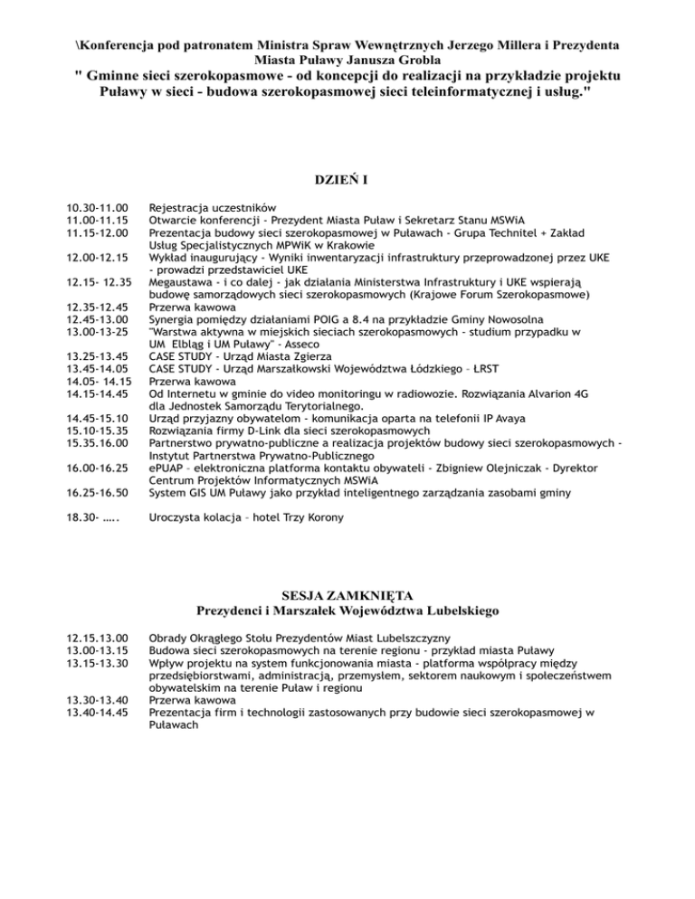 \Konferencja pod patronatem Ministra Spraw Wewnętrznych Jerzego Millera i Prezydenta Miasta Puławy Janusza Grobla " Gminne sieci szerokopasmowe - od koncepcji do realizacji na przykładzie projektu Puławy w sieci - budowa szerokopasmowej sieci teleinformatycznej i usług." DZIEŃ I 10.30-11.00 11.00-11.15 11.15-12.00 16.25-16.50 Rejestracja uczestników Otwarcie konferencji - Prezydent Miasta Puław i Sekretarz Stanu MSWiA Prezentacja budowy sieci szerokopasmowej w Puławach - Grupa Technitel + Zakład Usług Specjalistycznych MPWiK w Krakowie Wykład inaugurujący - Wyniki inwentaryzacji infrastruktury przeprowadzonej przez UKE - prowadzi przedstawiciel UKE Megaustawa - i co dalej - jak działania Ministerstwa Infrastruktury i UKE wspierają budowę samorządowych sieci szerokopasmowych (Krajowe Forum Szerokopasmowe) Przerwa kawowa Synergia pomiędzy działaniami POIG a 8.4 na przykładzie Gminy Nowosolna "Warstwa aktywna w miejskich sieciach szerokopasmowych - studium przypadku w UM Elbląg i UM Puławy" - Asseco CASE STUDY - Urząd Miasta Zgierza CASE STUDY - Urząd Marszałkowski Województwa Łódzkiego – ŁRST Przerwa kawowa Od Internetu w gminie do video monitoringu w radiowozie. Rozwiązania Alvarion 4G dla Jednostek Samorządu Terytorialnego. Urząd przyjazny obywatelom - komunikacja oparta na telefonii IP Avaya Rozwiązania firmy D-Link dla sieci szerokopasmowych Partnerstwo prywatno-publiczne a realizacja projektów budowy sieci szerokopasmowych Instytut Partnerstwa Prywatno-Publicznego ePUAP – elektroniczna platforma kontaktu obywateli - Zbigniew Olejniczak - Dyrektor Centrum Projektów Informatycznych MSWiA System GIS UM Puławy jako przykład inteligentnego zarządzania zasobami gminy 18.30- ….. Uroczysta kolacja – hotel Trzy Korony 12.00-12.15 12.15- 12.35 12.35-12.45 12.45-13.00 13.00-13-25 13.25-13.45 13.45-14.05 14.05- 14.15 14.15-14.45 14.45-15.10 15.10-15.35 15.35.16.00 16.00-16.25 SESJA ZAMKNIĘTA Prezydenci i Marszałek Województwa Lubelskiego 12.15.13.00 13.00-13.15 13.15-13.30 13.30-13.40 13.40-14.45 Obrady Okrągłego Stołu Prezydentów Miast Lubelszczyzny Budowa sieci szerokopasmowych na terenie regionu - przykład miasta Puławy Wpływ projektu na system funkcjonowania miasta - platforma współpracy między przedsiębiorstwami, administracją, przemysłem, sektorem naukowym i społeczeństwem obywatelskim na terenie Puław i regionu Przerwa kawowa Prezentacja firm i technologii zastosowanych przy budowie sieci szerokopasmowej w Puławach DZIEŃ II 10.00-10.20 10.25-11.05 Puławski Park Naukowo-Technologiczny jako odbiorca gminnego szerokopasmowego Internetu - Dyrektor Puławskiego Parku Naukowo-Technologicznego - Piotr Michalski Modele zarządzania infrastrukturą i rola Operatora Infrastrukturalnego w procesie Infratel (Stowarzyszenie Budowniczych Telekomunikacji) 11.1-11.25 Modele kosztowo-przychodowe samorządowej sieci szerokopasmowej – dr Krzysztof Heller (Infostrategia) 11.30-12.00 12.05-12-35 Internet prosto z nieba – szybki Internet satelitarny - Polska Izba Radiodyfuzji Cyfrowej Światłowodowe sieci szerokopasmowe - od szkieletu po dostęp FTTH. Rozwiązania techniczne i demonstracja wdmuchiwania światłowodu w systemie mikrokanalizacji. (Akademia Światłowodowa FCA) Prezentacja technologii układania światłowodów w kanalizacji sanitarnej - STAR Obiad - Weterynaryjne Centrum Kształcenia Podyplomowego 13.00-14.00 14.30-15.00 NOCLEGI w Hotelach: Hotel Prima 24-100 Puławy, al. Partyzantów 44 TRZY KORONY 24-100 Puławy, ul. 6 sierpnia 43 b Projekt pn. „Puławy w sieci – budowa szerokopasmowej sieci teleinformatycznej i usług” dofinansowany z Europejskiego Funduszu Rozwoju Regionalnego w ramach Regionalnego Programu Operacyjnego Województwa Lubelskiego na lata 2007-2013, Oś Priorytetowa IV Społeczeństwo informacyjne, Działanie 4.1 Społeczeństwo informacyjne, kategoria I: Infrastruktura teleinformatyczna oraz system usług na poziomie regionalnym.