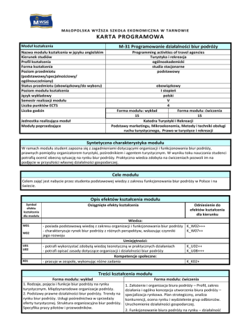 M AŁ O PO L S K A WYŻ SZ A S ZK OŁ A E K ON OM I CZN A W TA RN O WI E KARTA PROGRAMOWA Moduł kształcenia M-31 Programowanie działalności biur podróży Nazwa modułu kształcenia w języku angielskim Kierunek studiów Profil kształcenia Forma kształcenia Poziom przedmiotu (podstawowy/specjalnościowy/ ogólnouczelniany) Status przedmiotu (obowiązkowy/do wyboru) Poziom modułu kształcenia Język wykładowy Semestr realizacji modułu Liczba punktów ECTS Liczba godzin Jednostka realizująca moduł Moduły poprzedzające Programming activities of travel agencies Turystyka i rekreacja ogólnoakademicki studia stacjonarne podstawowy obowiązkowy I stopień polski V 4 Forma modułu: wykład Forma modułu: ćwiczenia 15 15 Katedra Turystyki i Rekreacji Podstawy marketingu, Mikroekonomia, Metody i techniki obsługi ruchu turystycznego, Prawo w turystyce i rekreacji Syntetyczna charakterystyka modułu W ramach modułu student zapozna się z zagadnieniami dotyczącymi organizacji i funkcjonowania biur podróży, prawnych pomiędzy organizatorem turystyki, pośrednikiem i agentem turystycznym. W wyniku toku nauczania studenci potrafią ocenić obecną sytuację na rynku biur podróży. Praktyczna wiedza zdobyta na ćwiczeniach pozwoli im na podjęcie w przyszłości własnej działalności gospodarczej. Cele modułu Celem zajęć jest nabycie przez studenta podstawowej wiedzy z zakresu funkcjonowania biur podróży w Polsce i na świecie. Opis efektów kształcenia modułu Symbol efektu kształcenia dla modułu W01 W02 U01 U02 K01 Osiągnięte efekty kształcenia Odniesienie do efektów kształcenia dla kierunku Wiedza: - posiada podstawową wiedzę z zakresu organizacji i funkcjonowania biur podróży - charakteryzuje rynek biur podróży z różnych perspektyw, wskazując czynniki jego rozwoju Umiejętności: - potrafi wykorzystać zdobytą wiedzę teoretyczną w praktycznych działaniach - potrafi opisać zasady dotyczące organizacji i działalności biur podróży Kompetencje społeczne: - pracuje w zespole, wykonując różne zadania K_W02+++ K_W07++ K_U02++ K_U08+++ K_K02+ Treści kształcenia modułu Forma modułu: wykład 1. Rodzaje, pojęcia i funkcje biur podróży na rynku turystycznym. Międzynarodowe organizacje podróży. 2. Podstawy prawne działalności biur podróży. Trendy na rynku biur podróży. Usługi pośrednictwa w sprzedaży oferty turystycznej. Struktura organizacyjna biur podróży. Specyfika pracy pilotów i przewodników. Forma modułu: ćwiczenia 1. Założenie i organizacja biura podróży – Profil, zakres działania i ogólna koncepcja utworzenia biura podróży – specjalizacja rynkowa. Plan strategiczny, analiza konkurencji, ocena rynku i wydzielenie grup odbiorców. Uruchomienie działalności gospodarczej. 2. Funkcjonowanie biura podróży na rynku – działalność 3. Biura podróży w Polsce. Czynniki zewnętrzne wpływające na funkcjonowanie biur podróży. Rozwój nowoczesnych technologii. Partnerstwo, sieci współpracy. Kontrola działalności. Badania konkurencji. 4. Produkt turystyczny w działalności biur podróży, Pakiety turystyczne. Jakość usług. Promocja i dystrybucja oferty turystycznej. Internetowe systemy sprzedaży oferty. Literatura podstawowa Literatura uzupełniająca marketingowa Zasady tworzenia ofert turystycznych. Pakiety podstawowe i poszerzone. Wizualizacja oferty turystycznej. Działalność promocyjna biura podróży. Kanały dystrybucji. Konieczna-Domańska A.., Biura podróży na rynku turystycznym, Wyd. PWN, Warszawa 2008. Michalska-Dudek I., Przeorek-Smyka R., Marketing biur podróży, Wyd. C.H.Beck, Warszawa 2010. aktualne opracowania, artykuły dotyczące rynku biur podróży (strony ministerialne, czasopisma branżowe itd.) Metody dydaktyczne podające (wykład, opis, objaśnienie), problemowe (metoda przypadków), praktyczne (projekt, ćwiczenia przedmiotowe)