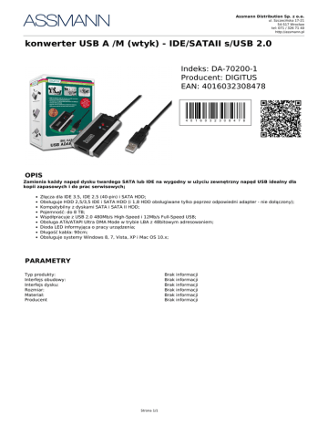 Assmann Distribution Sp. z o.o. ul. Szczecińska 17-21 54-517 Wrocław tel: 071 / 326 71 40 http://assmann.pl konwerter USB A /M (wtyk) - IDE/SATAII s/USB 2.0 Indeks: DA-70200-1 Producent: DIGITUS EAN: 4016032308478 4 0 1 6 0 3 2 3 0 8 4 7 8 OPIS Zamienia każdy napęd dysku twardego SATA lub IDE na wygodny w użyciu zewnętrzny napęd USB idealny dla kopii zapasowych i do prac serwisowych; Złącza dla IDE 3.5, IDE 2.5 (40-pin) i SATA HDD; Obsługuje HDD 2,5/3,5 IDE i SATA HDD (i 1,8 HDD obsługiwane tylko poprzez odpowiedni adapter - nie dołączony); Kompatybilny z dyskami SATA i SATA II HDD; Pojemność: do 8 TB; Współpracuje z USB 2.0 480Mb/s High-Speed i 12Mb/s Full-Speed USB; Obsługa ATA/ATAPI Ultra DMA Mode w trybie LBA z 48bitowym adresowaniem; Dioda LED informyjąca o pracy urządzenia; Długość kabla: 90cm; Obsługuje systemy Windows 8, 7, Vista, XP i Mac OS 10.x; PARAMETRY Typ produkty: Interfejs obudowy: Interfejs dysku: Rozmiar: Materiał: Producent Brak Brak Brak Brak Brak Brak Strona 1/1 Powered by TCPDF (www.tcpdf.org) informacji informacji informacji informacji informacji informacji