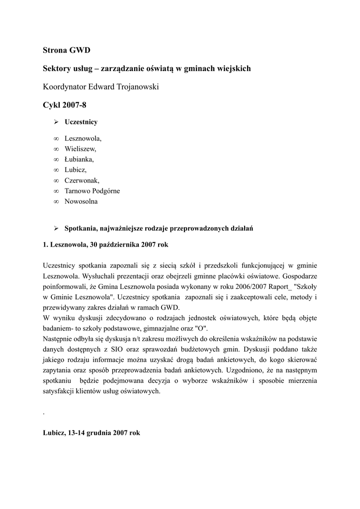 Strona GWD Sektory usług – zarządzanie oświatą w gminach wiejskich Koordynator Edward Trojanowski Cykl 2007-8 Uczestnicy • • • • • • • Lesznowola, Wieliszew, Łubianka, Lubicz, Czerwonak, Tarnowo Podgórne Nowosolna Spotkania, najważniejsze rodzaje przeprowadzonych działań 1. Lesznowola, 30 października 2007 rok Uczestnicy spotkania zapoznali się z siecią szkół i przedszkoli funkcjonującej w gminie Lesznowola. Wysłuchali prezentacji oraz obejrzeli gminne placówki oświatowe. Gospodarze poinformowali, że Gmina Lesznowola posiada wykonany w roku 2006/2007 Raport_ "Szkoły w Gminie Lesznowola". Uczestnicy spotkania zapoznali się i zaakceptowali cele, metody i przewidywany zakres działań w ramach GWD. W wyniku dyskusji zdecydowano o rodzajach jednostek oświatowych, które będą objęte badaniem- to szkoły podstawowe, gimnazjalne oraz "O". Następnie odbyła się dyskusja n/t zakresu możliwych do określenia wskaźników na podstawie danych dostępnych z SIO oraz sprawozdań budżetowych gmin. Dyskusji poddano także jakiego rodzaju informacje można uzyskać drogą badań ankietowych, do kogo skierować zapytania oraz sposób przeprowadzenia badań ankietowych. Uzgodniono, że na następnym spotkaniu będzie podejmowana decyzja o wyborze wskaźników i sposobie mierzenia satysfakcji klientów usług oświatowych. . Lubicz, 13-14 grudnia 2007 rok Spotkanie miało za cel ustalenie ostatecznego kształtu ankiet do badania zadowolenia mieszkańców (uczniów i rodziców) gminy z usług oświatowych dostarczanych przez samorządy gminne oraz metodologii przeprowadzania ankietyzacji. Prace grupy były wspomagane przez Kierownika projektu Tomasza Potkańskiego oraz zaproszonego eksperta zewnętrznego Andrzeja Perego. Efektem spotkania było wypracowanie ostatecznej wersji dwóch ankiet do badania poziomu zadowolenia; jednej skierowanej do rodziców; drugiej skierowanej do uczniów. Na spotkaniu wstępnie ustalono, że ankietyzacja uczniów nastąpi bezpośrednio w szkole poprzez wypełnienie ankiet przez uczniów na stronie internetowej ZMP, natomiast pozyskanie opinii rodziców nastąpi podczas szkolnych wywiadówek poprzez wypełnienie papierowych formularzy ankiet. W przerwie spotkania uczestnicy odwiedzili dwie placówki oświatowe w gminie Lubicz. 3. Tarnowo Podgórne, 28-29 lutego 2008 roku Uczestnicy spotkania podzielili się na wstępie swoimi uwagami i występującymi problemami, jakie zdarzały się w trakcie wypełniania ankiet przez rodziców podczas zebrań rodzicielskich przed feriami zimowymi. Udział w ankietyzacji wzięło dużo więcej rodziców i uczniów niż zakładano w projekcie, bo nie 30% a ponad 60% populacji. Dzięki temu wyniki badań ankietowych są bardziej wiarygodne. Ekspert, pani Krystyna Jasińska- socjolog, pedagog, pracownik zarządu oświaty UM Myszków przedstawiła szczegółową analizę wyników ankiet, opierając się na danych tabelarycznych ze wszystkich gmin, szkół, ze strony rodziców i dzieci. Pani ekspert omówiła również sposób analizowania tych wyników od strony socjologicznej, aby każda gmina mogła dokonać prawidłowej analizy, porównań szkół oraz ocenić stan faktyczny szanse i zagrożenia. W przerwie spotkania Dyrektor Gimnazjum w Baranowie zaprezentował uczestnikom sposób zarządzania oświatą w Gminie Tarnowo-Podgórne oraz piękną, przestronną szkołę na 18 oddziałów (obecnie 320 dzieci). Mariusz Tobor - ekspert, pracownik firmy „Vulcan” przedstawił analizę wyników obliczeń wskaźników dotyczących oświaty w poszczególnych gminach objętych badaniem na tle podobnych wskaźników w różnych typach szkół w miastach, miasto- gminach, gminach wiejskich i powiatach. W końcowej części spotkania ustalono, ze podczas następnego spotkania grupy, które odbędzie się w II połowie kwietnia każda gmina przedstawi analizę wyników ankiet, które wcześniej będą przedyskutowane z dyrektorami szkół oraz nauczycielami. Uczestnicy potwierdzili chęć przeprowadzenia ankietyzacji w oddziałach zerowych i przedszkolach. Ustalono, że ankieta zostanie rozesłana w następnych tygodniach do gmin i zostanie uruchomiony proces ich wypełniania 4. Czerwonak, 24-25 kwietnia 2008 rok W wieczornym spotkaniu w dniu 24 kwietnia 2008 roku członkowie GWD spotkali się z przedstawicielami gminy Czerwonak. Wójt Gminy Czerwonak Mariusz Poznański przedstawił uczestnikom spotkania gminę oraz jej zasoby bazy oświatowej. Następnego dnia obyło się spotkanie merytoryczne grupy poświecone wnioskom z analizy badania ankietowego poziomu zadowolenia z usług oświatowych w poszczególnych gminach oraz wypracowaniu propozycji usprawnień związanych z zarządzaniem oświata w gminach. Na bazie przygotowanej przez specjalistę ZGW RP prezentacji porównawczej wyników ankiet przedstawiciele gmin zaprezentowali wnioski nt funkcjonowania jednostek oświatowych w ich gminach. Podczas dyskusji wymieniano się doświadczeniami w zakresie podjętych działań usprawniających efektywność procesu dydaktycznego i wychowawczego w placówkach szkolnych. Po prezentacji wniosków i dyskusji Koordynator grupy przedstawił zebranym schemat raportu końcowego, który ma być końcowym efektem prac poszczególnych zespołów gminnych w zakresie wypracowania propozycji usprawnień w zakresie poprawy zarządzania oświatą przez organy prowadzące szkoły.. 5. Łubianka, 29-20 maja 2008 rok Spotkanie robocze poprzedzone było wizytacją placówek oświatowych na terenie gminy Łubianka. Na spotkaniu w siedzibie gminy Łubianka Wójt Gminy Łubianka zaprezentował gminę i gminną infrastrukturę oświatowej. Następnie specjalista ZGW RP zaprezentował analizę porównawczą badania ankietowego poziomu zadowolenia zrealizowanego wśród rodziców przedszkoli i zerówek. Analiza porównawcza wykonana została na podstawie 1062 ankiet obejmująca ponad 90% rodziców badanych placówek z 7 samorządów. Po dysku
