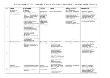 TRYB PRZEPROWADZANIA CZYNNOŚCI W PRZEWODACH DOKTORSKICH W POLITECHNICE WROCŁAWSKIEJ *) Lp. Kroki procedury Wymagania formalne Forum Wynik Odpowiedzialny za wykonanie Dokumenty Seminarium poprzedzające wszczęcie przewodu doktorskiego Spis dokumentów: 1. Wniosek do Przewodniczącego Rady Jednostki Organizacyjnej (RJO) **} o wszczęcie przewodu doktorskiego z danej dziedziny i dyscypliny naukowej 2. Propozycja tematu i koncepcji pracy doktorskiej 3. Propozycja osoby promotora. 4. Życiorys doktoranta 5. Oryginał lub uwierzytelniony odpis dyplomu magistra, magistra inżyniera, lekarza lub równorzędny uczelni zagranicznych 6. Oświadczenie kandydata, czy uprzednio ubiegał się o nadanie stopnia doktora, i ewentualnie informacja o przebiegu poprzedniego przewodu doktorskiego 7. Warunku finansowania przewodu doktorskiego 8. Ewentualnie opinia samodzielnego pracownika nauki, 9. Wykaz prac naukowych 1. Pozytywna opinia Komisji Specjalistów 2. Zgoda osoby proponowanej na promotora na wyznaczenie go na promotora Komisja (Rady Jednostki Organizacyjnej) Specjalistów w dyscyplinie naukowej, w której został zaproponowany temat rozprawy, członkowie Rady Jednostki Organizacyjnej Opinia Komisji Specjalistów Przewodniczący Rady Jednostki Organizacyjnej - zawiadamia o terminie seminarium wszystkich członków Rady Jednostki Organizacyjnej (nie później niż 7 dni przed seminarium i co najmniej 14 dni przed posiedzeniem Rady Jednostki Organizacyjnej ) Przewodniczący Komisji Specjalistów przedstawia opinię 1. Informacja o seminarium przekazana członkom Rady Jednostki Organizacyjnej oraz o składzie Komisji Specjalistów przekazana członkom Rady Jednostki Organizacyjnej 2. Lista obecności na seminarium dla członków Komisji Specjalistów 3. Protokół Komisji Specjalistów Rada Jednostki Organizacyjnej Uchwały Rady Jednostki Organizacyjnej o: 1. Wszczęciu przewodu doktorskiego w danej dyscyplinie naukowej (oraz ustaleniu tematu i zatwierdzeniu koncepcji rozprawy doktorskiej) 2. Wyznaczeniu promotora 3. Przedstawieniu rozprawy doktorskiej i/lub przeprowadzeniu obrony Przewodniczący Rady Jednostki Organizacyjnej 1. Informacja o uchwałach Rady Jednostki Organizacyjnej przekazana do Uczelnianego Sekretariatu Studiów Doktoranckich PWr. oraz sekretariatu Wydziału w terminie 7 dni od ich podjęcia (dotyczy wszystkich przewodów wszczynanych w Jednostkach Organizacyjnych PWr.) Przewodniczący Rady Jednostki Organizacyjnej 1. Informacja o seminarium przekazana członkom Rady Jednostki Organizacyjnej i składzie Komisji Specjalistów przekazana członkom Rady Jednostki Organizacyjnej 2. Lista obecności na seminarium dla 1. Wszczęcie przewodu Doktorskiego 2. publicznej w języku obcym 1) oraz akceptacji trybu przyjęcia obrony i nadania stopnia doktora 4. Informacja o pokryciu kosztów przeprowadzenia przewodu doktorskiego 2 ) Seminarium poprzedzające złożenie pracy doktorskiej 3. 1. Przekazanie promotorowi jednego egzemplarza wstępnej wersji pracy doktorskiej 2. Opinia promotora rozprawy doktorskiej Komisja Specjalistów Rady Jednostki Organizacyjnej 1. Opinia Komisji Specjalistów 2. Propozycja składu Komisji Doktorskiej 3 ) 3. Propozycje recenzentów 4 ) 4. Propozycja składu Komisji Egzaminacyjnych 5) 4. Propozycja zakresu i terminu egzaminów doktorskich 6 ) Powołanie Komisji Doktorskiej 7} W skład Komisji Doktorskiej wchodzą wybrani członkowie Rady Jednostki Organizacyjnej posiadający tytuł profesora lub stopień doktora habilitowanego w zakresie danej lub pokrewnej dyscypliny naukowej oraz recenzenci rozprawy doktorskiej i promotor (promotorzy). Doktorant przedkłada promotorowi rozprawę w 5 egzemplarzach Rada Jednostki Organizacyjnej Uchwała Rady Jednostki Organizacyjnej o powołaniu Komisji Doktorskiej Przewodniczący Rady Jednostki Organizacyjnej Protokół Rady Jednostki Organizacyjnej Rada Jednostki Organizacyjnej Uchwała Rady Jednostki Organizacyjnej o wyznaczeniu Recenzentów Przewodniczący Rady Jednostki Organizacyjnej Określenie zakresu egzaminów doktorskich i powołanie Komisji Egzaminacyjnych 8 ) Wstępna zgoda osób powoływanych spoza członków Rady Jednostki Organizacyjnej Rada Jednostki Organizacyjnej Przewodniczący Rady Jednostki Organizacyjnej Egzaminy doktorskie 5 ) Ustalenie terminów egzaminów. Egzaminy doktorskie są zdawane przed przyjęciem rozprawy doktorskiej 6 ) Rada Jednostki Organizacyjnej i Komisje Egzaminacyjne Uchwała Rady Jednostki Organizacyjnej o określeniu zakresu egzaminów doktorskich i o powołaniu komisji przeprowadzających egzaminy w określonym zakresie Protokoły Komisji Egzaminacyjnych Protokół Rady Jednostki Organizacyjnej. Przekazanie egzemplarzy rozprawy doktorskiej wyznaczonym recenzentom Protokół Rady Jednostki Organizacyjnej określający: - zakres egzaminów doktorskich - skład komisji egzaminacyjnych - przewodniczących komisji Przyjęcie rozprawy doktorskiej i dopuszczenie jej do publicznej obrony 1. Recenzja lub recenzje zawierające wnioski o uzupełnienie i/lub poprawienie pracy 2. Pozytywne recenzje Rada Jednostki Organizacyjnej lub Komisja Doktorska 1. Przyjęcie recenzji – Rada Jednostki Organizacyjnej może uzależnić przyjęcie rozprawy od jej uprzedniego poprawienia lub uzupełnienia 9) Przewodniczący Rady Jednostki Organizacyjnej lub Przewodniczący Komisji Doktorskiej 4. Wyznaczenie 4a. 4b. recenzentów 4 ) 4c. Przewodniczący Komisji Egzaminacyjnych 1. Lista obecności na posiedzeniu członków Komisji Egzaminacyjnej Karty do głosowania 2. Protokoły Komisji Egzaminacyjnych Protokół Rady Jednostki Organizacyjnej lub Komisji Doktorskiej 2. Przyjęcia rozprawy doktorskiej i dopuszczenie jej do publicznej obrony, 3. Ustalenie terminu publicznej obrony 4. Nieprzyjęcie rozprawy doktorskiej i niedopuszczenie jej do publicznej obrony 5 Zawiadomienie o terminie obrony Wywieszone ogłoszenia na co najmniej 10 dni przed obroną z podaniem miejsca gdzie została złożona rozprawa doktorska, w c