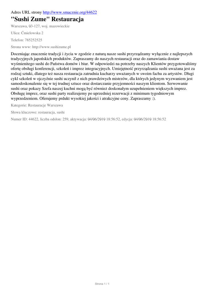 "Sushi Zume" Restauracja, Warszawa, Cmielowska 2