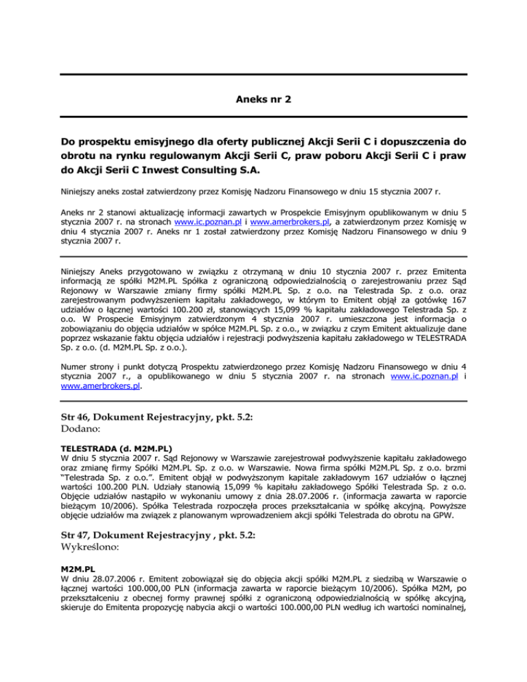 Aneks nr 2 Do prospektu emisyjnego dla oferty publicznej Akcji Serii C i dopuszczenia do obrotu na rynku regulowanym Akcji Serii C, praw poboru Akcji Serii C i praw do Akcji Serii C Inwest Consulting S.A. Niniejszy aneks został zatwierdzony przez Komisję Nadzoru Finansowego w dniu 15 stycznia 2007 r. Aneks nr 2 stanowi aktualizację informacji zawartych w Prospekcie Emisyjnym opublikowanym w dniu 5 stycznia 2007 r. na stronach www.ic.poznan.pl i www.amerbrokers.pl, a zatwierdzonym przez Komisję w dniu 4 stycznia 2007 r. Aneks nr 1 został zatwierdzony przez Komisję Nadzoru Finansowego w dniu 9 stycznia 2007 r. Niniejszy Aneks przygotowano w związku z otrzymaną w dniu 10 stycznia 2007 r. przez Emitenta informacją ze spółki M2M.PL Spółka z ograniczoną odpowiedzialnością o zarejestrowaniu przez Sąd Rejonowy w Warszawie zmiany firmy spółki M2M.PL Sp. z o.o. na Telestrada Sp. z o.o. oraz zarejestrowanym podwyŜszeniem kapitału zakładowego, w którym to Emitent objął za gotówkę 167 udziałów o łącznej wartości 100.200 zł, stanowiących 15,099 % kapitału zakładowego Telestrada Sp. z o.o. W Prospecie Emisyjnym zatwierdzonym 4 stycznia 2007 r. umieszczona jest informacja o zobowiązaniu do objęcia udziałów w spółce M2M.PL Sp. z o.o., w związku z czym Emitent aktualizuje dane poprzez wskazanie faktu objęcia udziałów i rejestracji podwyŜszenia kapitału zakładowego w TELESTRADA Sp. z o.o. (d. M2M.PL Sp. z o.o.). Numer strony i punkt dotyczą Prospektu zatwierdzonego przez Komisję Nadzoru Finansowego w dniu 4 stycznia 2007 r., a opublikowanego w dniu 5 stycznia 2007 r. na stronach www.ic.poznan.pl i www.amerbrokers.pl. Str 46, Dokument Rejestracyjny, pkt. 5.2: Dodano: TELESTRADA (d. M2M.PL) W dniu 5 stycznia 2007 r. Sąd Rejonowy w Warszawie zarejestrował podwyŜszenie kapitału zakładowego oraz zmianę firmy Spółki M2M.PL Sp. z o.o. w Warszawie. Nowa firma spółki M2M.PL Sp. z o.o. brzmi “Telestrada Sp. z o.o.”. Emitent objął w podwyŜszonym kapitale zakładowym 167 udziałów o łącznej wartości 100.200 PLN. Udziały stanowią 15,099 % kapitału zakładowego Spółki Telestrada Sp. z o.o. Objęcie udziałów nastąpiło w wykonaniu umowy z dnia 28.07.2006 r. (informacja zawarta w raporcie bieŜącym 10/2006). Spółka Telestrada rozpoczęła proces przekształcania w spółkę akcyjną. PowyŜsze objęcie udziałów ma związek z planowanym wprowadzeniem akcji spółki Telestrada do obrotu na GPW. Str 47, Dokument Rejestracyjny , pkt. 5.2: Wykreślono: M2M.PL W dniu 28.07.2006 r. Emitent zobowiązał się do objęcia akcji spółki M2M.PL z siedzibą w Warszawie o łącznej wartości 100.000,00 PLN (informacja zawarta w raporcie bieŜącym 10/2006). Spółka M2M, po przekształceniu z obecnej formy prawnej spółki z ograniczoną odpowiedzialnością w spółkę akcyjną, skieruje do Emitenta propozycję nabycia akcji o wartości 100.000,00 PLN według ich wartości nominalnej, a Inwest Consulting S.A. tę propozycję nabycia przyjmie. PowyŜsze zobowiązanie ma związek z planowanym wprowadzeniem akcji spółki M2M.PL do obrotu na GPW. Str. 48, Dokument Rejestracyjny, pkt. 5.2. Było: Tabela 3. Inwestycje kapitałowe Emitenta – dokonane i planowane (dane w tys. PLN). Wartość inwestycji w akcje/udziały dokonanej lub planowanej Technopark 2 Sp. z o.o.* 2.000 POZBUD T&R Sp. z o.o. 100 M2M.PL Sp. z o.o. 100 ROVITA S.A.. co najmniej 250 POLMAN Sp. z o.o. MAXIPIZZA S.A.** 100 SP. TELEINF. – zwolnienie 100 z publikacji nazwy PROFIL GROUP Sp. z o.o. 225 SUMA 2.875 Szacowany udział w kapitale zakładowym spółki*** 26,78 % < 10 % ok. 15 % < 10 % ok. 15 % < 10 % Szacunkowa wartość inwestycji w akcje objęte za warranty subskrypcyjne do 350 do 175 do 535 < 10 % do 1.060 *Udziały zostały nabyte 19.09.2006 r. **Spółka w fazie tworzenia *** Udział nie uwzględnia akcji, które w przyszłości będą mogły być objęte za warranty. Tabela 4. Wartość i szacunkowy termin planowanych inwestycji Emitenta w akcje/udziały Spółek – bez warrantów (dane w tys. PLN). Wartość inwestycji w akcje/udziały POZBUD T&R Sp. z o.o. 100 M2M.PL Sp. z o.o. 100 ROVITA S.A.* 250 – 1 500 MAXIPIZZA S.A.** 100 SP. TELEINF. – zwolnienie 100 z publikacji nazwy PROFIL GROUP Sp. z o.o. 225 SUMA 875 – 2 125 Szacunkowy czas inwestycji II kw. 2007 IV kw. 2006 I kw. 2007 I kw. 2007 I kw. 2007 I kw. 2007 * Przy szacowanym łącznym kapitale zakładowym w kwocie 15 mln PLN. **Spółka w fazie tworzenia Jest: Tabela 3. Inwestycje kapitałowe Emitenta – dokonane i planowane (dane w tys. PLN). Wartość inwestycji w akcje/udziały dokonanej lub planowanej Technopark 2 Sp. z o.o.* 2.000 POZBUD T&R Sp. z o.o. 100 TELESTRADA Sp. z o.o.* 100 ROVITA S.A.. co najmniej 250 POLMAN Sp. z o.o. MAXIPIZZA S.A.** 100 SP. TELEINF. – zwolnienie 100 z publikacji nazwy PROFIL GROUP Sp. z o.o. 225 SUMA 2.875 Szacowany udział w kapitale zakładowym spółki*** 26,78 % < 10 % ok. 15 % < 10 % ok. 15 % < 10 % Szacunkowa wartość inwestycji w akcje objęte za warranty subskrypcyjne do 350 do 175 do 535 < 10 % - *Udziały zostały nabyte/objęte **Spółka w fazie tworzenia *** Udział nie uwzględnia akcji, które w przyszłości będą mogły być objęte za warranty. do 1.060 Tabela 4. Wartość i szacunkowy termin planowanych inwestycji Emitenta w akcje/udziały Spółek – bez warrantów (dane w tys. PLN). Wartość inwestycji w akcje/udziały POZBUD T&R Sp. z o.o. 100 ROVITA S.A.* 250 – 1 500 MAXIPIZZA S.A.** 100 SP. TELEINF. – zwolnienie 100 z publikacji nazwy PROFIL GROUP Sp. z o.o. 225 SUMA 775 – 2 025 Szacunkowy czas inwestycji II kw. 2007 I kw. 2007 I kw. 2007 I kw. 2007 I kw. 2007 * Przy szacowanym łącznym kapitale zakładowym w kwocie 15 mln PLN. **Spółka w fazie tworzenia Str. 55, Dokument Rejestracyjny, pkt. 6: Było: Tabela 8. Inwestycje kapitałowe Emitenta – dokonane i planowane (dane w tys. PLN). Wartość inwestycji w akcje/udziały dokonanej lub p