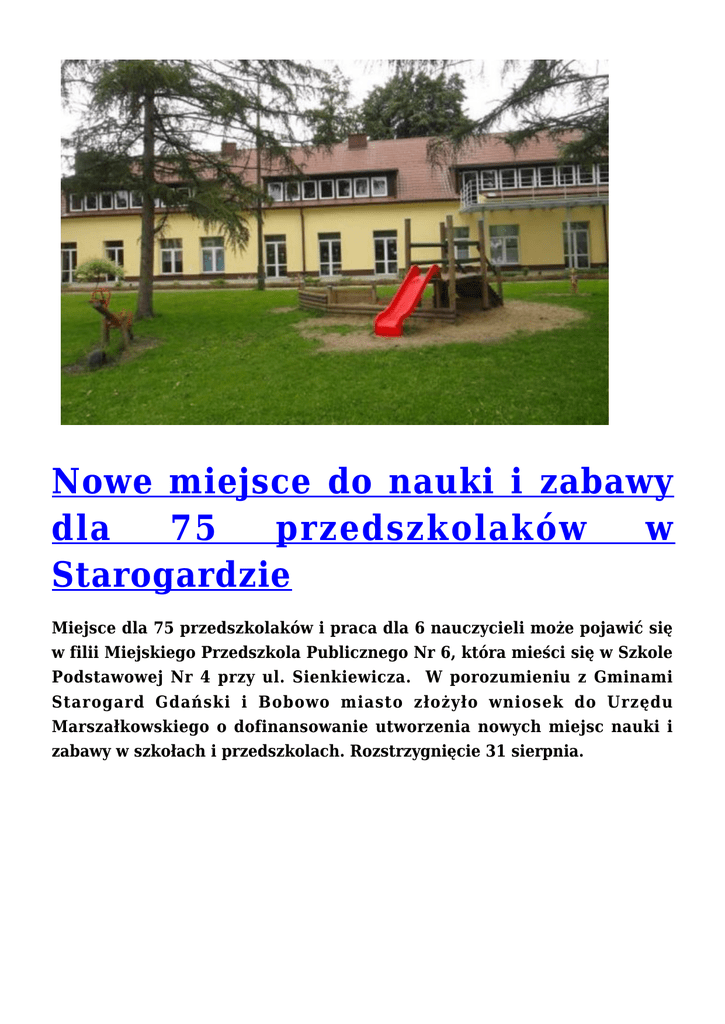 Nowe miejsce do nauki i zabawy dla 75 przedszkolaków w Starogardzie Miejsce dla 75 przedszkolaków i praca dla 6 nauczycieli może pojawić się w filii Miejskiego Przedszkola Publicznego Nr 6, która mieści się w Szkole Podstawowej Nr 4 przy ul. Sienkiewicza. W porozumieniu z Gminami Starogard Gdański i Bobowo miasto złożyło wniosek do Urzędu Marszałkowskiego o dofinansowanie utworzenia nowych miejsc nauki i zabawy w szkołach i przedszkolach. Rozstrzygnięcie 31 sierpnia. Filia Miejskiego Przedszkola Publicznego Nr 6 „Modraczek” to tylko jedna z 8 placówek objęta projektem „Tworzenie nowych miejsc edukacji przedszkolnej na terenie Miejskiego Obszaru Funkcjonowania Starogardu Gdańskiego”. Projekt prowadzi Gmina (Wiejska) Starogard Gdański. 14 kwietnia razem z partnerami: Gminą Miejską Starogard Gdański, Gminą Bobowo oraz Fundacją Rozwoju Edukacji i Społeczności Lokalnych „In Fortes” złożyła w Urzędzie Marszałkowskim wniosek o dofinansowanie inwestycji. Do 31 sierpnia br. Urząd rozstrzygnie konkurs i wybierze projekty, które otrzymają dofinansowanie. 14 kwietnia wójtowie Stanisław Połom i Sylwester Patrzykąt, prezydent Janusz Stankowiak oraz Prezes Zarządu Fundacji, Marek Ejsmont, podpisali specjalne porozumienie w tej sprawie. Inwestycja zakłada nowe miejsca do nauki i zabawy w trzech przedszkolach i pięciu szkołach na terenie miasta i gmin Starogard Gdański i Bobowo. Nowe oddziały mają powstać w Przedszkolu Publicznym w Kokoszkowach, Bobowie i Starogardzie Gdańskim (filia Przedszkola Publicznego Nr 6 przy PSP 4) oraz w Publicznej Szkole Podstawowej w Rokocinie, Rywałdzie, Trzcińsku, Jabłowie, Suminie i Bobowie. W sumie 12 nowych oddziałów i 232 miejsc dla przedszkolaków. W związku z tym przewiduje się też zatrudnienie 17 nowych nauczycieli. W Starogardzie Gdańskim w filii „Modraczka” planowane są trzy sale, korytarz łączący je z szatnią oraz pomieszczenia sanitarne. Pomieszczenia mają być wyposażone w nowe meble i niezbędne materiały dydaktyczne. To pozwoli na przyjęcie dodatkowo 75 dzieci i zatrudnienie 6 nowych nauczycieli. Większość kosztów przedsięwzięcia ma pokryć Unia Europejska. To jednak nie wszystkie zalety wspólnej inicjatywy trzech gmin i fundacji dla mieszkańców. Projekt przewiduje finansowanie konkretnych zadań i zajęć dla przedszkolaków. M.in. planowane są wycieczki dla dzieci, dodatkowe zajęcia nauki języka obcego oraz zajęcia rozwijające dziecięcą kreatywność. Poza tym w programie przewidziane są także zajęcia logopedyczne. Nauka odbywać się będzie między innymi z wykorzystaniem komputerów i sprzętu multimedialnego. Projekt skierowany jest nie tylko do dzieci, ale również spełnia oczekiwania nauczycieli, którzy będą mieli wiele okazji by podnieść swoje umiejętności pedagogiczno – wychowawcze. Poza szkoleniami podnoszącymi kwalifikacje kadry, projekt ma umożliwić nauczycielom podjęcia studiów podyplomowych z zakresu nauki języka angielskiego. Przedsięwzięcie realizowane jest przez Gminę Starogard Gdański, Gminę Miejską Starogard Gdański i Gminę Bobowo, przy współpracy z Fundacją Rozwoju Edukacji i Społeczności Lokalnych „In Fortes” w ramach Regionalnego Programu Operacyjnego Województwa Pomorskiego na lata 2014-2020, z działania Edukacja przedszkolna. Wartość przedsięwzięcia to niecałe 7 mln zł, przy czym 85% tych kosztów, czyli prawie 6 mln zł, pochodzić będzie z funduszy unijnych.