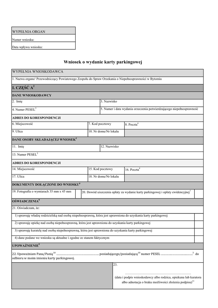 WYPEŁNIA ORGAN Numer wniosku: Data wpływu wniosku: Wniosek o wydanie karty parkingowej WYPEŁNIA WNIOSKODAWCA 1. Nazwa organu¹ Przewodniczący Powiatowego Zespołu do Spraw Orzekania o Niepełnosprawności w Bytomiu I. CZĘŚĆ A2 DANE WNIOSKODAWCY 2. Imię 3. Nazwisko 4. Numer PESEL3 5. Numer i data wydania orzeczenia potwierdzającego niepełnosprawność ADRES DO KORESPONDENCJI 6. Miejscowość 7. Kod pocztowy 9. Ulica 10. Nr domu/Nr lokalu 8. Poczta4 DANE OSOBY SKŁADAJĄCEJ WNIOSEK5 11. Imię 12. Nazwisko 13. Numer PESEL3 ADRES DO KORESPONDENCJI 14. Miejscowość 15. Kod pocztowy 17. Ulica 18. Nr domu/Nr lokalu 16. Poczta4 DOKUMENTY DOŁĄCZONE DO WNIOSKU6 19. Fotografia o wymiarach 35 mm x 45 mm 20. Dowód uiszczenia opłaty za wydanie karty parkingowej i opłaty ewidencyjnej7 OŚWIADCZENIA8 21. Oświadczam, że: 1) sprawuję władzę rodzicielską nad osobą niepełnosprawną, która jest uprawniona do uzyskania karty parkingowej 2) sprawuję opiekę nad osobą niepełnosprawną, która jest uprawniona do uzyskania karty parkingowej 3) sprawuję kuratelę nad osobą niepełnosprawną, która jest uprawniona do uzyskania karty parkingowej 4) dane podane we wniosku są aktualne i zgodne ze stanem faktycznym UPOWAŻNIENIE9 22. Upoważniam Pana/Panią10 ……………………………………………. posiadającego/posiadającą10 numer PESEL …………..………….…...…….3 do odbioru w moim imieniu karty parkingowej. 23. …………………………………………………… (data i podpis wnioskodawcy albo rodzica, opiekuna lub kuratora albo adnotacja o braku możliwości złożenia podpisu)11 II. CZĘŚĆ B12 DANE PLACÓWKI ZAJMUJĄCEJ SIĘ OPIEKĄ, REHABILITACJĄ LUB EDUKACJĄ OSÓB NIEPEŁNOSPRAWNYCH MAJĄCYCH ZNACZNIE OGRANICZONE MOŻLIWOŚCI SAMODZIELNEGO PORUSZANIA SIĘ 24. Nazwa 25. Numer KRS 26. Numer REGON 27. Numer rejestracyjny pojazdu placówki 28. Marka i model pojazdu placówki ADRES SIEDZIBY 29. Miejscowość 30. Kod pocztowy 32. Ulica 33. Nr domu/Nr lokalu 31. Poczta4 DANE OSOBY SKŁADAJĄCEJ WNIOSEK 34. Imię 35. Nazwisko 36. Numer PESEL3 ADRES DO KORESPONDENCJI 37. Miejscowość 38. Kod pocztowy 40. Ulica 41. Nr domu/Nr lokalu 39. Poczta4 DOKUMENT DOŁĄCZONY DO WNIOSKU6 42. Dowód uiszczenia opłaty za wydanie karty parkingowej i opłaty ewidencyjnej7 OŚWIADCZENIA6 43. Oświadczam, że: 1) posiadam upoważnienie do reprezentowania placówki uprawnionej do uzyskania karty parkingowej 2) placówka prowadzi działalność w zakresie opieki, rehabilitacji lub edukacji osób niepełnosprawnych mających znacznie ograniczone możliwości samodzielnego poruszania się i jest uprawniona do uzyskania karty parkingowej 3) dane podane we wniosku są aktualne i zgodne ze stanem faktycznym 44. …………………………………………………… (data i podpis osoby upoważnionej do reprezentowania placówki albo adnotacja o braku możliwości złożenia podpisu)11 III. CZĘŚĆ C - ODBIÓR KARTY Potwierdzenie odbioru karty parkingowej 45. Kartę parkingową numer: 46. Oświadczam, że6: 1) posiadam upoważnienie do reprezentowania placówki uprawnionej do uzyskania karty parkingowej 2) sprawuję władzę rodzicielską, opiekę lub kuratelę nad osobą niepełnosprawną uprawnioną do uzyskania karty parkingowej otrzymałem/otrzymałam10 47. …………………………………………………… (data i podpis wnioskodawcy lub osoby przez niego upoważnionej albo rodzica, opiekuna lub kuratora albo osoby upoważnionej do reprezentowania placówki albo adnotacja o braku możliwości złożenia podpisu) IV. CZĘŚĆ D - WZÓR PODPISU I ZDJĘCIE 48. 49. miejsce na fotografię 35 mm x 45 mm WZÓR PODPISU13 1 Przewodniczący powiatowego zespołu do spraw orzekania o niepełnosprawności, do którego składa się wniosek. 2 Część A wypełnia się w przypadku, gdy wniosek dotyczy osoby niepełnosprawnej. 3 W przypadku nieposiadania numeru PESEL – seria i numer dokumentu potwierdzającego tożsamość. 4 Należy wypełnić, o ile nazwa poczty jest inna niż nazwa miejscowości. Wypełnia się w przypadku, gdy wniosek składany jest przez rodzica, opiekuna lub kuratora osoby niepełnosprawnej. 5 6 Właściwe zaznaczyć wstawiając znak „X”. 7 Dowód uiszczenia opłaty ewidencyjnej dołączany jest do wniosku od dnia 4 stycznia 2016 r. 8 Właściwe zaznaczyć wstawiając znak „X”; oświadczenia wskazane w pkt 1–3 są składane w przypadku, gdy wniosek o wydanie karty parkingowej jest składany przez rodzica, opiekuna lub kuratora osoby niepełnosprawnej. Wypełnia się w przypadku odbioru karty parkingowej przez osobę upoważnioną. Niewłaściwe skreślić. 11 Należy podpisać wniosek w obecności przewodniczącego zespołu albo osoby przez niego upoważnionej. 9 10 12 Część B wypełnia się w przypadku, gdy wniosek dotyczy placówki. W przypadku, gdy wniosek dotyczy osoby, która nie ukończyła 18. roku życia, osoby ubezwłasnowolnionej całkowicie lub częściowo lub osoby, która nie ma możliwości złożenia podpisu albo placówki – pole pozostawia się niewypełnione. 13 STRONY PRZYJMUJE SIĘ W POKOJU 4 W PONIEDZIAŁKI OD 9:30 DO 15:30 OD WTORKU DO CZWARTKU OD 9:30 DO 14:00 PRZERWA OD 11:30 DO 12:00 W PIĄTKI STRON NIE PRZYJMUJEMY KASA CZYNNA W PONIEDZIAŁKI OD 9:30 DO 15:30 OD WTORKU DO CZWARTKU OD 9:30 DO 14:00 ZAŁĄCZNIKI: *1 AKTUALNA FOTOGRAFIA O WYMIARACH 35 mm x 45 mm *KSEROKOPIA (ORYGINAŁ DO WGLĄDU) PRAWOMOCNEGO ORZECZENIA O NIEPEŁNOSPRAWNOŚCI, STOPNIU NIEPEŁNOSPRAWNOŚCI *21 ZŁ - OPŁATA ZA WYDANIE KARTY PARKINGOWEJ OSOBA NIEPEŁNOSPRAWNA SKŁADA WNIOSEK OSOBIŚCIE, Z WYJĄTKIEM: *OSOBY, KTÓRA NIE UKOŃCZYŁA 18 ROKU ŻYCIA, ZA KTÓRĄ WNIOSEK SKŁADAJĄ RODZICE LUB USTANOWIENI PRZEZ SĄD OPIEKUNOWIE ALBO JEDEN Z RODZICÓW LUB USTANOWIONYCH PRZEZ SĄD OPIEKUNÓW; *OSOBY UBEZWŁASNOWOLNIONEJ CAŁKOWICIE POZOSTAJĄCEJ POD WŁADZĄ RODZICIELSKĄ, ZA KTÓRĄ WNIOSEK SKŁADA JEDEN Z RODZICÓW; *OSOBY UBEZW