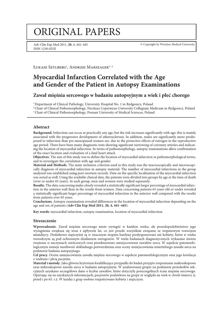 original papers Adv Clin Exp Med 2011, 20, 4, 441–445 ISSN 1230-025X © Copyright by Wroclaw Medical University Łukasz Szylberg1, Andrzej Marszałek2, 3 Myocardial Infarction Correlated with the Age and Gender of the Patient in Autopsy Examinations Zawał mięśnia sercowego w badaniu autopsyjnym a wiek i płeć chorego Department of Clinical Pathology, University Hospital No. 1 in Bydgoszcz, Poland Chair of Clinical Pathomorphology, Nicolaus Copernicus University Collegium Medicum in Bydgoszcz, Poland 3 Chair of Clinical Pathomorphology, Poznan University of Medical Sciences, Poland 1 2 Abstract Background. Infarction can occur at practically any age, but the risk increases significantly with age; this is mainly associated with the progressive development of atherosclerosis. In addition, males are significantly more predisposed to infarction than pre-menopausal women are, due to the protective effects of estrogen in the reproductive age period. There have been many diagnostic tests showing significant narrowing of coronary arteries and indicating the location of myocardial infarction. In terms of pathomorphology, autopsy examinations allow confirmation of the exact location and evaluation of a fatal heart attack. Objectives. The aim of this study was to define the location of myocardial infarction in pathomorphological terms, and to investigate the correlation with age and gender. Material and Methods. The main inclusion criterion used in this study was the macroscopically and microscopically diagnosis of myocardial infarction in autopsy material. The number of myocardial infarctions in the group analyzed was established using post-mortem records. Data on the specific localization of the myocardial infarction was noted as well. Using the available clinical data, the patients were divided into groups by age at the time of death (over or under 65 years). In each group, men and women were studied separately. Results. The data concerning males clearly revealed a statistically significant larger percentage of myocardial infarction in the anterior wall than in the results from women. Data concerning patients 65 years old or under revealed a statistically significant larger percentage of myocardial infarction in the anterior wall compared with the results from patients over 65 years. Conclusions. Autopsy examination revealed differences in the location of myocardial infarction depending on the age and sex of patients (Adv Clin Exp Med 2011, 20, 4, 441–445). Key words: myocardial infarction, autopsy examination, location of myocardial infarction. Streszczenie Wprowadzenie. Zawał mięśnia sercowego może wystąpić w każdym wieku, ale prawdopodobieństwo jego wystąpienia zwiększa się wraz z upływem lat, co jest przede wszystkim związane ze stopniowym rozwojem miażdżycy. Dodatkowo mężczyźni są w znacznym stopniu bardziej predysponowani niż kobiety, które w wieku rozrodczym są pod ochronnym działaniem estrogenów. W wielu badaniach diagnostycznych wykazano istotne zwężenia w naczyniach wieńcowych oraz przedstawiono umiejscowienie zawałów serca. W aspekcie patomorfologicznym istnieje możliwość dokładnego potwierdzenia oraz oceny umiejscowienia śmiertelnego zawału serca na podstawie badania autopsyjnego. Cel pracy. Ocena umiejscowienia zawału mięśnia sercowego w aspekcie patomorfologicznym oraz jego korelacja z wiekiem i płcią pacjenta. Materiał i metody. Jako główne kryterium kwalifikujące przypadki do badań przyjęto rozpoznanie makroskopowe oraz mikroskopowe zawału serca w badaniu autopsyjnym. W analizowanej grupie na podstawie protokołów sekcyjnych uzyskano szczegółowe dane o liczbie zawałów, które dotyczyły poszczególnych ścian mięśnia sercowego. Opierając się na uzyskanych informacjach, pacjentów podzielono na grupy ze względu na wiek w chwili śmierci, tj. przed i po 65. r.ż. W każdej z grup osobno rozpatrywano kobiety i mężczyzn. 442 Ł. Szylberg, A. Marszałek Wyniki. Uzyskane wyniki dotyczące mężczyzn jednoznacznie wykazały istotny statystycznie większy udział procentowy zawału ściany przedniej serca w porównaniu z wynikami uzyskanymi u kobiet. Dane dotyczące osób poniżej lub w wieku 65 lat wykazały istotny statystycznie większy udział procentowy zawału ściany przedniej mięśnia sercowego w porównaniu z wynikami uzyskanymi w grupie osób powyżej 65 lat. Wnioski. Badanie autopsyjne wykazało różnicę w umiejscowieniu zawałów mięśnia sercowego serca zarówno w zależności od wieku, jak i płci pacjentów (Adv Clin Exp Med 2011, 20, 4, 441–445). Słowa kluczowe: zawał mięśnia sercowego, badanie autopsyjne, umiejscowienie zawału mięśnia sercowego. Myocardial infarction is focal necrosis of the heart muscle caused by hypoxia. In Poland, coronary heart disease is believed to be responsible for about 40% of the deaths among middle-aged males, and (after malignant tumors) is the second most frequent cause of premature death among women [1, 2]. Infarction can occur practically at any age, but the risk increases significantly with age; this is mainly associated with the progressive development of atherosclerosis Only about 10% of all heart attacks occur in people under 40 years old, and up to 45% of them are in people under 65. Males are significantly more predisposed to infarction than pre-menopausal women are, due to the protective effects of estrogen in the reproductive age period. Myocardial infarction (MI) most often occurs in connection with coronary atherosclerosis. Changes in atherosclerotic plaque are the most common starting point for thrombus formation and occlusion of the artery. This process leads to myocardial infarction of the area supplied by the occluded vessel. It is known that so-called right coronary dominance of blood flow is more frequent. Howeve in 40–50% of MI patients narrowing is found in the left anterior descending coronary artery (LAD), which supplies the anterior wall o
