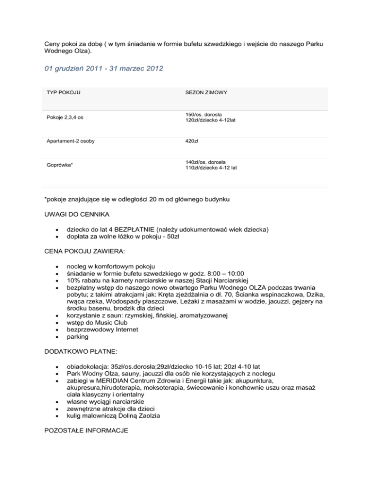 Ceny pokoi za dobę ( w tym śniadanie w formie bufetu szwedzkiego i wejście do naszego Parku Wodnego Olza). 01 grudzień 2011 - 31 marzec 2012 TYP POKOJU SEZON ZIMOWY Pokoje 2,3,4 os 150/os. dorosła 120zł/dziecko 4-12lat Apartament-2 osoby 420zł Goprówka* 140zł/os. dorosła 110zł/dziecko 4-12 lat *pokoje znajdujące się w odległości 20 m od głównego budynku UWAGI DO CENNIKA dziecko do lat 4 BEZPŁATNIE (należy udokumentować wiek dziecka) dopłata za wolne łóżko w pokoju - 50zł CENA POKOJU ZAWIERA: nocleg w komfortowym pokoju śniadanie w formie bufetu szwedzkiego w godz. 8:00 – 10:00 10% rabatu na karnety narciarskie w naszej Stacji Narciarskiej bezpłatny wstęp do naszego nowo otwartego Parku Wodnego OLZA podczas trwania pobytu; z takimi atrakcjami jak: Kręta zjeżdżalnia o dł. 70, Ścianka wspinaczkowa, Dzika, rwąca rzeka, Wodospady płaszczowe, Leżaki z masażami w wodzie, jacuzzi, gejzery na środku basenu, brodzik dla dzieci korzystanie z saun: rzymskiej, fińskiej, aromatyzowanej wstęp do Music Club bezprzewodowy Internet parking DODATKOWO PŁATNE: obiadokolacja: 35zł/os.dorosła;29zł/dziecko 10-15 lat; 20zł 4-10 lat Park Wodny Olza, sauny, jacuzzi dla osób nie korzystających z noclegu zabiegi w MERIDIAN Centrum Zdrowia i Energii takie jak: akupunktura, akupresura,hirudoterapia, moksoterapia, świecowanie i konchownie uszu oraz masaż ciała klasyczny i orientalny własne wyciągi narciarskie zewnętrzne atrakcje dla dzieci kulig malowniczą Doliną Zaolzia POZOSTAŁE INFORMACJE Doba hotelowa 15.00 - 11.00 na terenie Kompleksu obowiązuje zakaz palenia w lokalach Kompleksu Zagroń Istebna obowiązuje całkowity zakaz wnoszenia swojego alkoholu, napoi oraz potraw. nie akceptujemy zwierząt przedpłata 30% wartości całości pobytu do 7 dni od dnia dokonania rezerwacji pozostałą część płatności prosimy uregulować w dniu przyjazdu możliwość płatności kartą Kompleks Zagroń Istebna Istebna 1588; 43-470 Istebna Linter Tour S.A. 43-470 Istebna 1588 Raiffeisen Bank Polska S.A. 51 1750 1035 0000 0000 1074 4954 Zastrzega się prawo do zmiany cen 01 grudnia 2011 – 31 marzec 2012 *POKOJE GROŃ TYP POKOJU SEZON ZIMOWY Pokoje 1,2,3,4,5 os 90zł/os. dorosła 60zł/dziecko 4-12 lat *pokoje znajdują się w odległości 100 m od głównego budynku UWAGI DO CENNIKA dziecko do lat 4 BEZPŁATNIE (należy udokumentować wiek dziecka) dopłata za wolne łóżko w pokoju - 50zł CENA POKOJU ZAWIERA: nocleg w komfortowym pokoju śniadanie w formie bufetu szwedzkiego w godz. 8:00 – 10:00 10% rabatu na karnety narciarskie w naszej Stacji Narciarskiej 10% znizki na bilety wstepu do parku wodnego „Olza” wstęp do Music Club bezprzewodowy Internet parking bilard, piłkarzyki DODATKOWO PŁATNE: obiadokolacja: 35zł/os.dorosła;29zł/dziecko 10-15 lat; 20zł 4-10 lat Park Wodny Olza, sauny, jacuzzi zabiegi w MERIDIAN Centrum Zdrowia i Energii takie jak: akupunktura, akupresura,hirudoterapia, moksoterapia, świecowanie i konchownie uszu oraz masaż ciała klasyczny i orientalny własne wyciągi narciarskie zewnętrzne atrakcje dla dzieci kulig malowniczą Doliną Zaolzia POZOSTAŁE INFORMACJE Doba hotelowa 15.00 - 11.00 na terenie Kompleksu obowiązuje zakaz palenia w lokalach Kompleksu Zagroń Istebna obowiązuje całkowity zakaz wnoszenia swojego alkoholu, napoi oraz potraw. nie akceptujemy zwierząt przedpłata 30% wartości całości pobytu do 7 dni od dnia dokonania rezerwacji pozostałą część płatności prosimy uregulować w dniu przyjazdu możliwość płatności kartą Kompleks Zagroń Istebna Istebna 1588; 43-470 Istebna Linter S.A., ul.Piłsudskiego 57a, 32-340 Wolbrom Raiffeisen Bank Polska S.A. 64 1750 1181 0000 0000 1048 6572