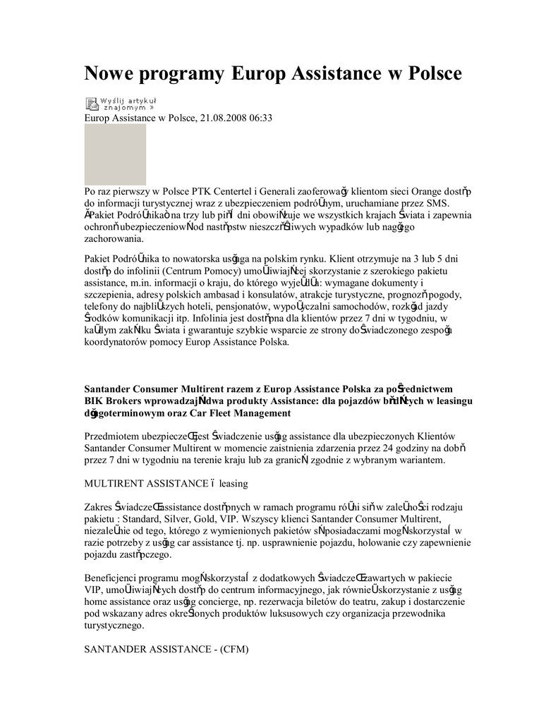 Nowe programy Europ Assistance w Polsce Europ Assistance w Polsce, 21.08.2008 06:33 Po raz pierwszy w Polsce PTK Centertel i Generali zaoferowały klientom sieci Orange dostęp do informacji turystycznej wraz z ubezpieczeniem podróżnym, uruchamiane przez SMS. „Pakiet Podróżnika” na trzy lub pięć dni obowiązuje we wszystkich krajach świata i zapewnia ochronę ubezpieczeniową od następstw nieszczęśliwych wypadków lub nagłego zachorowania. Pakiet Podróżnika to nowatorska usługa na polskim rynku. Klient otrzymuje na 3 lub 5 dni dostęp do infolinii (Centrum Pomocy) umożliwiającej skorzystanie z szerokiego pakietu assistance, m.in. informacji o kraju, do którego wyjeżdża: wymagane dokumenty i szczepienia, adresy polskich ambasad i konsulatów, atrakcje turystyczne, prognozę pogody, telefony do najbliższych hoteli, pensjonatów, wypożyczalni samochodów, rozkład jazdy środków komunikacji itp. Infolinia jest dostępna dla klientów przez 7 dni w tygodniu, w każdym zakątku świata i gwarantuje szybkie wsparcie ze strony doświadczonego zespołu koordynatorów pomocy Europ Assistance Polska. Santander Consumer Multirent razem z Europ Assistance Polska za pośrednictwem BIK Brokers wprowadzają dwa produkty Assistance: dla pojazdów będących w leasingu długoterminowym oraz Car Fleet Management Przedmiotem ubezpieczeń jest świadczenie usług assistance dla ubezpieczonych Klientów Santander Consumer Multirent w momencie zaistnienia zdarzenia przez 24 godziny na dobę przez 7 dni w tygodniu na terenie kraju lub za granicą, zgodnie z wybranym wariantem. MULTIRENT ASSISTANCE – leasing Zakres świadczeń assistance dostępnych w ramach programu różni się w zależności rodzaju pakietu : Standard, Silver, Gold, VIP. Wszyscy klienci Santander Consumer Multirent, niezależnie od tego, którego z wymienionych pakietów są posiadaczami mogą skorzystać w razie potrzeby z usług car assistance tj. np. usprawnienie pojazdu, holowanie czy zapewnienie pojazdu zastępczego. Beneficjenci programu mogą skorzystać z dodatkowych świadczeń zawartych w pakiecie VIP, umożliwiających dostęp do centrum informacyjnego, jak również skorzystanie z usług home assistance oraz usług concierge, np. rezerwacja biletów do teatru, zakup i dostarczenie pod wskazany adres określonych produktów luksusowych czy organizacja przewodnika turystycznego. SANTANDER ASSISTANCE - (CFM) Dzięki programowi SANTANDER ASSISTANCE kierowcy pojazdów wynajmu długoterminowego mogą liczyć na całodobową pomoc w przypadku wypadku na drodze oraz awarii pojazdu. Mogą skorzystać m.in. z holowania, samochodu zastępczego jak również transportu kierowcy oraz pasażerów czy pomocy administracyjnej za granicą. Spośród kilku wariantów SANTANDER ASSISTANCE beneficjenci programu mogą wybrać pakiet Commercial, który dedykowany jest użytkownikom pojazdów ciężarowych. Dzięki temu pakietowi , w razie konieczności Europ Assistance Polska organizuje oraz pokrywa koszty wynajmu zastępczego pojazdu ciężarowego. Źródło: http://www.prnews.pl