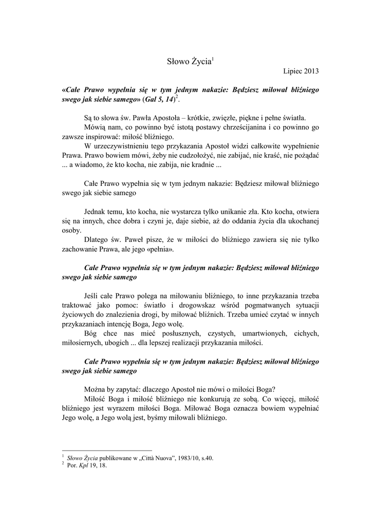 Słowo śycia1 Lipiec 2013 «Całe Prawo wypełnia się w tym jednym nakazie: Będziesz miłował bliźniego swego jak siebie samego» (Gal 5, 14)2. Są to słowa św. Pawła Apostoła – krótkie, zwięzłe, piękne i pełne światła. Mówią nam, co powinno być istotą postawy chrześcijanina i co powinno go zawsze inspirować: miłość bliźniego. W urzeczywistnieniu tego przykazania Apostoł widzi całkowite wypełnienie Prawa. Prawo bowiem mówi, Ŝeby nie cudzołoŜyć, nie zabijać, nie kraść, nie poŜądać ... a wiadomo, Ŝe kto kocha, nie zabija, nie kradnie ... Całe Prawo wypełnia się w tym jednym nakazie: Będziesz miłował bliźniego swego jak siebie samego Jednak temu, kto kocha, nie wystarcza tylko unikanie zła. Kto kocha, otwiera się na innych, chce dobra i czyni je, daje siebie, aŜ do oddania Ŝycia dla ukochanej osoby. Dlatego św. Paweł pisze, Ŝe w miłości do bliźniego zawiera się nie tylko zachowanie Prawa, ale jego «pełnia». Całe Prawo wypełnia się w tym jednym nakazie: Będziesz miłował bliźniego swego jak siebie samego Jeśli całe Prawo polega na miłowaniu bliźniego, to inne przykazania trzeba traktować jako pomoc: światło i drogowskaz wśród pogmatwanych sytuacji Ŝyciowych do znalezienia drogi, by miłować bliźnich. Trzeba umieć czytać w innych przykazaniach intencję Boga, Jego wolę. Bóg chce nas mieć posłusznych, czystych, umartwionych, cichych, miłosiernych, ubogich ... dla lepszej realizacji przykazania miłości. Całe Prawo wypełnia się w tym jednym nakazie: Będziesz miłował bliźniego swego jak siebie samego MoŜna by zapytać: dlaczego Apostoł nie mówi o miłości Boga? Miłość Boga i miłość bliźniego nie konkurują ze sobą. Co więcej, miłość bliźniego jest wyrazem miłości Boga. Miłować Boga oznacza bowiem wypełniać Jego wolę, a Jego wolą jest, byśmy miłowali bliźniego. 1 2 Słowo śycia publikowane w „Città Nuova”, 1983/10, s.40. Por. Kpl 19, 18. 2 Całe Prawo wypełnia się w tym jednym nakazie: Będziesz miłował bliźniego swego jak siebie samego Jak Ŝyć tymi słowami? To jasne: miłując bliźniego; miłując go naprawdę. To znaczy: być darem dla niego, ale darem bezinteresownym. Nie miłuje ten, kto posługuje się bliźnim dla swoich celów, nawet najbardziej duchowych, jak na przykład własne uświęcenie. Trzeba miłować bliźniego, a nie siebie samego. Nie ma przy tym wątpliwości, Ŝe ten, kto miłuje w taki sposób, naprawdę stanie się świętym. Będzie «doskonały jak Ojciec», poniewaŜ zrobił to, co mógł zrobić najlepszego: zrozumiał istotę woli BoŜej, zrealizował ją, całkowicie wypełnił Prawo. Czy pod koniec naszego Ŝycia nie będziemy egzaminowani wyłącznie z miłości? Chiara Lubich