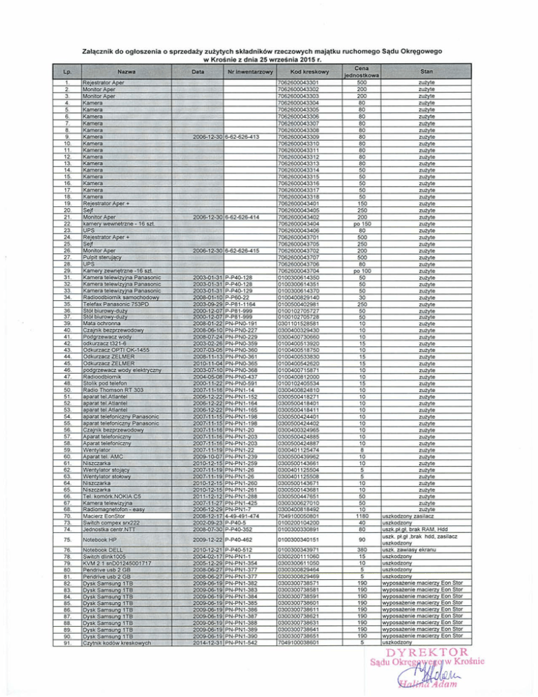 Załącznik do ogłoszenia en: Lp. ~Kilf;;If'~," 1. 2. 3. 4. 5. 6. 7. 8. 9. 10. 11. 12. 13. 14. 15. 16. 17. 18. 19. 20. 21. 22. 23. 24. 25. 26. 27. 28. 29. 31. 32. 33. 34. 35. 36. 37. 39. 40. 41. 42. 43. 44. 45. 46. 47. 48. 50. 51. 52. 53. 54. 55. 56. 57. 58. 59. 60. 61. 62. 63. 64. 65. 66. 67. 68. 70. 73. 74. Reiestrator Aoer Monitor Aper Monitor Aoer Kamera Kamera Kamera Kamera Kamera Kamera Kamera Kamera Kamera Kamera _1ft'" (Zowy 2006-12-30 6-62-626-413 d ik iW ;ą}1i Kame~ Kamer Kamera Kamera! Kamera iU )IąiIUł' '0" ",Mh li II iI .'!h, Monit kamery wewnetrzne - 16 szt. UPS c;,.Av(;,M.· 0% }i ą Rejestrator Aper + Seif'" oIii,l"'@',Mi" " Monitor Aper 2006:12-30 .$& Pulpit steruiacv UPS X: Kamerv zewnetrzne -16 szt. 'i. 2003-01-31 Kamera telewizvlna Panasonic Kamera telewizvina Panasonic 2003-01-31 2003-01-31 Kamera telewizvina Panasonic Radioodbiomik samochodowy 2008-01-10 Telefax Panasonic 753PO 2003-09-29 Stół biurowv-dużv 2000-12-07 Stół biurowv-dużv 2000-12-07 Mata ochronna 2008-01-22 Czainik bezprzewodowy 2008-06-10 Podarzewacz wody 2008-07-24 odkurzacz t321-6 2003-02-26 2007-03-05 Odkurzacz OPTI OK-1455 Odkurzacz ZELMER 2008-11-13 Odkurzacz ZELMER 2010-11,04 Ipodcrzewacz wody elektrvcznv 2003-07-10 Hi 2004-05-08 Radioodbiomik q ni Stolik pod teteron, ·liW @nP} 2000,U-22 li2007-1'f-;16 Radio Thomson RT 303 di 6-62-626-414 ,. " / aoarat telrAtlantel 'OO''''~~'"'i H'I 6-62-626-415 P-P40-128 P-P40-128 P-P40-129 P-P60-22 P-P81-1164 P-P81-999 P-P81-999 PN-PNO-191 PN-PNO-227 PN-PNO-229 PN-PNO-359 PN-PNO-360 PN-PNO-361 PN-PNO-365 PN-PNO-368 PN-PNO-437 PN-PNO-591 PN-PN1-14 ~ "O~'wr"N"'" aparaHelrAtlantel aoafattelefónici aparat teletonl Czainik bezprzewodowVilidi Aparat telefonicznv"'" Aparat telefoniczny Wentylator·"" Aparat tel. AMC Niszczarka Wentylator stoiacv Wentylator stołowv Niszczarka Niszczarka Tel. komórk.NOKIA C5 Kamera telewizvina Radiomaanetofon - easy Macierz EonStor Switch comoex srx222 Jednostka centr.NIT H'i/ i @' ,l 2007-.1-1-15 2007-th16 2007-11-'16 2007,.11-16 2007-11-19 2009-10-07 2010-12-15 2007-11-19 2007-11-19 2010-12-15 2010-12-15 2011-12-12 2007-11-27 2006-12-29 2008-12-17 2002-09-23 2008-07-30 PN-PN1-164 PN-PN1-165 PN-PN1-198 PN-PN1-198 PN-PN1-20 PN-PN1-203 PN-PN1-203 PN-PN1-22 PN-PN1-239 PN-PN1-259 PN-PN1-26 PN-PN1-26 PN-PN1-260 PN-PN1-261 PN-PN1-288 PN-PN1-425 PN-PN1-7 4-49-491-474 P-P40-5 P-P40-352 P-P40-462 75. Notebook HP 2009-12-22 76. 78. 79. 80. 81. 82. 83. 84. 85. 86. 87. 88. 89. 90. 91. Notebook OELL Switch dlink1005 KVM 2 1 sn001245001717 Pendrive usb 2 GB Pendrive usb 2 GB Dysk samsuno HB W" Dysk samsono 1TB ' ' m,. P-P40-512 PN-PN1-1 PN-PN1-354 PN-PN1-377 PN-PN1-377 PN-PN1-382 PN-PN1-383 PN-PN1-384 PN-PN1-385 Ó PN-PN1-386 O PN-PN1-387 O PN-PN1-388 Ob9-Óe;19 PN-PN1-389 2009-06-19 PN-PN1-390 2014-12-31 PN-PN1-542 'ci. " 2010-12-21 2004-02-17 2005-12-29 2008-06-27 2008-06,27 2009-06-19 2009-0&"19 rs~wr.",d'l i II " Dysk Samsdn D D DyskSamsunHll1T DysK sarneum iTB Dysk Samsuna HB ą Czytnik kodów kreskowych 'i' ·di s.' o sprzedaży zużytych składników rzeczowych majątku ruchomego Sądu Okręgowego w Krośnie z dnia 25 września 2015 r ;lV' .di#;; .P' m I Kodkr~ 7062600043301 7062600043302 7062600043303 7062600043304 7062600043305 7062600043306 7062600043307 7062600043308 7062600043309 7062600043310 7062600043311 7062600043312 7062600043313 7062600043314 7062600043315 7062600043316 7062600043317 7062600043318 7062600043401 7062600043405 7062600043402 7062600043404 7062600043406 7062600043701 7062600043705 7062600043702 7062600043707 7062600043706 7062600043704 0100300614350 0100300614351 0100300614370 0100400829140 0100500402981 0100102705727 0100102705728 0301101528581 0300400329430 0300400730660 0100400513920 0100400518750 0100400533830 0100400542620 0100400715871 0100400812000 0100102405534 0300400824810 0300500418271 0300500418401 0300500418411 0300500424401 0300500424402 0300400324965 0300500424885 0300500424887 0300401125474 0300500439962 0300500143661 0300401125504 0300401125508 0300500143671 0300500143681 0300500447651 0300300627010 0300400818492 7049100050801 0100200104200 0100300330891 #JM! Cena I Jednostkowa 500 200 200 80 80 80 80 80 80 80 80 80 80 50 50 50 50 50 150 250 200 po 150 80 500 250 200 500 80 po 100 50 50 50 30 250 50 50 10 10 10 15 10 15 15 10 10 15 10 10 10 10 10 10 10 10 10 8 10 10 5 5 10 10 50 50 10 1180 40 80 0100300340151 90 0100300343971 0300200111060 0300300611050 0300300829464 0300300829469 0300300738571 0300300738581 0300300738591 0300300738601 0300300738611 0300300738621 0300300738631 0300300738641 0300300738651 7049100038601 380 15 10 5 5 190 190 190 190 190 190 190 190 190 5 JW %#i zużvte zużvte zużvte zużve zużvte zużv e zużyte zużyte zużyte zużyte zużyte zużyte zużyte zużyte zużyte zużyte zużyte zużyte zużyte zużyte zużyte zużyte zużyte zużyte zużyte zużyte zużyte zużyte zużyte zuż te zużvte zużvte zużvte zużvte zużvte zuż e zużvte zużv e zużv e zużv e zużvte zużyte zużyte zużyte zużyte zużyte zużyte zużyte zużyte zużyte zużyte zużyte zużyte zużyte zużyte zużyte zużyte zużyte zużyte zużyte zużyte zużvte zużv e zużyte zużyte uszkodzony zasilacz uszkodzony uszk.oł.ał, brak RAM, Hdd uszko pI.gł ,brak hdd, zasilacz uszkodzony uszko zawiasy ekranu uszkodzony uszkodzony uszkodzonv uszkodzony lwvposażenie macierzy Eon Stor lwvoosażenie macierzy Eon Stor lwvoosażenle macierzy Eon Stor lwvnosażenle macierzy Eon Stor [wvposażenle macierzy Eon Stor lwvposażenle macierzy Eon Stor lwvoosażenle macierzy Eon Stor lwvoosażenle macierzy Eon Stor [wvposażenie macierzy Eon Stor uszkodzony O~,,,~:. DYREKTOR Sądu ~ośnie ~':;;