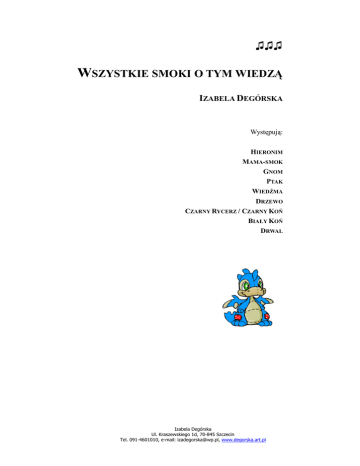 ♫♫♫ WSZYSTKIE SMOKI O TYM WIEDZĄ IZABELA DEGÓRSKA Występują: HIERONIM MAMA-SMOK GNOM PTAK WIEDŹMA DRZEWO CZARNY RYCERZ / CZARNY KOŃ BIAŁY KOŃ DRWAL Izabela Degórska Ul. Kraszewskiego 1d, 70-845 Szczecin Tel. 091-4601010, e-mail: [email protected], www.degorska.art.pl Scena 1. Hieronim budzi się w koszyku, szeroko ziewa, wyciąga, potem przygląda się swoim łapom. Mama-smok wrzuca do kotła muchomory, miesza w garnku. MAMA-SMOK ♫ Wszystkie smoki o tym wiedzą, smocze dziecko rośnie wiek, Nim dorośnie, nim jest duże, każdy smoczek o tym wie. HIERONIM Mamusiu, czy ja już jestem duży? MAMA-SMOK O, jeszcze nie. HIERONIM A dlaczego? Umiem latać, wszystko jem i co rano wyciągam szyję i ogon, żeby były dłuższe. MAMA-SMOK To nie wystarczy. Ale nie martw się, jeszcze jakieś sto lat i będziesz zupełnie duży. HIERONIM Sto lat? Jeszcze sto lat?! To strasznie długo! A po czym poznam, że jestem duży? MAMA-SMOK Będziesz silny, mądry i będziesz umiał ziać ogniem. HIERONIM Aha. Ale ja jestem silny i mądry i… chyba zaraz będę pluł ogniem, bo tak mi w środku coś burczy. MAMA-SMOK Pewnie jesteś głodny. HIERONIM Tak, teraz czuję, że jestem głodny. Zjadłbym nawet rycerza z kopytami! Mama-smok przerywa mieszanie w garnku. 2 MAMA-SMOK Fe, synku! Rycerze są niezdrowi. Pamiętaj, nigdy nie połykaj rycerzy, bo ci zardzewieją w brzuchu. HIERONIM Aha, nie połykać rycerzy. MAMA-SMOK Właśnie. I pamiętaj, oni nie mają kopyt. Oj, musisz się jeszcze dużo nauczyć, zanim zobaczysz świat. HIERONIM A tu, gdzie jesteśmy, to nie jest cały świat? MAMA-SMOK Nie, to nasza jaskinia. MAMA-SMOK ♫ Może to cię zdziwi bardzo Ale prawda taka jest Że świat większy od skorupki, Dużo większy nawet jest Tam, gdzie kończy się jaskinia Właśnie świat zaczyna się Lecz nie zawsze w nim bezpiecznie Dla malutkich smoków jest. HIERONIM Ale ja jestem bardzo odważnym smokiem. I chcę zobaczyć świat. Natychmiast. MAMA-SMOK Nie da rady. Świat jest za duży. Lepiej coś zjedz. Mmm, dziś na obiad pyszna zupka z muchomorów. Karmi smoczka. HIERONIM Błeee, ohyda! Jestem smokiem, a nie muchą! I chcę zobaczyć świat! Teraz! MAMA-SMOK Świat nie ucieknie. Spróbuj, przecież byłeś głodny. Kończy go karmić. Hieronim jest niepocieszony. 3 MAMA-SMOK Kiedy wrócę, pokażę ci las. A teraz masz tu skrzynię pełną skarbów. Baw się grzecznie i nie fruwaj po jaskini. Mama-smok wychodzi. HIERONIM Też coś, „baw się grzecznie”! A ja wcale nie jestem grzecznym smokiem. I właśnie, że będę latał po jaskini. (przelatuje kawałek) Ciągle tylko zabawki… mam tego dość! Ze złością kopie w skrzynię. Skrzynia się przewraca. Wysypują się z niej skarby oraz mały gnom z workiem. Gnom wrzeszczy i rzuca się do ucieczki. Kiedy spostrzega Hieronima uspokaja się. GNOM Ale mnie przestraszyłeś! Myślałem, że to smok. HIERONIM Jestem smokiem! Spójrz na mój ogon i skrzydła! GNOM Smoki są większe. Może jesteś jaszczurką? HIERONIM Smokiem! Na imię mam Hieronim. A ty kim jesteś? GNOM Chyba widać. PIOSENKA GNOMA ♫ Cóż za dziwne to pytanie Wszyscy wiedzą wszak Kto się tutaj wciąż zakrada Nocą i za dnia. Jestem gnomem z wielkim nosem Chyba widzisz sam I uszami jak nietoperz Piękne uszy mam! A że to wśród gnomów walor Cudnie też się zwę Gnom Szkaradek mnie nazwali Oto imię me! (do siebie) Gdzie mój worek? 4 HIERONIM A co ty właściwie robisz w moich skarbach? GNOM (myszkuje w skarbach) Co robisz, co robisz. Ładne są, to je sobie… oglądam. Tak, oglądam! Macie tu pełno niepotrzebnych rzeczy. O, na przykład siedmiomilowe buty. Po co to smokowi? HIERONIM A może się pobawimy? Będziesz moim rumakiem. Wskoczę na ciebie i… GNOM Wykluczone. Nie mam grzywy. (znajduje częściowo wypchany worek i mruczy do siebie) No, jednak jest! HIERONIM Ale grzywa… Grzywa wcale nie potrzebna. Zarzucę ci tylko latający dywan… GNOM Dywan? Latający dywan? HIERONIM Haftowany złotem. GNOM A, taki. Czemu nie? (zabiera latający dywan) HIERONIM Zostaniesz moim rumakiem? GNOM Wykluczone, nie bawię się ze smokami. (spogląda na Hieronima z irytacją) Będziesz tu cały czas nade mną stał? Idź sobie na dwór! Nie lubię, jak mi ktoś przeszkadza, kiedy oglądam skarby. (odkłada niektóre skarby na jedną kupkę) HIERONIM Ale… Jak to na dwór? Tak sam? Odkłada niektóre skarby na jedną kupkę. GNOM Pewnie, że sam! Mnóstwo tam ciekawych rzeczy. Polataj sobie po dworze, pooglądaj z góry widoczki. 5 HIERONIM Oj, bardzo bym chciał! GNOM To na co czekasz? Jesteś smokiem, czy nie? HIERONIM No jestem! GNOM To musisz być odważny. HIERONIM (chełpliwie) O, jestem bardzo odważny! GNOM I silny. HIERONIM Mówisz, jakbyś mnie znał od skorupki. Po prostu cały ja! GNOM To leć! Smoki nie siedzą w jaskiniach! HIERONIM To lecę! Hieronim wychodzi, podskakuje z emocji. Gnom zagarnia pod siebie skarby i całuje je. GNOM Moje skarby! Moje, moje! Scena 2. Las przed jaskinią. Hieronim rozgląda się ciekawie, przygląda się śpiewającym ptakom. PTAKI ♫ Kiedy świat oddycha wiosną, Kiedy z pąków strzela zieleń Wszystkie ptaki śpiew radosny, Niesie w niebo ponad knieje. W szumie liści, skrzypie drzewa, nawet w marnej garści ziemi Trwa zaklęta mądrość lasu, lecz dokładnie gdzie, nikt nie wie. 6 HIERONIM Ależ jesteście pierzaste i ćwierkające! (wesoło podskakuje, ptaki odlatują spłoszone, jeden zostaje na najwyższej gałęzi) Hej, poczekaj, pobawimy się! PTAK Coś takiego, z tobą?! Idź sobie, no idź! HIERONIM Jak to mam sobie iść? Dopiero przyszedłem. PTAK Sio, smok, sio! Wszyscy wiedzą jakie jesteście. Teraz, kiedy jesteś nie większy od jaszczurki to tiu-tiu-tiu, milutki taki. A potem… (wstrząsa ze strachu główką i odlatuje) HIERONIM Zaczekaj, chcę tylko… Smok rusza dalej. Wpada na głaz. Kamień porusza się. Okazuje się, że jest to przykryta ciemną peleryną wiedźma. HIERONIM Oj, przepraszam, m