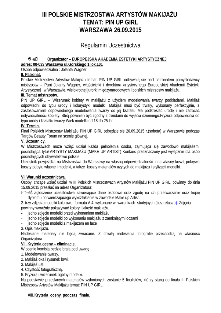 III POLSKIE MISTRZOSTWA ARTYSTÓW MAKIJAŻU TEMAT: PIN UP GIRL WARSZAWA 26.09.2015 Regulamin Uczestnictwa I. Organizator – EUROPEJSKA AKADEMIA ESTETYKI ARTYSTYCZNEJ adres: 00-033 Warszawa ul.Górskiego 1 lok.101 Osoba odpowiedzialna : Jolanta Wagner II. Patronat. Polskie Mistrzostwa Artystów Makijażu temat: PIN UP GIRL odbywają się pod patronatem pomysłodawcy mistrzostw – Pani Jolanty Wagner, właścicielki i dyrektora artystycznego Europejskiej Akademii Estetyki Artystycznej w Warszawie, wielokrotnej jurorki międzynarodowych i polskich mistrzostw makijażu. III. Temat mistrzostw. PIN UP GIRL – Wizerunek kobiety w makijażu z użyciem modelowania twarzy podkładami. Makijaż odpowiedni do typu urody i kolorystyki modelki. Makijaż musi być trwały, wykonany perfekcyjnie, z zastosowaniem odpowiedniego modelowania twarzy do jej kształtu Ma podkreślać urodę i nie zatracać indywidualności kobiety. Strój powinien być zgodny z trendami do wyjścia dziennego.Fryzura odpowiednia do typu urody i kształtu twarzy.Wiek modelki od 18 do 25 lat. IV. Termin. Finał Polskich Mistrzostw Makijażu PIN UP GIRL odbędzie się 26.09.2015 r.(sobota) w Warszawie podczas Targów Beauty Forum na scenie głównej. V. Uczestnicy. W Mistrzostwach może wziąć udział każda pełnoletnia osoba, zajmująca się zawodowo makijażem, posiadająca tytuł ARTYSTY MAKIJAŻU (MAKE UP ARTIST) Konkurs przeznaczony jest wyłącznie dla osób posiadających obywatelstwo polskie. Uczestnik przyjeżdża na Mistrzostwa do Warszawy na własną odpowiedzialność i na własny koszt, pokrywa koszty pobytu własne i modelki, a także koszty materiałów użytych do makijażu i stylizacji modelki. VI. Warunki uczestnictwa. Osoby, chcące wziąć udział w III Polskich Mistrzostwach Artystów Makijażu PIN UP GIRL, powinny do dnia 15.09.2015 przesłać na adres Organizatora: 1. Zgłoszenie uczestnictwa zawierające dane osobowe oraz zgodę na ich przetwarzanie oraz kopię dyplomu potwierdzającego wykształcenie w zawodzie Make up Artist. 2. trzy zdjęcia modelki kolorowe formatu A 4, wykonane w warunkach studyjnych (bez retuszu). Zdjęcia powinny wyraźnie pokazywać kolory i jakość makijażu. - jedno zdjęcie modelki przed wykonaniem makijażu - jedno zdjęcie modelki po wykonaniu makijażu z zamkniętymi oczami - jedno zdjęcie modelki z makijażem en face 3. Opis makijażu. Nadesłane materiały nie będą zwracane. Z chwilą nadesłania fotografie przechodzą na własność Organizatora. VII. Kryteria oceny – eliminacje. W ocenie komisja będzie brała pod uwagę : 1. Modelowanie twarzy. 2. Makijaż oka i rysunek brwi. 3. Makijaż ust. 4. Czystość fotograficzną. 5. Fryzura i wizerunek ogólny modelki. Na podstawie przesłanych materiałów wyłonionych zostanie 5 finalistów, którzy staną do finału III Polskich Mistrzostw Artystów Makijażu temat: PIN UP GIRL. VIII.Kryteria oceny podczas finału. 1.Podkład / modelowanie twarzy podkładami 2. Brwi / oczy / modelowanie powieki 3. Usta / konturowanie 4. Technika i czystość pracy 5. Wrażenie ogólne Czas wykonania całości makijażu – 30 minut. Makijaż permanentny u modelki wyklucza z udziału w konkursie. W czasie finału Organizator zapewnia: krzesło do makijażu, stolik na przybory. IX. Jury konkursu. 1. Jury konkursu powołuje patron imprezy – Pani Jolanta Wagner. 2. Jury konkursu ocenia, przyznaje nagrody i wyróżnienia, a także interpretuje regulamin. 3. Finalista z własnej woli poddaje się ocenie i krytyce członków Jury. 4. Ocena i interpretacja Jury jest ostateczna i nie podlega odwołaniu. Żadne odwołania od decyzji Jury nie będą uwzględniane. 5. Posiedzenie Jury odbędzie się po zakończeniu prezentacji makijaży 26.09.2015 r. X. Nagrody. Ogłoszenie wyników i ceremonia wręczenia nagród odbędzie się 26 września 2015 r. na scenie głównej. I miejsce Puchar, Szkolenie Wizażysty w EAEA, nagrody rzeczowe sponsorowane o wartości 2000zł, , dyplom. (ogólna wartość 4500 zł ) II miejsce Szkolenie Wizażysty w EAEA, nagrody rzeczowe sponsorowane o wartości 1000zł, dyplom.(ogólna wartość 3100zł) III miejsce Szkolenie Wizażysty w EAEA, nagrody rzeczowe sponsorowane o wartości 500zł, dyplom.(ogólna wartość 2600zł) IV i V miejsce Nagrody rzeczowe sponsorowane o wartości 300zł, dyplom. Nagrody nie podlegają zamianie na inne, ani zamianie na ekwiwalent pieniężny. XI. Przepisy końcowe. 1. Nadesłanie zgłoszenia udziału w konkursie stanowi jednocześnie deklarację, że osoba nadsyłająca zdjęcie jest autorem koncepcji i wykonania sfotografowanych makijaży. 2. Nadesłanie zgłoszenia udziału w konkursie jest jednocześnie oświadczeniem, że autor wyjaśnił prawa osób portretowanych i osoby sportretowane wyrażają zgodę na ich publikację dla celów promocyjnych konkursu oraz, że autor przyjmuje na siebie wszelkie roszczenia jakiejkolwiek natury, które osoby trzecie mogłyby kierować przeciwko organizatorowi Konkursu. 3. Nadsyłając zgłoszenie udziału w konkursie uczestnik konkursu tym samym przyjmuje warunki Regulaminu konkursu i wyraża zgodę na przetwarzanie swoich danych osobowych zgodnie z ustawą o Ochronie Danych Osobowych ( Dz.U.Nr.133 pozycja 883). 4. Udział w konkursie jest jednoznaczny z nieodpłatnym udzieleniem prawa do wykorzystywania przez Organizatora zdjęć z przebiegu konkursu w następujących polach eksploatacji: druku w dowolnej liczbie publikacji i w dowolnym nakładzie, używania ich w Internecie oraz w innych formach utrwaleń, nadających się do rozpowszechniania w ramach działań Organizatora w zakresie związanym z promocją konkursu. 5. W konkursie nie mogą brać udziału pracownicy Organizatora oraz innych firm współpracujących przy organizacji i przeprowadzeniu konkursu ani członkowie najbliższej rodziny pracowników tych podmiotów. 6. Niniejszy Regulamin wchodzi w życie z dniem rozpoczęcia konkursu i obowiązuje do czasu jego zakończenia. W sp
