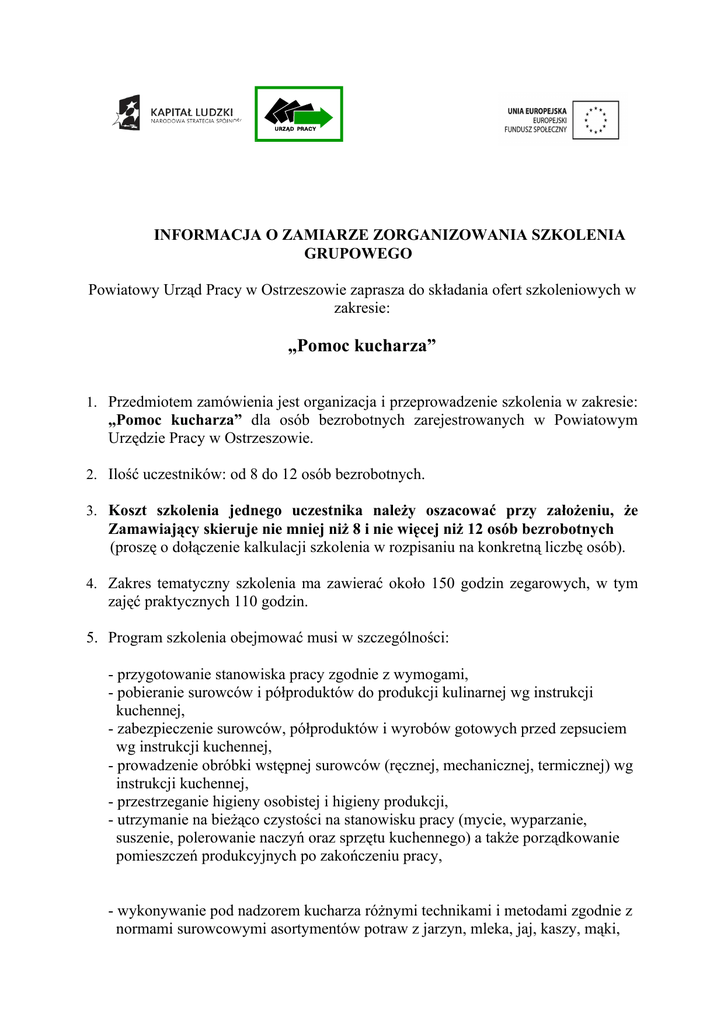 INFORMACJA O ZAMIARZE ZORGANIZOWANIA SZKOLENIA GRUPOWEGO Powiatowy Urząd Pracy w Ostrzeszowie zaprasza do składania ofert szkoleniowych w zakresie: „Pomoc kucharza” 1. Przedmiotem zamówienia jest organizacja i przeprowadzenie szkolenia w zakresie: „Pomoc kucharza” dla osób bezrobotnych zarejestrowanych w Powiatowym Urzędzie Pracy w Ostrzeszowie. 2. Ilość uczestników: od 8 do 12 osób bezrobotnych. 3. Koszt szkolenia jednego uczestnika należy oszacować przy założeniu, że Zamawiający skieruje nie mniej niż 8 i nie więcej niż 12 osób bezrobotnych (proszę o dołączenie kalkulacji szkolenia w rozpisaniu na konkretną liczbę osób). 4. Zakres tematyczny szkolenia ma zawierać około 150 godzin zegarowych, w tym zajęć praktycznych 110 godzin. 5. Program szkolenia obejmować musi w szczególności: - przygotowanie stanowiska pracy zgodnie z wymogami, - pobieranie surowców i półproduktów do produkcji kulinarnej wg instrukcji kuchennej, - zabezpieczenie surowców, półproduktów i wyrobów gotowych przed zepsuciem wg instrukcji kuchennej, - prowadzenie obróbki wstępnej surowców (ręcznej, mechanicznej, termicznej) wg instrukcji kuchennej, - przestrzeganie higieny osobistej i higieny produkcji, - utrzymanie na bieżąco czystości na stanowisku pracy (mycie, wyparzanie, suszenie, polerowanie naczyń oraz sprzętu kuchennego) a także porządkowanie pomieszczeń produkcyjnych po zakończeniu pracy, - wykonywanie pod nadzorem kucharza różnymi technikami i metodami zgodnie z normami surowcowymi asortymentów potraw z jarzyn, mleka, jaj, kaszy, mąki, - posługiwanie się narzędziami, maszynami i urządzeniami przy przygotowaniu potraw i napojów, - wykonywanie bieżącej konserwacji maszyn i urządzeń kuchennych, - wykończenie, porcjowanie, dekorowanie i estetyczne wydanie wyrobów kulinarnych pod ścisłym nadzorem kucharza, - przestrzeganie przepisów sanitarnych, bhp i ppoż. Obowiązujących w zakładach zbiorowego żywienia. 6. Szkolenie należy zrealizować według planu nauczania obejmującego przeciętnie nie mniej niż 30 godzin zegarowych w tygodniu przypadających na jednego uczestnika, w myśl art. 40 ust. 4 ustawy o promocji zatrudnienia i instytucjach rynku pracy (1 godzina zegarowa = 45 min zajęć dydaktycznych + 15 min przerwy). 7. Każdy uczestnik szkolenia, w ramach kursu, powinien otrzymać na własność niezbędne materiały dydaktyczne, m.in.: zeszyt, długopis oraz inne materiały szkoleniowe niezbędne do prawidłowej realizacji szkolenia. 8. Wykonawca musi dysponować salą dostosowaną dla minimum 8 uczestników. 9. Do realizacji zadania Wykonawca zobowiązany jest wskazać osoby o odpowiednich kwalifikacjach niezbędnych do prawidłowej realizacji szkolenia objętego przedmiotem umowy. 10. Każdy uczestnik po pozytywnym ukończeniu szkolenia musi otrzymać zaświadczenie o jego ukończeniu, w myśl Rozporządzenia Ministra Edukacji i Nauki z dnia 3 lutego 2006 r. w sprawie uzyskiwania i uzupełniania przez osoby dorosłe wiedzy ogólnej, umiejętności i kwalifikacji zawodowych w formach pozaszkolnych (Dz. U. 2006 nr 31 poz. 216 z późn. zm.). 11. Szkolenie należy zakończyć egzaminem. 12. Wykonawca musi posiadać upoważnienie do prowadzenia działalności szkoleniowej w w/w zakresie oraz wpis do rejestru instytucji szkoleniowej Wojewódzkiego Urzędu Pracy. 13. W przypadku szkolenia organizowanego poza granicami miasta Ostrzeszów, w koszcie szkolenia należy uwzględnić i wyszczególnić ewentualne koszty dojazdu. 14. Wykonawca zobowiązany jest podać dokładny adres realizacji szkolenia. Zamawiający, przed wyborem instytucji szkoleniowej, zastrzega sobie prawo do sprawdzenia bazy lokalowej, w której odbywać będą się zajęcia w ramach szkolenia objętego rozeznaniem. 15. Propozycję szkoleniową należy złożyć według wzoru „Oferty szkoleniowej” stanowiącego załącznik do niniejszej informacji do dnia 07.10.2009r. do godziny 12:00. Propozycje szkoleniowe można składać drogą elektroniczną na adres: [email protected] lub w sekretariacie Powiatowego Urzędu Pracy w Ostrzeszowie. 16. Wykonawca pozostanie związany propozycją szkoleniową terminem wskazanym w ofercie szkoleniowej. 17. Propozycje szkoleniowe, które nie będą złożone zgodnie ze wzorem „Oferty szkoleniowej”, stanowiącym załącznik do niniejszej informacji, nie będą podlegały ocenie. 18. Prawidłowo złożone „Oferty szkoleniowe” zostaną ocenione zgodnie z „Kryteriami wyboru instytucji szkoleniowej do przeprowadzania szkoleń” wprowadzonymi Zarządzeniem nr 5/2009 Dyrektora Powiatowego Urzędu Pracy w Ostrzeszowie z dnia 12.03.2009 r., dostępnymi na stronie internetowej www.apraca.pl/poos/. 19. Zamawiający zastrzega sobie prawo do unieważnienia rozeznania rynku w każdej chwili, bez podania przyczyny lub odstąpienia od realizacji szkolenia objętego w/w informacją. Z-ca Dyrektora mgr Ewa Rycerska