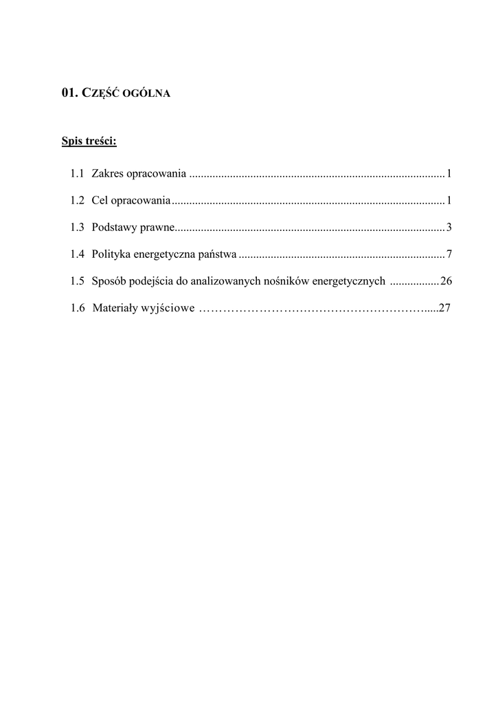 01. CZĘŚĆ OGÓLNA Spis treści: 1.1 Zakres opracowania ........................................................................................ 1 1.2 Cel opracowania .............................................................................................. 1 1.3 Podstawy prawne............................................................................................. 3 1.4 Polityka energetyczna państwa ....................................................................... 7 1.5 Sposób podejścia do analizowanych nośników energetycznych ................. 26 1.6 Materiały wyjściowe ………………………………………………….....27 Założenia do planu zaopatrzenia w ciepło, energię elektryczna i paliwa gazowe Gminy Chrząstowice na lata 2010 - 2025 1.1. Zakres opracowania Zakres „Projektu założeń do planu zaopatrzenia w ciepło, energię elektryczną i paliwa gazowe dla Gminy Chrząstowice wynika z ustawy „Prawo energetyczne’’ (Dz.U. z 2006r., Nr 89, poz. 625 z późn. zm.) i obejmuje m.in.: ocenę stanu aktualnego i przewidywanych zmian zapotrzebowania na ciepło, energię elektryczną i paliwa gazowe, przedsięwzięcia racjonalizujące użytkowanie ciepła, energii elektrycznej i paliw gazowych, możliwości wykorzystania istniejących nadwyżek i lokalnych zasobów paliw i energii, z uwzględnieniem skojarzonego wytwarzania ciepła i energii elektrycznej oraz zagospodarowania ciepła odpadowego z instalacji przemysłowych, zakres współpracy z innymi gminami. Tematyka ta została ujęta w rozdziałach niniejszego opracowania. 1.2. Cel opracowania Celem niniejszego opracowania jest m.in.: Umożliwienie podejmowania decyzji energetycznego gminy Chrząstowice w celu zapewnienia bezpieczeństwa Termin bezpieczeństwo energetyczne powinien ujmować z jednej strony analizę stanu technicznego systemów energetycznych wraz z istniejącymi potrzebami, a z drugiej strony analizę możliwości pokrycia przyszłych potrzeb energetycznych. W niniejszym opracowaniu zawarto ocenę stanu technicznego poszczególnych podmiotów energetycznych (system ciepłowniczy, elektroenergetyczny i gazowniczy), która określa poziom bezpieczeństwa energetycznego gminy Chrząstowice. Sporządzony bilans potrzeb energetycznych w zakresie ciepła oraz w zakresie energii elektrycznej i gazu oraz prognoza zapotrzebowania na nośniki energii dają obraz sytuacji w zakresie obecnego i przyszłego zapotrzebowania na ciepło, energię elektryczną oraz gaz. Przedstawiony w opracowaniu obraz sytuacji obecnej oraz prognozowane przyszłe potrzeby energetyczne gminy Chrząstowice stanowią podstawę podejmowania decyzji dotyczących zaopatrzenia w nośniki energetyczne na terenie gminy. 1 Założenia do planu zaopatrzenia w ciepło, energię elektryczna i paliwa gazowe Gminy Chrząstowice na lata 2010 - 2025 Obniżenie kosztów rozwoju społeczno-gospodarczego regionu poprzez wskazanie optymalnych sposobów realizacji potrzeb energetycznych Dla obniżenia kosztów rozwoju społeczno gospodarczego konieczne jest lokowanie nowych inwestycji tam, gdzie występują rezerwy zasilania energetycznego. Wykorzystanie rezerw zasilania do zaopatrzenia w nośniki energii nowych odbiorców pozwoli na zminimalizowanie nakładów inwestycyjnych związanych z modernizacją lub rozbudową poszczególnych systemów (ciepłowniczy, elektroenergetyczny i gazowniczy), co pozwoli na ograniczenie ryzyka ponoszonego przez podmioty energetyczne. Inwentaryzacja stanu istniejącego systemu energetycznego gminy Chrząstowice pozwala na określenie rezerw zasilania oraz wskazanie w których obszarach te rezerwy są największe i powinny zostać wykorzystane w sposób maksymalny. Ułatwienie podejmowania decyzji o lokalizacji inwestycji przemysłowych, usługowych i mieszkaniowych Ułatwienie podejmowania decyzji o lokalizacji inwestycji przemysłowych, usługowych i mieszkaniowych rozumie się z jednej strony jako określenie obszarów w których istnieją nadwyżki w zakresie poszczególnych systemów przesyłowych na poziomie adekwatnym do potrzeb, a z drugiej jako analiza możliwości terenowych rozumianych jako określenie na poziomie rezerw terenowych wynikających z kierunków rozwoju Gminy Chrząstowice. Wskazanie kierunków rozwoju zaopatrzenia w energię, które mogą być wspierane ze środków publicznych Przedstawiona analiza systemów energetycznych oraz prognozy zapotrzebowania na ciepło i energię elektryczną będą pomocne przy podejmowaniu decyzji w zakresie wspierania inwestycji zaopatrzenia energetycznego, tym samym ułatwiając proces wyboru zgłaszanych wniosków o wsparcie. Umożliwienie maksymalnego wykorzystania energii odnawialnej Istotą maksymalnego wykorzystania energii odnawialnej jest określenie stanu aktualnego, a następnie ocena możliwości rozwojowych. Ważne jest więc podanie elementów charakterystycznych poszczególnych gałęzi energetyki odnawialnej, w tym m.in.: potencjału energetycznego, lokalizacji, możliwości rozwojowych oraz aspektów prawnych. 2 Założenia do planu zaopatrzenia w ciepło, energię elektryczna i paliwa gazowe Gminy Chrząstowice na lata 2010 - 2025 1.3. Podstawy prawne Niniejszy „Projekt założeń..." opracowany jest w oparciu o art.7, ust. 1 pkt 3 ustawy o samorządzie gminnym oraz art. 18 i 19 ustawy „Prawo energetyczne". Ustawa z dnia 08 marca 1990 „Ustawa o Samorządzie Gminnym" (Dz. U. 142 poz. 1591 z 2001r. z późn. zm.): Art.7 1. Zaspokajanie zbiorowych potrzeb wspólnoty należy do zadań własnych gminy. W szczególności zadania własne obejmują sprawy: 1) ładu przestrzennego, gospodarki nieruchomościami, ochrony środowiska i przyrody oraz gospodarki wodnej, 2) gminnych dróg, ulic, mostów, placów oraz organizacji ruchu drogowego, 3) wodociągów i zaopatrzenia w wodę, kanalizacji, usuwania i oczyszczania ścieków komunalnych, sanitarnych, utrzymania wysypisk i czystości i unieszkodliwiania porządku odpadów oraz