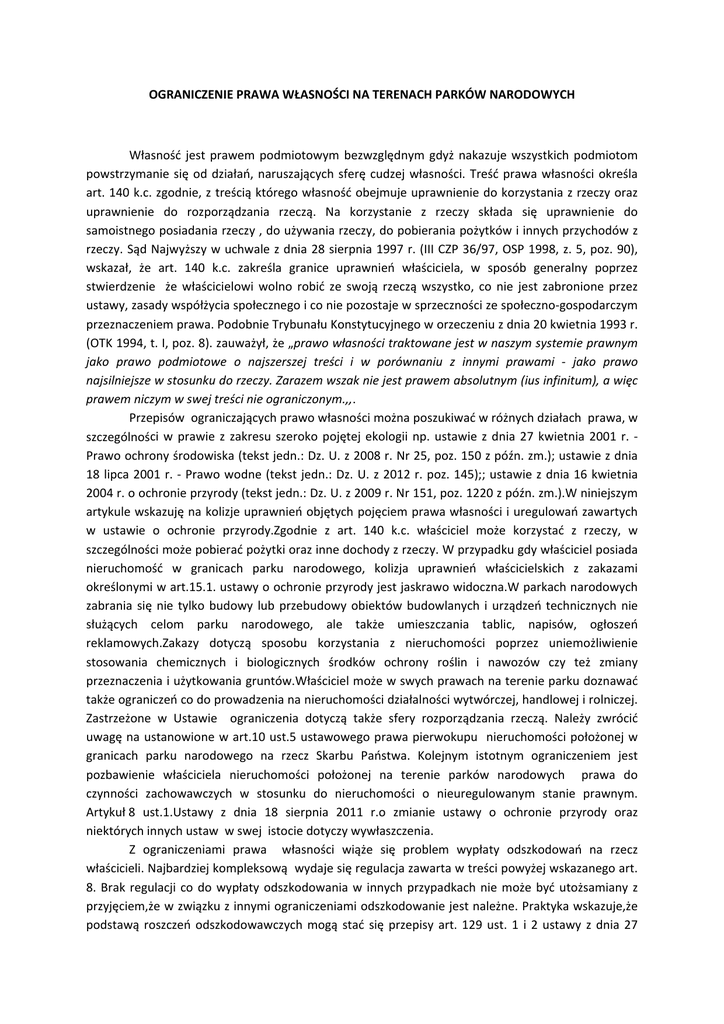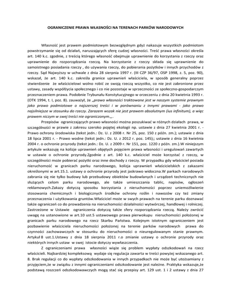 OGRANICZENIE PRAWA WŁASNOŚCI NA TERENACH PARKÓW NARODOWYCH Własność jest prawem podmiotowym bezwzględnym gdyż nakazuje wszystkich podmiotom powstrzymanie się od działań, naruszających sferę cudzej własności. Treść prawa własności określa art. 140 k.c. zgodnie, z treścią którego własność obejmuje uprawnienie do korzystania z rzeczy oraz uprawnienie do rozporządzania rzeczą. Na korzystanie z rzeczy składa się uprawnienie do samoistnego posiadania rzeczy , do używania rzeczy, do pobierania pożytków i innych przychodów z rzeczy. Sąd Najwyższy w uchwale z dnia 28 sierpnia 1997 r. (III CZP 36/97, OSP 1998, z. 5, poz. 90), wskazał, że art. 140 k.c. zakreśla granice uprawnień właściciela, w sposób generalny poprzez stwierdzenie że właścicielowi wolno robić ze swoją rzeczą wszystko, co nie jest zabronione przez ustawy, zasady współżycia społecznego i co nie pozostaje w sprzeczności ze społeczno‐gospodarczym przeznaczeniem prawa. Podobnie Trybunału Konstytucyjnego w orzeczeniu z dnia 20 kwietnia 1993 r. (OTK 1994, t. I, poz. 8). zauważył, że „prawo własności traktowane jest w naszym systemie prawnym jako prawo podmiotowe o najszerszej treści i w porównaniu z innymi prawami ‐ jako prawo najsilniejsze w stosunku do rzeczy. Zarazem wszak nie jest prawem absolutnym (ius infinitum), a więc prawem niczym w swej treści nie ograniczonym.,,. Przepisów ograniczających prawo własności można poszukiwać w różnych działach prawa, w szczególności w prawie z zakresu szeroko pojętej ekologii np. ustawie z dnia 27 kwietnia 2001 r. ‐ Prawo ochrony środowiska (tekst jedn.: Dz. U. z 2008 r. Nr 25, poz. 150 z późn. zm.); ustawie z dnia 18 lipca 2001 r. ‐ Prawo wodne (tekst jedn.: Dz. U. z 2012 r. poz. 145);; ustawie z dnia 16 kwietnia 2004 r. o ochronie przyrody (tekst jedn.: Dz. U. z 2009 r. Nr 151, poz. 1220 z późn. zm.).W niniejszym artykule wskazuję na kolizje uprawnień objętych pojęciem prawa własności i uregulowań zawartych w ustawie o ochronie przyrody.Zgodnie z art. 140 k.c. właściciel może korzystać z rzeczy, w szczególności może pobierać pożytki oraz inne dochody z rzeczy. W przypadku gdy właściciel posiada nieruchomość w granicach parku narodowego, kolizja uprawnień właścicielskich z zakazami określonymi w art.15.1. ustawy o ochronie przyrody jest jaskrawo widoczna.W parkach narodowych zabrania się nie tylko budowy lub przebudowy obiektów budowlanych i urządzeń technicznych nie służących celom parku narodowego, ale także umieszczania tablic, napisów, ogłoszeń reklamowych.Zakazy dotyczą sposobu korzystania z nieruchomości poprzez uniemożliwienie stosowania chemicznych i biologicznych środków ochrony roślin i nawozów czy też zmiany przeznaczenia i użytkowania gruntów.Właściciel może w swych prawach na terenie parku doznawać także ograniczeń co do prowadzenia na nieruchomości działalności wytwórczej, handlowej i rolniczej. Zastrzeżone w Ustawie ograniczenia dotyczą także sfery rozporządzania rzeczą. Należy zwrócić uwagę na ustanowione w art.10 ust.5 ustawowego prawa pierwokupu nieruchomości położonej w granicach parku narodowego na rzecz Skarbu Państwa. Kolejnym istotnym ograniczeniem jest pozbawienie właściciela nieruchomości położonej na terenie parków narodowych prawa do czynności zachowawczych w stosunku do nieruchomości o nieuregulowanym stanie prawnym. Artykuł 8 ust.1.Ustawy z dnia 18 sierpnia 2011 r.o zmianie ustawy o ochronie przyrody oraz niektórych innych ustaw w swej istocie dotyczy wywłaszczenia. Z ograniczeniami prawa własności wiąże się problem wypłaty odszkodowań na rzecz właścicieli. Najbardziej kompleksową wydaje się regulacja zawarta w treści powyżej wskazanego art. 8. Brak regulacji co do wypłaty odszkodowania w innych przypadkach nie może być utożsamiany z przyjęciem,że w związku z innymi ograniczeniami odszkodowanie jest należne. Praktyka wskazuje,że podstawą roszczeń odszkodowawczych mogą stać się przepisy art. 129 ust. 1 i 2 ustawy z dnia 27 kwietnia 2001 r. ‐ Prawo ochrony środowiska. Zgodnie z art.129 ust. 2 ,,W związku z ograniczeniem sposobu korzystania z nieruchomości jej właściciel może żądać odszkodowania za poniesioną szkodę; szkoda obejmuje również zmniejszenie wartości nieruchomości.,, Poniżej przedstawiam uzasadnienie wyroku Sądu Najwyższego z dnia 27 czerwca 2012 r. sygn. akt IV CSK 28/12 ;,, Zgodnie z poglądem jaki w skardze kasacyjnej przedstawili powodowie, odszkodowanie miałoby służyć w każdym przypadku ograniczenia sposobu korzystania z nieruchomości (niezależnie od ograniczeń istniejących wcześniej). Stanowisko takie jest nietrafne. W takim bowiem przypadku roszczenia z art. 129 ust. 1 i 2 ustawy, odżywałyby w związku z każdą zmianą aktu prawnego utrzymującego istniejące już ograniczenia, także w sytuacji, gdy w drodze nowelizacji przepisów lub wprowadzania nowych regulacji w miejsce dotychczasowych prawodawca decydowałby się na utrzymanie ograniczeń istniejących wcześniej. W takim wypadku odpowiedzialność odszkodowawcza oderwana byłaby od samych ograniczeń (zwiększenia, zmiany tych ograniczeń). Odpowiedzialność odszkodowawczą przewidziano nie za samo ograniczenie i nie za każde ograniczenie sposobu korzystania z nieruchomości. Odszkodowanie nie rekompensuje zmiany dotychczasowej sytuacji właściciela nieruchomości, a tym bardziej utrzymywania już istniejących ograniczeń w przypadku zmiany aktu prawnego. Odszkodowanie służy bowiem za konkretną szkodę, która powstała w związku z ograniczeniem sposobu korzystania z nieruchomości, a nie za samo ograniczenie sposobu korzystania z nieruchomości. Konieczną przesłanką odpowiedzialności odszkodowawczej jest więc szkoda (por. postanowienie Sądu Najwyższego z dnia 24 lutego 2010 r., III CZP 128/09 ‐ niepubl.), której źródłem jest rozporządzenie lub akt