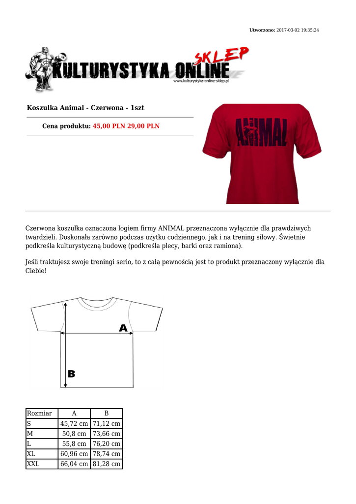 Utworzono: 2017-03-02 19:35:24 Koszulka Animal - Czerwona - 1szt Cena produktu: 45,00 PLN 29,00 PLN Czerwona koszulka oznaczona logiem firmy ANIMAL przeznaczona wyłącznie dla prawdziwych twardzieli. Doskonała zarówno podczas użytku codziennego, jak i na trening siłowy. Świetnie podkreśla kulturystyczną budowę (podkreśla plecy, barki oraz ramiona). Jeśli traktujesz swoje treningi serio, to z całą pewnością jest to produkt przeznaczony wyłącznie dla Ciebie! Rozmiar A B S 45,72 cm 71,12 cm M 50,8 cm 73,66 cm L 55,8 cm 76,20 cm XL 60,96 cm 78,74 cm XXL 66,04 cm 81,28 cm XXXL 71,12 cm 83,82 cm Adres: http://www.ko.sklep.pl/ Telefon: kom. 782 010 880 Email: [email protected]