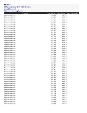 BRANCO Ul.Rzemieślnicza 13 97-400 Bełchatów [email protected] http://www.branco.pl/sklep/ Produkty Cena (brutto) Cena (netto) Sukienka model 1573 130,08 zł 105,76 zł Sukienka model 1512 113,82 zł 92,54 zł Sukienka model 1530 121,95 zł 99,15 zł Sukienka model 1531 113,82 zł 92,54 zł Sukienka model 1579 130,08 zł 105,76 zł Sukienka model 1580 130,08 zł 105,76 zł Sukienka model 1538 113,82 zł 92,54 zł Sukienka model 1591 121,95 zł 99,15 zł Sukienka model 1593 113,82 zł 92,54 zł Sukienka model 1592 113,82 zł 92,54 zł Sukienka model 1596 121,95 zł 99,15 zł Sukienka model 1595 113,82 zł 92,54 zł Sukienka model 1543 113,82 zł 92,54 zł Sukienka model 1545 121,95 zł 99,15 zł Sukienka model 4306 113,82 zł 92,54 zł Sukienka model 4304 113,82 zł 92,54 zł Sukienka model 1544 113,82 zł 92,54 zł Sukienka model 4310 113,82 zł 92,54 zł Sukienka model 4312 121,95 zł 99,15 zł Sukienka model 4313 121,95 zł 99,15 zł Sukienka model 4323 113,82 zł 92,54 zł Sukienka model 4324 121,95 zł 99,15 zł Sukienka model 4327 113,82 zł 92,54 zł Sukienka model 4328 113,82 zł 92,54 zł Sukienka model 4329 121,95 zł 99,15 zł Sukienka model 4330 121,95 zł 99,15 zł Sukienka model 4334 130,08 zł 105,76 zł Sukienka model 4335 130,08 zł 105,76 zł Sukienka model 4337 121,95 zł 99,15 zł Sukienka model 4338 113,82 zł 92,54 zł Sukienka model 4516 121,95 zł 99,15 zł Sukienka model 4518 121,95 zł 99,15 zł Sukienka model 4517 121,95 zł 99,15 zł Sukienka model 4519 121,95 zł 99,15 zł Sukienka model 4520 113,82 zł 92,54 zł Sukienka model 4522 121,95 zł 99,15 zł Sukienka model 4526 121,95 zł 99,15 zł Sukienka model 4527 121,95 zł 99,15 zł Sukienka model 4528 121,95 zł 99,15 zł Sukienka model 4530 121,95 zł 99,15 zł Sukienka model 4531 121,95 zł 99,15 zł Sukienka model 4529 121,95 zł 99,15 zł Sukienka model 4532 113,82 zł 92,54 zł Sukienka model 4336 121,95 zł 99,15 zł Sukienka model 4340 121,95 zł 99,15 zł Sukienka model 4339 121,95 zł 99,15 zł Cena promocyjna Sukienka model 4341 113,82 zł 92,54 zł Sukienka model 4438 121,95 zł 99,15 zł Sukienka model 4533 113,82 zł 92,54 zł Sukienka model 4534 113,82 zł 92,54 zł Sukienka model 4535 89,43 zł 72,71 zł Sukienka model 4343 121,95 zł 99,15 zł Sukienka model 4345 121,95 zł 99,15 zł Sukienka model 4344 121,95 zł 99,15 zł Sukienka model 4537 113,82 zł 92,54 zł Sukienka model 4536 113,82 zł 92,54 zł Sukienka model 4346 130,08 zł 105,76 zł Sukienka model 4347 113,82 zł 92,54 zł Sukienka model 4348 121,95 zł 99,15 zł Sukienka model 4538 121,95 zł 99,15 zł Sukienka model 4539 121,95 zł 99,15 zł Sukienka model 4452 130,08 zł 105,76 zł Sukienka model 4453 130,08 zł 105,76 zł Sukienka model 4540 121,95 zł 99,15 zł Sukienka model 4541 113,82 zł 92,54 zł Sukienka model 4542 113,82 zł 92,54 zł Sukienka model 4521 121,95 zł 99,15 zł Sukienka model 4525 121,95 zł 99,15 zł Sukienka model 4523 130,08 zł 105,76 zł Sukienka model 4515 130,08 zł 105,76 zł Sukienka model 4543 130,08 zł 105,76 zł Sukienka model 4462 130,08 zł 105,76 zł Sukienka model 4460 130,08 zł 105,76 zł Sukienka model 4461 130,08 zł 105,76 zł Sukienka model 4463 130,08 zł 105,76 zł Sukienka model 4464 138,21 zł 112,37 zł Sukienka model 4465 138,21 zł 112,37 zł Sukienka model 4349 121,95 zł 99,15 zł Sukienka model 4544 121,95 zł 99,15 zł Sukienka model 4545 113,82 zł 92,54 zł Sukienka model 4546 113,82 zł 92,54 zł