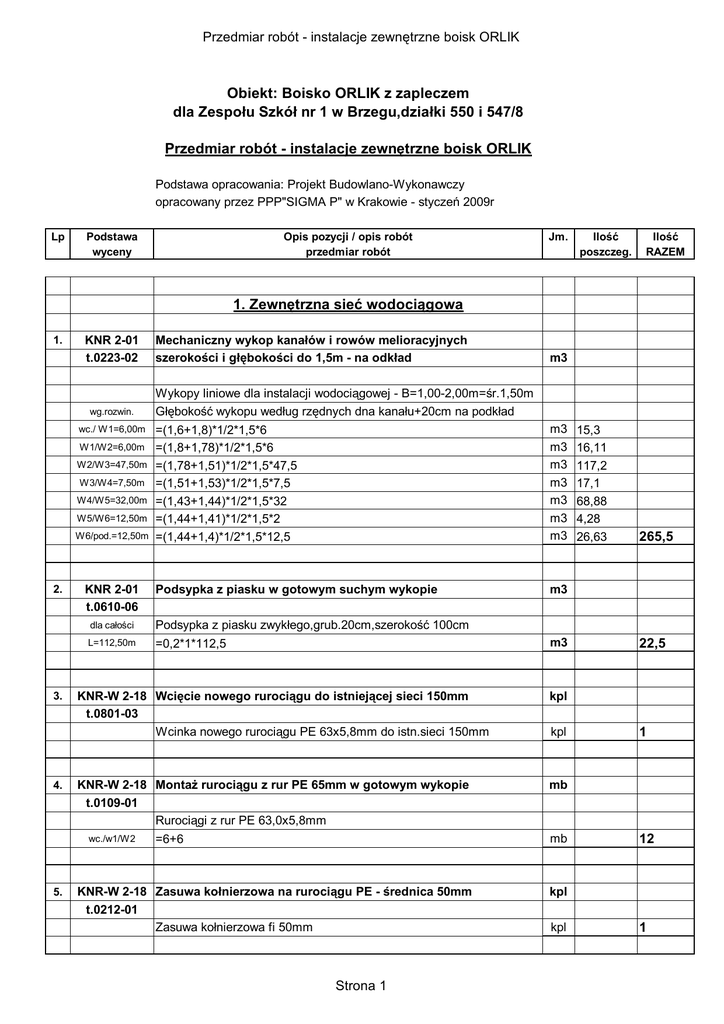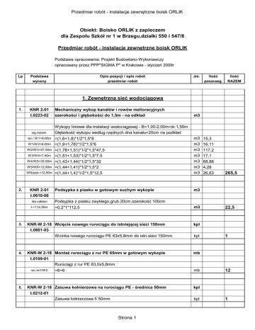 Przedmiar robót - instalacje zewnętrzne boisk ORLIK Obiekt: Boisko ORLIK z zapleczem dla Zespołu Szkół nr 1 w Brzegu,działki 550 i 547/8 Przedmiar robót - instalacje zewnętrzne boisk ORLIK Podstawa opracowania: Projekt Budowlano-Wykonawczy opracowany przez PPP"SIGMA P" w Krakowie - styczeń 2009r Lp Podstawa wyceny Opis pozycji / opis robót przedmiar robót Jm. Ilość poszczeg. Ilość RAZEM 1. Zewnętrzna sieć wodociągowa 1. KNR 2-01 t.0223-02 wg.rozwin. wc./ W1=6,00m W1/W2=6,00m W2/W3=47,50m W3/W4=7,50m W4/W5=32,00m W5/W6=12,50m W6/pod.=12,50m 2. 3. 4. KNR 2-01 t.0610-06 m3 Wykopy liniowe dla instalacji wodociągowej - B=1,00-2,00m=śr.1,50m Głębokość wykopu według rzędnych dna kanału+20cm na podkład =(1,6+1,8)*1/2*1,5*6 =(1,8+1,78)*1/2*1,5*6 =(1,78+1,51)*1/2*1,5*47,5 =(1,51+1,53)*1/2*1,5*7,5 =(1,43+1,44)*1/2*1,5*32 =(1,44+1,41)*1/2*1,5*2 =(1,44+1,4)*1/2*1,5*12,5 m3 m3 m3 m3 m3 m3 m3 Podsypka z piasku w gotowym suchym wykopie m3 dla całości Podsypka z piasku zwykłego,grub.20cm,szerokość 100cm L=112,50m =0,2*1*112,5 m3 KNR-W 2-18 Wcięcie nowego rurociągu do istniejącej sieci 150mm t.0801-03 Wcinka nowego rurociągu PE 63x5,8mm do istn.sieci 150mm kpl KNR-W 2-18 MontaŜ rurociągu z rur PE 65mm w gotowym wykopie t.0109-01 Rurociągi z rur PE 63,0x5,8mm mb wc./w1/W2 5. Mechaniczny wykop kanałów i rowów melioracyjnych szerokości i głębokości do 1,5m - na odkład kpl mb =6+6 KNR-W 2-18 Zasuwa kołnierzowa na rurociągu PE - średnica 50mm t.0212-01 Zasuwa kołnierzowa fi 50mm Strona 1 15,3 16,11 117,2 17,1 68,88 4,28 26,63 265,5 22,5 1 12 kpl kpl 1 Przedmiar robót - instalacje zewnętrzne boisk ORLIK Lp 6. 7. 8. 9. 10. 11. 12. 13. 14. 15. Podstawa wyceny Opis pozycji / opis robót przedmiar robót KNR 2-18 Studnia rewizyjna (wodomierzowa) śr.1,0m w gotowym wykopie t.0613-01x0,65 analogia Studnia wodomierzowa Stw1 D=1000mm,H=ca.2,00m Jm. kpl kpl KNR-W 2-18 MontaŜ trójnika fi 65mm na rurociagu PE t.0214-02 Trójnik COMBI Pn 6atm fi65mm kpl MontaŜ rurociągu z rur PE 40mm w gotowym wykopie Rurociągi z rur PE 40,0x3,7mm W2/podejścia =112,5-12 kpl kpl KNR-W 2-18 MontaŜ trójnika fi 40mm na rurociagu PE t.0214-01 analogia Trójnik COMBI Pn 6atm fi40mm kpl KNR-W 2-15 Zawory przelotowe na rurociągu PE 40mm,z kurkiem spustowym t.0132-05 Zawory przelotowe 40mm na rurociagu PE kpl KNR-W 2-15 Dodatek za wykonanie podejścia dopływowego 40mm t.0116-04 Wykonanie podejść dopływowych z rur PE fi 40mm szt KNR-W 2-15 Płukanie i dezynfekcja rurociągu jw. t.0128-02 KNR 2-01 t.0610-06 Zasypka z piasku w gotowym suchym wykopie Strona 2 1 1 1 mb mb KNR-W 2-15 Próba szczelności rurociągu o średnicy do 63mm - 1 próba t.0127-03 L=112,50m Próba szczelności rurociągów niemieszkalnych do 63mm Ilość RAZEM kpl KNR-W 2-15 Wodomierz śrubowy średnicy 50mm t.0141-01 Wodomierz 50mm w studzience KNR 0-13 t.0128-04 analogia Ilość poszczeg. kpl kpl szt 100,5 3 2 2 mb mb 112,5 mb 112,5 m3 Przedmiar robót - instalacje zewnętrzne boisk ORLIK Lp Podstawa wyceny Opis pozycji / opis robót przedmiar robót Jm. Ilość poszczeg. Ilość RAZEM Zasypka z piasku zwykłego,grub.20+20=40cm,szerokość 100cm L=112,50m 16. KNR 2-01 t.0320-02 =0,4*1*112,5 m3 Ręczne zasypywanie wykopów w gruncie kat.I-III z przerzutem do 3m m3 45 Objętość zasypu gruntem = wykopy jw. - zasypy piaskiem jw. m3 =265,5-22,5-45 17. KNR 2-01 Załadunek i odwóz nadmiaru gruntu kat.III t.0207-02 wykonywany za pomocą koparki 1,20m3 - odwóz do 5km +t.0214-04x8 Objętość zasypów - wg.bilansu jak wyŜej m3 m3 =265,5-198 198 67,5 2. Zewnętrzna kanalizacja deszczowa 18. KNR 2-01 t.0223-02 wg.rozwin. D1/D2=22,00m D2/D3=21,50m 19. KNR 2-01 t.0610-06 Mechaniczny wykop kanałów i rowów melioracyjnych szerokości i głębokości do 1,5m - na odkład m3 Wykopy liniowe dla instalacji kanalizacyjnej - B=1,00-2,00m=śr.1,50m Głębokość wykopu według rzędnych dna kanału+20cm na podkład =(1,16+1,06)*1/2*1,5*22 =(1,06+0,8)*1/2*1,5*21,5 m3 36,36 m3 29,95 Podsypka z piasku w gotowym suchym wykopie m3 66,3 Podsypka z piasku zwykłego,grub.20cm,szerokość 100cm L=43,50m 20. KNR-W 2-15 Rurociąg z rur kielichowych PVC-U średnicy 160mm t.0203-04 Rurociąg z rur PVC-U klasy S-SDR 41 160x4,0mm L=43,50m 21. 22. m3 =0,2*1*43,5 mb mb =3+24+3 8,7 30 KNR-W 2-18 Studzienki rewizyjne typu TEGRA 600mm - kompletne t.0517-02 an. D1,D2,D3D2+D3 Studzienki rewizyjne TEGRA 600 wraz z kinetą i włazem i telesk. szt szt 2 KNR-W 2-18 Wcięcie nowego rurociągu do istniejącej studzienki szt 1 Strona 3 Przedmiar robót - instalacje zewnętrzne boisk ORLIK Lp Podstawa wyceny Opis pozycji / opis robót przedmiar robót Jm. Ilość poszczeg. Ilość RAZEM t.0803-04 23. KNR 2-18 t.0802-02 Próba szczelności rurociągu o średnicy 160mm próba 24. KNR 2-01 t.0610-06 Zasypka z piasku w gotowym suchym wykopie m3 1 Zasypka z piasku zwykłego,grub.20+20=40cm,szerokość 100cm L=43,50m 25. KNR 2-01 t.0320-02 =0,4*1*43,5 m3 Ręczne zasypywanie wykopów w gruncie kat.I-III z przerzutem do 3m m3 17,4 Objętość zasypu gruntem= wykopy jw. - zasypy piaskiem jw. m3 =66,3-17,4-8,7 26. KNR 2-01 Załadunek i odwóz nadmiaru gruntu kat.III t.0207-02 wykonywany za pomocą koparki 1,20m3 - odwóz do 5km +t.0214-04x8 Objętość zasypów - wg.bilansu jak wyŜej m3 m3 =66,3-40,2 40,2 26,1 3. Zewnętrzna kanalizacja sanitarna 27. KNR AT-03 Nacięcie mechaniczne nawierzchni asfaltowej do 5cm t.0101-01 Nacięcie asfaltu ca.5cm na odcinku drogi asfaltowej (2 strony) L=48,00m 28. 29. mb =48*2 KNR 2-31 Ręczne usunięcie istniejącej nawierzchni asfaltowej t.0803-01+ - grubość asfaltu ca. 5cm t.0803-02x2 Usunięcie warstwy asfaltu - grubość ca.5cm,B=1,00m L=48,00m Strona 4 48 m2 m2 =48*1 96 m2 m2 =48*1 KNR 2-31 Mechaniczne usunięcie podbudowy nawierzchni t.0802-03+ asfaltowych - grubości ca.20cm t.0802-04x10 Usunięcie warstwy podbudowy z kruszywa - grubość ca.20cm L=48,00m mb 48 Przedmiar robót - instalacje zewnętrzne boisk ORLIK Lp Podstaw