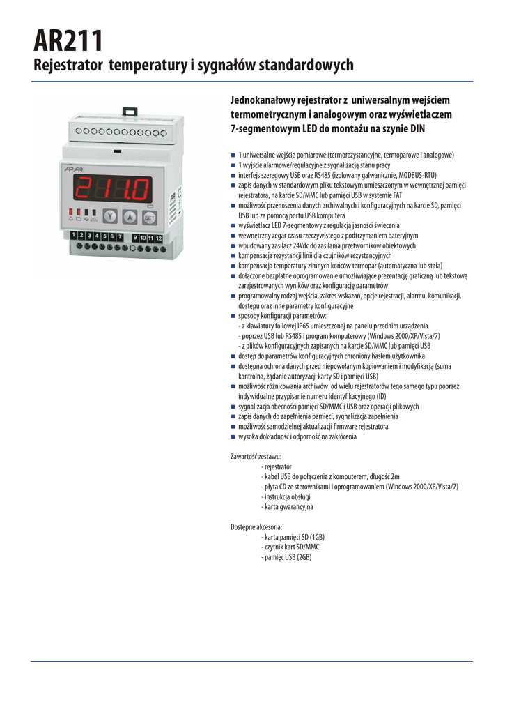 AR211 Rejestrator temperatury i sygnałów standardowych Jednokanałowy rejestrator z uniwersalnym wejściem termometrycznym i analogowym oraz wyświetlaczem 7-segmentowym LED do montażu na szynie DIN n 1 uniwersalne wejście pomiarowe (termorezystancyjne, termoparowe i analogowe) n 1 wyjście alarmowe/regulacyjne z sygnalizacją stanu pracy n interfejs szeregowy USB oraz RS485 (izolowany galwanicznie, MODBUS-RTU) n zapis danych w standardowym pliku tekstowym umieszczonym w wewnętrznej pamięci rejestratora, na karcie SD/MMC lub pamięci USB w systemie FAT n możliwość przenoszenia danych archiwalnych i konfiguracyjnych na karcie SD, pamięci USB lub za pomocą portu USB komputera n wyświetlacz LED 7-segmentowy z regulacją jasności świecenia n wewnętrzny zegar czasu rzeczywistego z podtrzymaniem bateryjnym n wbudowany zasilacz 24Vdc do zasilania przetworników obiektowych n kompensacja rezystancji linii dla czujników rezystancyjnych n kompensacja temperatury zimnych końców termopar (automatyczna lub stała) n dołączone bezpłatne oprogramowanie umożliwiające prezentację graficzną lub tekstową zarejestrowanych wyników oraz konfigurację parametrów n programowalny rodzaj wejścia, zakres wskazań, opcje rejestracji, alarmu, komunikacji, dostępu oraz inne parametry konfiguracyjne n sposoby konfiguracji parametrów: - z klawiatury foliowej IP65 umieszczonej na panelu przednim urządzenia - poprzez USB lub RS485 i program komputerowy (Windows 2000/XP/Vista/7) - z plików konfiguracyjnych zapisanych na karcie SD/MMC lub pamięci USB n dostęp do parametrów konfiguracyjnych chroniony hasłem użytkownika n dostępna ochrona danych przed niepowołanym kopiowaniem i modyfikacją (suma kontrolna, żądanie autoryzacji karty SD i pamięci USB) n możliwość różnicowania archiwów od wielu rejestratorów tego samego typu poprzez indywidualne przypisanie numeru identyfikacyjnego (ID) n sygnalizacja obecności pamięci SD/MMC i USB oraz operacji plikowych n zapis danych do zapełnienia pamięci, sygnalizacja zapełnienia n możliwość samodzielnej aktualizacji firmware rejestratora n wysoka dokładność i odporność na zakłócenia Zawartość zestawu: - rejestrator - kabel USB do połączenia z komputerem, długość 2m - płyta CD ze sterownikami i oprogramowaniem (Windows 2000/XP/Vista/7) - instrukcja obsługi - karta gwarancyjna Dostępne akcesoria: - karta pamięci SD (1GB) - czytnik kart SD/MMC - pamięć USB (2GB) Dane Techniczne Dane Montażowe Uniwersalne wejście (programowalne): zakres pomiarowy Listwowa MODULBOX 4MH53 - Pt100 (RTD, 3- lub 2-przewodowe) -200 ÷ 850 °C Materiał samogasnące tworzywo PRO - Ni100 (RTD, 3- lub 2-przewodowe) -50 ÷ 170 °C Wymiary obudowy 71 x 90 x 58 mm - termopara J (TC, Fe-CuNi) -40 ÷ 800 °C Mocowanie montaż na listwie TS35 (DIN EN 50022-35) - termopara K (TC, NiCr-NiAl) -40 ÷ 1200 °C Masa ~165g - termopara S (TC, PtRh 10-Pt) -40 ÷ 1600 °C - termopara B (TC, PtRh30PtRh6) 300 ÷ 1800 °C - termopara R (TC, PtRh13-Pt) -40 ÷ 1600 °C - termopara T (TC, Cu-CuNi) -25 ÷ 350 °C - termopara E (TC, NiCr-CuNi) -25 ÷ 680 °C - termopara N (TC, NiCrSi-NiSi) -35 ÷ 1300 °C - prądowe (Rwe = 110 Ω) 0/4 ÷ 20 mA - napięciowe (Rwe = 250 kΩ ) 0 ÷ 10 V - napięciowe (Rwe > 2 M Ω) 0 ÷ 60 mV - rezystancyjne (3- lub 2-przewodowe) 0 ÷ 1000 Ω Ilość wejść pomiarowych 1 Czas odpowiedzi (10÷90%) 1 ÷ 10 s (programowalny) Rezystancja doprowadzeń (RTD, Ω) Rd < 25 Ω (dla każdej linii) Prąd wejścia rezystancyjnego (RTD, Ω) ~480 μA 58 90 Listwa zaciskowa i gniazda Błędy przetwarzania (w temperaturze otoczenia 25°C): 0,1 % zakresu pomiarowego ±1 cyfra dla termopar 0,2 % zakresu pomiarowego ±1 cyfra - dodatkowy dla termopar <2 °C (temperatura zimnych końców) - dodatkowy od zmian temp. otoczenia < 0,005 % zakresu wejścia /°C KARTA SD (maks. 2GB) TC_ 0,1 °C + sterowniki kompatybilne z systemem Windows XP/Vista/7 - tryb nadrzędny obsługa pamięci USB (pendrive) Okres zapisu danych mA _ V RS485 P1 Uzas (1) 9 10 11 12 13 Pamięć danych (nieulotna, zapis do 19 mln. pomiarów dla pamięci 1GB): - wewnętrzna (typu FLASH) _ 1 2 3 4 5 6 7 8 szybkość 2,4 ÷ 115,2 kb/s, separowany galwanicznie programowalny od 1s do 2 godz. 45 min + RS- Pt100 (3-p) - tryb podrzędny - RS485 (protokół MODBUS-RTU, SLAVE) zwora RS+ Interfejsy komunikacyjne - USB 24Vdc Pt100 (2-p) + Rozdzielczość mierzonej temperatury USB (maks. 4GB) + dla RTD, mA, V,mV, Ω _ - podstawowy _ 4MB, system plików FAT12, zapis do 95 tys. pomiarów + SSR1 - zewnętrzna karta SD/MMC (złącze z wyrzutnikiem) FAT16, FAT32, maksymalny rozmiar 2GB, zalecany ≤1GB i FAT16 - zewnętrzna pamięć USB (pendrive, złącze typu A4) FAT16, FAT32, maksymalny rozmiar 4GB, zalecany ≤1GB i FAT16 Zegar czasu rzeczywistego (kwarcowy RTC) Wyjście alarmowe uwzględnia lata przestępne, podtrzymanie bateria CR1220 - przekaźnikowe 5A / 250V~ (dla obciążeń rezyst.), SPST-NO - SSR (tranzystorowe NPN OC, opcja) 11V, rezystancja wewnętrzna 440 Ω Wyświetlacz 7-segmentowy LED Zasilanie 4 cyfry, czerwony, wysokość 14 mm, z regulacją jasności - 230Vac 85 ÷ 260 Vac / 4 VA - 24Vac/dc (opcja) 20 ÷ 50 Vac / 4 VA, 20 ÷ 72 Vdc / 4 W Zasilacz przetworników obiektowych 24 Vdc / 30 mA Znamionowe warunki użytkowania 0 ÷ 50 °C, <100 %RH (bez kondensacji) Środowisko pracy powietrze i gazy neutralne Stopień ochrony IP65 od czoła, IP20 od strony złącz - odporność Kompatybilność elektromagnetyczna (EMC) - emisyjność wg normy PN-EN 61000-6-2:2002(U) Sposób Zamawiania AR211 / o /o Zasilanie 230 Vac 24 Vac/dc Kod S1 S2 Wyjście Kod przekaźnik P SRR S Przykład: AR211 / S1 / P AR211, zasilanie 230 Vac, wyjście przekaźnikowe wg normy PN-EN 61000-6-4:2002(U) (1) minimalny okres zapisu równy 1s możliwy jest zawsze dla pamięci wewnętrznej. Dla pamięci USB (pendrive) oraz kart SD minimalny gwarantowany (równomierny) okres rejestracji może wynosić nawet kilka sekund i za