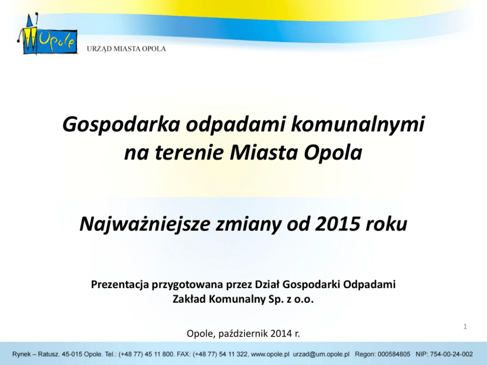 Gospodarka odpadami komunalnymi na terenie Miasta Opola Najważniejsze zmiany od 2015 roku Prezentacja przygotowana przez Dział Gospodarki Odpadami Zakład Komunalny Sp. z o.o. Opole, październik 2014 r. 1 Uprzejmie informujemy, iż od 1 stycznia 2015 r. zostanie zmienione prawo miejscowe w zakresie gospodarowania odpadami komunalnymi na terenie Miasta Opola. Wprowadzenie zmian zostało podyktowane zdobytymi doświadczeniami, a także licznymi zgłoszeniami Mieszkańców i Przedsiębiorców. 2 W ramach niniejszej prezentacji przedstawiamy najważniejsze zmiany wprowadzone uchwałami Rady Miasta Opola. Zmiany te mają na celu zoptymalizowanie systemu zbierania i odbierania odpadów komunalnych. 3 Zmiany dotyczące Mieszkańców (zabudowa zamieszkała) Zwiększono częstotliwość odbierania odpadów z pojemnika żółtego w zabudowie jednorodzinnej do 1 raz na 2 tygodnie (obecna częstotliwość wynosi 1 raz na 4 tygodnie) 4 Zmiany dotyczące Mieszkańców (zabudowa zamieszkała) Zwiększono częstotliwość odbierania odpadów z pojemnika brązowego w zabudowie jednorodzinnej do 1 raz na 2 tygodnie przez cały rok (zrezygnowano z obecnego podziału na sezon letni i zimowy, w którym częstotliwość ulega zmniejszeniu) 5 Zmiany dotyczące Mieszkańców (zabudowa zamieszkała) Zwiększono częstotliwość odbierania odpadów z pojemnika brązowego w zabudowie wielorodzinnej do 1 raz na tydzień przez cały rok (zrezygnowano z obecnego podziału na sezon letni i zimowy, w którym częstotliwość ulega zmniejszeniu) 6 Zmiany dotyczące Mieszkańców (zabudowa zamieszkała) Rozszerzono definicję odpadów wielkogabarytowych, które są odbierane z miejsc udostępniania pojemników poprzez dodanie elementów ceramiki oraz stolarki 7 Zmiany dotyczące Mieszkańców (zabudowa zamieszkała) Do odpadów WIELKOgabarytowych zaliczamy więc w szczególności: - meble - szafy - wersalki - tapczany - wózki dziecięce - umywalki Dotychczas odpady te trzeba było dostarczać - muszle klozetowe do PSZOK we własnym zakresie - drzwi 8 Zmiany dotyczące Mieszkańców (zabudowa zamieszkała) Z zabudowy wielorodzinnej wyodrębniono zabudowę kilkurodzinną czyli z wydzielonymi lokalami mieszkalnymi w ilości od 3 do 9 przy zamówieniu wspólnych pojemników. Proponowana zmiana powinna zmniejszyć uciążliwość związaną z dużym ruchem pojazdów odbierających odpady komunalne w tej zabudowie. 9 Zmiany dotyczące Mieszkańców (zabudowa zamieszkała) Zabudowa kilkurodzinna Właściciele, Mieszkańcy oraz Zarządcy proszeni są o przekazywanie informacji o kwalifikacji swojej nieruchomości do zabudowy kilkurodzinnej – mailem na adres: [email protected] Wszystkie zgłoszenia będą weryfikowane przez Urząd Miasta Opola 10 Zmiany dla Mieszkańców i Przedsiębiorców (zabudowa zamieszkała i niezamieszkała) Zawężono definicję odpadów ulegających biodegradacji wyłącznie do surowych części roślinnych. Do pojemnika brązowego wrzucamy więc (bez worków) wyłącznie: - surowe części roślinne - odpady zielone (liście, trawa) 11 Zmiany dotyczące Przedsiębiorców (zabudowa niezamieszkała) Właściciele nieruchomości niezamieszkałych mają możliwość wybrania jednej z czterech różnych częstotliwości odbioru odpadów dostosowaną do swoich indywidualnych potrzeb 12 Zmiany dotyczące Przedsiębiorców (zabudowa niezamieszkała) Częstotliwości wywozu - wariant I: 1 raz na 2 tygodnie 1 raz na 2 tygodnie 1 raz na 4 tygodnie 1 raz na 2 tygodnie 13 Zmiany dotyczące Przedsiębiorców (zabudowa niezamieszkała) Częstotliwości wywozu - wariant II (obecnie obowiązujący): 4 razy w miesiącu 4 razy w miesiącu 2 razy w miesiącu 2 razy w miesiącu 14 Zmiany dotyczące Przedsiębiorców (zabudowa niezamieszkała) Częstotliwości wywozu - wariant III: 3 razy na tydzień 2 razy na tydzień 1 raz na 2 tygodnie 1 raz na tydzień 15 Zmiany dotyczące Przedsiębiorców (zabudowa niezamieszkała) Częstotliwości wywozu - wariant IV: 1 raz na tydzień 1 raz na tydzień 1 raz na 2 tygodnie 1 raz na 2 tygodnie 16 Zmiany dotyczące Przedsiębiorców (zabudowa niezamieszkała) Wybór częstotliwości dokonuje samodzielnie Przedsiębiorca poprzez złożenie korekty deklaracji DOGO do Urzędu Miasta Opola Wydziału Podatków i Opłat Lokalnych pl. Wolności 7-8 – pok. 106-107, 45-018 Opole 17 Zmiany dla Mieszkańców i Przedsiębiorców (zabudowa zamieszkała i niezamieszkała) Udostępnianie pojemników Pojemniki należy udostępnić w dniu wywozu, wystawiając je przed posesję w takim miejscu, aby nie utrudniały ruchu pieszych i pojazdów oraz możliwy był jak najbliższy dojazd do pojemników pojazdu odbierającego odpady, bez konieczności wejścia na teren nieruchomości pracowników firmy odbierającej odpady bądź też przy otwartej bramie lub furtce w sposób gwarantujący bezpośredni załadunek pojemników (§ 6 ust. 5 pkt. 1 uchwały LVII/866/14 – regulamin) 18 Zmiany dla Mieszkańców i Przedsiębiorców (zabudowa zamieszkała i niezamieszkała) Udostępnianie pojemników w przypadku braku możliwości wystawienia pojemników w sposób określony w ust. 5 pkt 1, odbiór odpadów z terenu nieruchomości możliwy jest wyłącznie z pojemników ustawionych w miejscu wskazanym przez właściciela nieruchomości, do którego ten właściciel nieruchomości posiada tytuł prawny. Miejsce to powinno być widoczne z drogi, posiadać swobodny i bezkolizyjny dojazd drogą do pojemników pojazdu specjalistycznego odbierającego odpady komunalne i umożliwiać bezpośredni załadunek pojemników. W przypadku braku swobodnego i bezkolizyjnego dojazdu do miejsca wystawienia pojemników należy zapewnić możliwość bezpośredniego załadunku pojemników na pojazd specjalistyczny z drogi bez konieczności ich przeciągania przez pracowników firmy odbierającej odpady na odległość większą niż 50 m, po nawierzchni niepowodującej utrudnień w przemieszczaniu pojemników. (§ 6 ust. 5 pkt. 