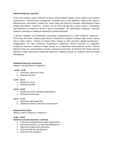 Babskie Święta już 3 grudnia! Przed nami kolejna edycja Festiwalu Rozwoju Kobiet Babskie Bielsko, która upłynie pod znakiem świątecznych i sylwestrowych przygotowao. Podobnie jak w maju będziecie mogły wziąd udział w kilkudziesięciu warsztatach, jednak tym razem będą one dotyczyd tematyki nadchodzących Świat Bożego Narodzenia i Sylwestra. Chcemy, by ten dzieo był dla Was czasem relaksu i spokojnego wprowadzenia w świąteczny klimat w gronie przyjaciółek. Na warsztatach znajdziecie inspiracje kulinarne, pomysły na świąteczne dekoracje, porady stylizacyjne. 3 grudnia odbędzie się kilkadziesiąt warsztatów pogrupowanych w kilka Akademii: Dekoracji i Prezentów, Eko-Świąt, Świątecznego Relaksu, Świątecznych stylizacji, Świątecznego Smaku. Oprócz tego w bloku Piękna i Zdrowa w Nowym Roku czekają na Was darmowe zabiegi kosmetyczne i pielęgnacyjne. Na Mini Kiermaszu Świątecznym znajdziecie również pomysły na oryginalne świąteczne prezenty i będziecie mogły zakupid je w specjalnych promocyjnych cenach. Podczas Babskich Świąt nie zapomniałyśmy również o Waszych pociechach. W Akademii Eko-Świąt rodzinnie będziecie mogły wykonywad świąteczne dekoracje, ozdabiad pierniki czy wspólnie tworzyd komiks mikołajkowy. Akademia Dekoracji i Prezentów Miejsce: Pub Bazyliszek ul. Wzgórze 8 11.00 – 12.30 Tworzenie i dekoracja świec Satynowe broszki 12.45 – 14.15 Świąteczny stroik Atłasowe bombki 14.30 – 16.00 Świąteczne kartki metodą scrapbooking’u Pakowanie prezentów 16.15 – 17.45 Dekoracje z gotowego filcu Zdobienie torebek i bilecików prezentowych Akademia Eko-Świąt Miejsce: Galeria Wzgórze ul. Wzgórze 4 11.00 – 18.00 Rodzinne warsztaty dla dzieci i rodziców Tworzenie recyklingowych ozdób świątecznych Rysowanie komiksu „Co robi Pani Mikołajowa?” Dekoracja świątecznych pierników Czytanie bajek dla najmłodszych Rowerowy eko-wyścig F1 Oszczędzaj energię w Święta – konsultacje z ekspertem „Let’s save energy” – krótki film dla dzieci Akademia Świątecznego Relaksu Miejsce: Herbaciarnia Assam ul. Rynek 26 11.00 – 12.00 Rytuał parzenia herbaty 12.00 – 14.00 (Sala dolna) Jak zrealizowad postanowienia noworoczne? 12.00 – 13.00 Koncert gongów i mis tybetaoskich 13.00 – 14.00 Prawdy i mity na temat herbaty 14.00 – 15.00 Koncert gongów i mis tybetaoskich 15.00 – 16.00 Rytuał parzenia herbaty 16.30 – 18.00 Czarownice i Dakinie – Żeoska energia na Wschodzie i Zachodzie Przez cały dzieo (11.00-18.00) darmowa degustacja herbat z całego świata. Akademia Świątecznych Stylizacji Miejsce: Pracownia Wizerunku Perfect Image ul. Cieszyoska 2 11.00 – 13.00 Perfekcyjna na Święta czyli jak ubrad się modnie i niedrogo na specjalne okazje 13.30 – 15.00 Makijaż i fryzury sylwestrowe 15.30 – 17.00 Perfekcyjna na obcasach – dobór szpilek i dodatków Akademia Świątecznego Smaku – gotuj z nami! Miejsce: Browar Miejski ul. Piwowarska 2 11.00 – 12.00 Dekoracja Świątecznego Stołu 12.00 – 13.30 Kreatywne Gotowanie 14.00 – 16.00 Gotuj Zdrowo na Święta 16.00 – 17.00 Jak jeśd smacznie i zdrowo i nie przytyd w święta? - warsztaty kulinarne z Natur House 17.00 – 18.00 Grzane piwo i wino na kilka sposobów Piękna i Zdrowa w Nowym Roku Miejsce: Sala Bankietowa nad Klubem Waga ul. Rynek 4 (Ip.) 11.00 -18.00 Darmowe zabiegi pielęgnacyjno- kosmetyczne Konsultacje Mini Kiermasz Świąteczny Centrum Festiwalowe Stoiska Dermika Salon&Spa Bielsko-Bia Babski Raj – Klub Zdrowia i Urodu Klinika Stomatologiczna Pod Szyndzielnią Szalone Nożyczki Tupperware Natur House Galeria Pod Aniołami Scrap.com.pl Oficjalne otwarcie Festiwalu Babskie Święta 02 grudnia od. godz. 19.00 Klub Waga ul. Rynek 4 Oficjalne zamknięcie Festiwalu Babskie Święta 03 grudnia od godz. 19.00 Kawiarnia Pod Sceną ul. 1 Maja 1