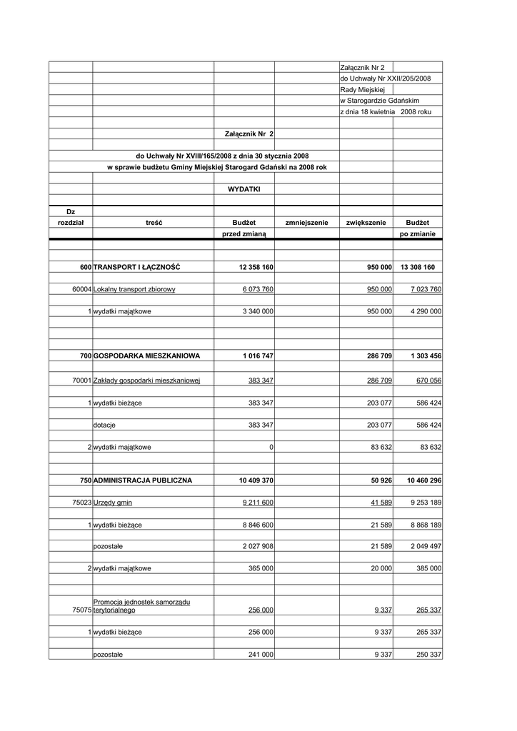 Załącznik Nr 2 do Uchwały Nr XXII/205/2008 Rady Miejskiej w Starogardzie Gdańskim z dnia 18 kwietnia 2008 roku Załącznik Nr 2 do Uchwały Nr XVIII/165/2008 z dnia 30 stycznia 2008 w sprawie budżetu Gminy Miejskiej Starogard Gdański na 2008 rok WYDATKI Dz rozdział treść Budżet zmniejszenie zwiększenie przed zmianą 600 TRANSPORT I ŁĄCZNOŚĆ Budżet po zmianie 12 358 160 950 000 6 073 760 950 000 7 023 760 3 340 000 950 000 4 290 000 700 GOSPODARKA MIESZKANIOWA 1 016 747 286 709 1 303 456 70001 Zakłady gospodarki mieszkaniowej 383 347 286 709 670 056 383 347 203 077 586 424 383 347 203 077 586 424 0 83 632 83 632 10 409 370 50 926 10 460 296 9 211 600 41 589 9 253 189 8 846 600 21 589 8 868 189 2 027 908 21 589 2 049 497 365 000 20 000 385 000 256 000 9 337 265 337 256 000 9 337 265 337 241 000 9 337 250 337 60004 Lokalny transport zbiorowy 1 wydatki majątkowe 1 wydatki bieżące dotacje 2 wydatki majątkowe 750 ADMINISTRACJA PUBLICZNA 75023 Urzędy gmin 1 wydatki bieżące pozostałe 2 wydatki majątkowe Promocja jednostek samorządu 75075 terytorialnego 1 wydatki bieżące pozostałe 13 308 160 BEZPIECZEŃSTWO PUBLICZNE I 754 OCHRONA PRZECIWPOŻAROWA 1 030 974 9 303 1 040 277 0 8 000 8 000 0 8 000 8 000 912 000 1 303 913 303 912 000 1 303 913 303 85 430 1 303 86 733 6 419 920 824 601 7 244 521 1 039 920 824 601 1 864 521 1 wydatki bieżące 1 039 920 824 601 1 864 521 rezerwa ogólna 350 000 494 521 844 521 rezerwa celowa 689 920 330 080 1 020 000 38 900 574 32 900 38 933 474 19 438 027 17 500 19 455 527 2 330 302 17 500 2 347 802 6 886 160 11 000 6 897 160 6 714 160 1 000 6 715 160 1 541 328 1 000 1 542 328 172 000 10 000 182 000 80195 Pozostała działalność 773 107 4 400 777 507 1 wydatki bieżące 693 107 4 400 697 507 396 507 4 400 400 907 75404 Komendy Wojewódzkie Policji 1 wydatki majątkowe 75416 Straż Miejska 1 wydatki bieżące pozostałe 758 RÓŻNE ROZLICZENIA 75818 Rezerwy ogólne i celowe 801 OŚWIATA I WYCHOWANIE 80101 Szkoły podstawowe 1 wydatki majątkowe 80104 Przedszkola 1 wydatki bieżące pozostałe 2 wydatki majątkowe pozostałe 851 OCHRONA ZDROWIA 753 300 6 000 6 000 753 300 60 000 6 000 6 000 60 000 60 000 6 000 6 000 60 000 dotacja 35 000 6 000 pozostałe 25 000 85149 Programy polityki zdrowotnej 1 wydatki bieżące POZOSTAŁE ZADANIA W 853 ZAKRESIE POLITYKI SPOŁECZNEJ 29 000 6 000 31 000 83 700 4 000 79 700 85395 Pozostała działalność 83 700 4 000 79 700 1 wydatki bieżące 83 700 4 000 79 700 60 000 4 000 56 000 dotacja EDUKACYJNA OPIEKA 854 WYCHOWAWCZA 85401 Świetlice szkolne 1 wydatki bieżące pozostałe 1 041 000 4 000 1 045 000 921 182 4 000 925 182 921 182 4 000 925 182 43 453 4 000 47 453 150 000 11 610 556 GOSPODARKA KOMUNALNA I 900 OCHRONA ŚRODOWISKA 11 464 956 90001 Gospodarka ściekowa i ochrona wód 4 679 000 150 000 4 829 000 4 130 000 150 000 4 280 000 1 wydatki majątkowe 90013 Schroniska dla zwierząt 1 wydatki bieżące dotacja 4 400 161 956 4 400 157 556 161 956 4 400 157 556 161 956 4 400 157 556 KULTURA I OCHRONA 921 DZIEDZICTWA NARODOWEGO 92109 Domy i ośrodki kultury, świetlice i kluby 1 wydatki majątkowe 926 KULTURA FIZYCZNA I SPORT 92604 Instytucje kultury fizycznej 1 wydatki bieżące pozostałe 2 wydatki majątkowe Zadania w zakresie kultury fizycznej i 92605 sportu 1 wydatki bieżące dotacja 2 wydatki majątkowe razem 3 535 136 170 000 3 705 136 1 001 457 170 000 1 171 457 0 170 000 170 000 966 000 5 421 841 3 761 795 286 000 4 047 795 1 911 795 13 000 1 924 795 756 835 13 000 769 835 1 850 000 273 000 2 123 000 680 000 1 374 046 4 468 841 13 000 707 046 13 000 557 046 13 000 544 046 500 000 13 000 487 000 150 000 120 040 639 27 400 680 000 830 000 3 450 439 123 463 678