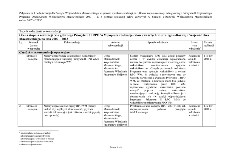 Tabela wdrażania rekomendacji Ocena stopnia realizacji celu