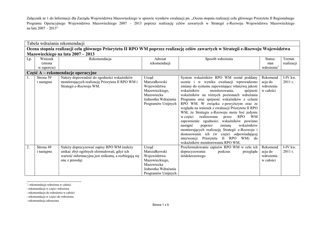 Załącznik nr 1 do Informacji dla Zarządu Województwa Mazowieckiego w sprawie wyników ewaluacji pn. „Ocena stopnia realizacji celu głównego Priorytetu II Regionalnego Programu Operacyjnego Województwa Mazowieckiego 2007 – 2013 poprzez realizację celów zawartych w Strategii e-Rozwoju Województwa Mazowieckiego na lata 2007 – 2013” Tabela wdrażania rekomendacji Ocena stopnia realizacji celu głównego Priorytetu II RPO WM poprzez realizację celów zawartych w Strategii e-Rozwoju Województwa Mazowieckiego na lata 2007 – 2013 Lp. Wniosek (strona w raporcie) Rekomendacja Adresat rekomendacji Sposób wdrożenia Status: stan wdrożenia1 Termin realizacji System wskaźników RPO WM został poddany ocenie i w wyniku ewaluacji wprowadzono zmiany do systemu zapewniające właściwą jakość wskaźników monitorowania, spójność wskaźników na różnych poziomach wdrażania Programu oraz spójność wskaźników z celami RPO WM. W związku z powyższym oraz ze względu na wniosek z ewaluacji Priorytetu II RPO WM, że Strategia e-Rozwoju może być jedynie w części realizowana przez RPO WM zapewnienie zgodności wskaźników powinno nastąpić poprzez zmianę wskaźników monitorujących realizację Strategii e-Rozwoju i dostosowanie ich (w części odpowiadającej interwencji Priorytetu II RPO WM) do wskaźników monitorowania RPO WM. Przeformułowanie zapisów RPO WM w celu ich doprecyzowania podczas przeglądu śródokresowego. Rekomend acja do wdrożenia w całości I-IV kw. 2011 r. Rekomend acja do wdrożenia w całości I-IV kw. 2011 r. Część A – rekomendacje operacyjne 1. Strona 59 i następne Należy doprowadzić do zgodności wskaźników monitorujących realizację Priorytetu II RPO WM i Strategii e-Rozwoju WM. Urząd Marszałkowski Województwa Mazowieckiego, Mazowiecka Jednostka Wdrażania Programów Unijnych 2. Strona 49 i następne Należy doprecyzować zapisy RPO WM (należy unikać zbyt ogólnych sformułowań, gdyż ich wartość informacyjna jest znikoma, a rozbiegają się one z prawdą) Urząd Marszałkowski Województwa Mazowieckiego, Mazowiecka Jednostka Wdrażania Programów Unijnych - rekomendacja wdrożona w całości - rekomendacja w części wdrożona - rekomendacja do wdrożenia w całości - rekomendacja w części do wdrożenia - rekomendacja odrzucona 1 Strona 1 z 5 3. Strona 36 i następne 4. Rozdziały 4.3 i 4.4 5. Strony 64-66 Przeprowadzić przegląd projektów kluczowych: a. Mazowiecka Sieć SI Mazowszanie zgodność proponowanych e-usług z oferowanymi przez instytucje centralne; czy budowana siec uwzględnia działania TP SA doprowadzenia Internetu do bibliotek wiejskich (w kraju: 9600 placówek - zrealizowano juz ok. połowy); jak planowane centralnie środki na rozwój RUM wpływają na rozwój e-usług medycznych w województwie b. Elektroniczna administracja przeprowadzenie kwerendy aktualnych zastosowań i efektów w aspekcie uzyskanych środków na rozwój eadministracji z innych źródeł (głownie z MSWiA). Strategia e-Rozwoju WM powinna zostać gruntownie poprawiona pod kątem: przeformułowania celów (obecnie cele są pomieszane ze środkami), weryfikacji celów w kontekście działań podejmowanych na szczeblu centralnym, uzupełnienia opisu celów, dostosowania narzędzi jej realizacji do wymogów formalnych różnych źródeł finansowania (odejście od projektów głównych na rzecz mechanizmów konkursowych), uspójnienia terminologii z terminologią używana w RPO WM, uzupełnienia o o elementy związane z bezpieczeństwem, rozwojem społecznym, kulturą, polityką, nauką, ponownym wykorzystaniem informacji publicznej i współpracą międzynarodową. Należy rozważyć wprowadzenie do RPO WM elementów standaryzujących i integrujących rozwiązania dofinansowywane w ramach projektów np. w formie dodatkowych wymagań w zakresie integracji z innymi systemami lub stosowanych standardów. Można również dofinansować odrębny projekt lub projekty integrujące (np. jako projekt Urząd Marszałkowski Województwa Mazowieckiego W ramach projektu „Internet dla Mazowsza” dokonano inwentaryzacji sieci szerokopasmowej na Mazowszu. W przypadku projektu „Rozwój elektronicznej administracji w samorządach województwa mazowieckiego wspomagającej niwelowanie dwudzielności potencjału województwa” podpisano już umowę na realizacje projektu. Rekomend acja w części wdrożona I kw. 2011 r. Urząd Marszałkowski Województwa Mazowieckiego W związku ze zmianami dokumentów strategicznych na poziomie kraju i województwa koniecznymi do przeprowadzenia w ramach przyjętych Założeń systemu zarządzania rozwojem Polski, niezbędny będzie kompleksowy przegląd i zmiany dokumentów strategicznych obowiązujących w województwie mazowieckim. W ramach tych działań uwzględnione zostaną uwagi dotyczące weryfikacji Strategii. DSRR proponuje rozważyć rozszerzenie zadań Grupy Zarządzającej dla Strategii e-Rozwoju Województwa Mazowieckiego o dokonanie przeglądu Strategii e-Rozwoju w kontekście kompleksowych zmian dokumentów strategicznych Województwa Mazowieckiego. Rekomend acja do wdrożenia w całości I-IV kw. 2011 r. Urząd Marszałkowski Województwa Mazowieckiego, Mazowiecka Jednostka Wdrażania Programów Unijnych W ramach przygotowywania konkursu w Działaniu 2.1, zaplanowanego na maj 2011 r. zostanie przeanalizowana możliwość wprowadzenia elementów standaryzujących i integrujących rozwiązania w ramach dofinansowanych projektów. Wyniki dokonanej analizy zostaną uwzględnione podczas Rekomend acja w części do wdrożenia I-II kw. 2011 r. Strona 2 z 5 kluczowy) i/lub monitorujące (np. w ramach pomocy technicznej). 6. Strona 74 Konieczna jest weryfikacja działań finansowanych w ramach Priorytetu II RPO WM w kontekście działań podejmowanych na szczeblu centralnym, w tym: budowy sieci szerokopasmowych budowy Elektronicznej Platformy Usług Publicznych – e-PUAP Urząd Marszałkowski Woj