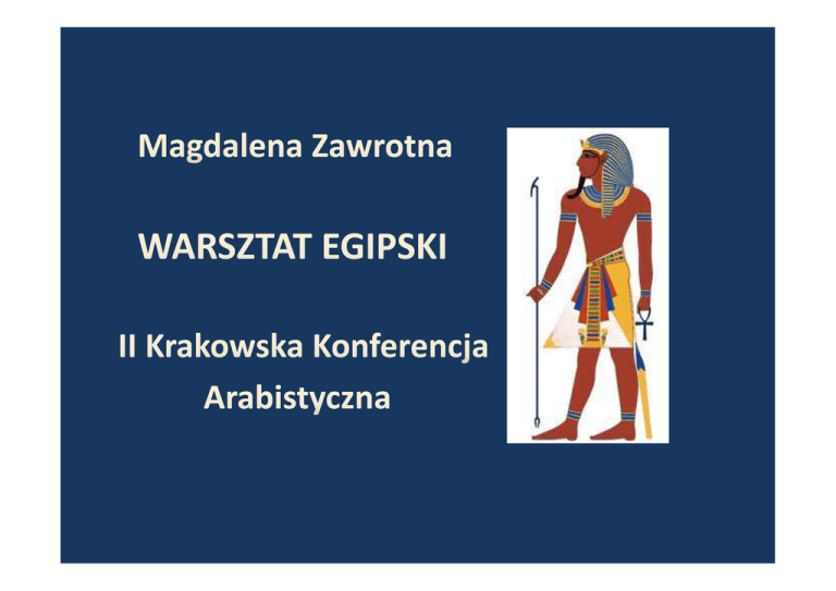 FONOLOGIA q > zwarcie krtaniowe ( ) ء > ق ğ>g()ج ḏ > d lub z ( ) ذ ṯ > t lub s ( ) ث spółgłoska v samogłoski o i e q > zwarcie krtaniowe ( ) ء > ق ʾamar ( ) قمر- księżyc ğ>g()ج gazma (جزمة ))جزمة- buty ḏ > d lub z ( ) ذ ḏibbāna > dibbāna ( ) ذبانةmucha taḏkira > tazkara ( ) تذكرةbilet ṯ > t lub s ( ) ث ṯawra > sawra ( ) ثورةrewolucja ṯalğ > talg ( ) ثلجśnieg spółgłoska v vīza samogłoski o i e Hosni Mubarak e (h)? – co? Czasownik Brak końcówek Brak liczby podwójnej Strona biernabierna- prefiks „„it it”” Brak części klas Użycie imiesłowów czynnych Nominalne części mowy Brak końcówek przypadka Ujednolicenie rodzaju w pluralis Częste diminutiva qaṣīr > ʾuṣayyar ( ) قصير- krótki ṣaġīr > ṣuġayyar ( ) صغير- mały Negacja ما+ش Zanegować można różne części mowy: maʽandīš waʾt – nie mam czasu ma tḫafš – nie przejmuj się mentaš maʽāya – nie ma cię ze mną Liczebniki 1- 10 1 wāḥid 2 itneen 3 talāta 4 arbaʽ 5 ḫamsa 6 sitta 7 sabʽa 8 tmanya 9 sʽa 10 ʽašara Liczebniki 11 11-- 20 11 iḥdāšar 12 itnāšar 13 talatāšar 14 arbaʽtāšar 15 ḫamastāšar 16 sittāšar 17 sabʽatāšar 18 tmantāšar 19 sʽatāšar 20 ʽišrīn Zaimki wskazujące – postpozycja el--walad da (h) el el--bint dī el el--awlēd dōl el Zaimki pytajnepytajne- postpozycja ismak eh eh?? – jak masz na imię? enta ʽārif izzey izzey?? – skąd wiesz? huwwa mīn mīn?? – kim on jest? hiyya mneen mneen?? – skąd ona jest? hatīgī emta emta?? – kiedy przyjdziesz? mīn?? – a ona to kto? we dī mīn Wyrażanie „bycia”„bycia”- fī(h) fī(h) - fī(h) fī(h) liffa? liffa? (Jest liffa?) liffa?) - fī(h). fī(h). (Jest.) - bi kēm kēm?? / ʾadd eh? (Po ile?) - fī(h) fī(h) bi ḫamsa fī(h) fī(h) bi sabʽa we nuṣṣ. nuṣṣ. (Są takie po pięć i takie po siedem i pół). Części ciała ʽayn rās / manaḫīr dmāġ buʾ widn Części ciała wišš šaʽr baṭn īd rigl qadam Wakacje w Egipcie - el- ʽafw elʽafw,, … - przepraszam, … bi kēm da? – ile to kosztuje? el--matʽam feen el feen??- gdzie jest restauracja? el--maḥall feen? el feen? – gdzie jest sklep? el--barīd feen el feen??- gdzie jest poczta? aʾrab ṣirāfa feen feen?? – gdzie jest najbliższy kantor? Wakacje w Egipcie 1. fūl we ṭaʽāmīya (danie z fasoli) 2. šawarma (mięso z rusztu) 3. ḥamāma (gołąb) 4. frēḫ (kurczak) 5. ḫarūf (baranina) 6. salaṭa (sałatka) Wakacje w Egipcie 7. košeri (danie z makaronu) 8. gambari (krewetki) 9. šurba (zupa) 10.. laḥma (mięso) 10 11.. samak (ryba) 11 12.. tḥīna (tahina) 12 tahina) Owoce gawēfa farawla tuffāḥa mawz burtuʾēna šammām Warzywa ʾūṭa baʾdunis ḫyār gazar šabat sabbāniḫ Dolegliwości wakacyjne ishāl - biegunka bard - przeziębienie wagʽ fi baṭn – ból brzucha darbit šams – udar słoneczny raggaʽ - wymiotować Egipskie miejscowości El--Qāhira El Šarm eš-- šīḫ eš El-Iskan ElIskan-darīya Asuān El--Fayyūm El el--Uʾsur el Ġardaʾa Zwroty grzecznościowe Ṣabāḥ el el--ḫeer / ṣabāḥ en en--nūr (ell- warda (e warda,, el el-- yasmīn yasmīn,, el el--ʽasal ʽasal)) Dzień dobry (rano) As As--salām ʽaleykum ʽaleykum-- Dzień dobry Salām Salām-- Dzień dobry Zwroty grzecznościowe Ahlan we sahlan - Witaj Izeyyak / izeyyik? izeyyik? – Jak się masz? Mnawwar (a) / nūrak (nūrik nūrik)) – Zwrot grzecznościowy używany w stosunku osób bardzo mile widzianych (np. gości) Zwroty grzecznościowe Ana kweys / Ana kweyyisa Wszystko w porządku Kullu tamām – Wszystko w porządku El El--ḥamdu lilla – dzięki Bogu Nuṣṣ nuṣṣ - tak sobie Yaʽni – no wiesz,… Zift / miš kweys – niezbyt dobrze Zwroty grzecznościowe Iṭfaḍḍal / Iṭfaḍḍali - proszę Min faḍlak / min faḍlikfaḍlik- proszę Furṣa saʽīda – ana asʽad – miło mi Šukran / alf šukr - dziękuję Mitšakkir awi – bardzo dziękuję Āsif / āsfa - przepraszam Maʽleeš - przepraszam Zapożyczenia Yiʽmil rest – siłować się na rękę Yišōt – strzelać bramkę Ays krim - lody Sīfud – owoce morza Baskūt,, keek - ciastko Baskūt Tšert-- bluzka Tšert Zapożyczenia Kerli - kręcone Waks - wosk Meekab - makijaż Yidellit - usunąć Yiseyyiv - zapisać Yifarmat - sformatować Zapożyczenia ze względu na modę • • • • • Over- yiʾavwar - wymiotować OverDablara / yidablar yidablar-- powtarzać rok Yišeyyit – rozmawiać na czacie Ya brinz / ya men – książe / człowieku Sakkis – uprawiać seks Zapożyczenia ze względu na prestiż English, English, Just, So, Television,, Television New look. look. Zapożyczenia ze względu na tabu Swit – masa cukrowa do depilacji Silk ibil – depilator Brā – biustonosz Anderwer – majtki Biryid – miesiączka Olwees – podpaska Bibbi / kakka – siusiu / kupka Zapożyczenia ze względu na kamuflaż Yiroll – zwijać jointa Yismōk – palić Ğoynt – joint Yiskōr – zdobywać narkotyki Yi’enğik – wstrzykiwać sobie narkotyk Staff / staffa staffa,, dragz – towar / narkotyki Zaloty muʽāksa podrywanie taḥarruš ginsi molestowanie Podrywanie-- sposoby Podrywanie • Enti ḥelwa / enti ʽamūra / enti ʽasūla (jesteś ładna, śliczna, piękna…) • Enti gāmda (jesteś pociągająca) • Eh el el--ḥalāwa dī dī?? (ḥalāwtak (ḥalāwtak ya ḫafīf ḫafīf)) (cóż za uroda!) (twoja własna) Podrywanie- sposoby PodrywanieUżycie angielskich słów: • • • • Sex? I love you Very beautiful Hi / helo Stosunkowo kulturalna reakcja • Enta ʾalīl el el--adab adab!! – Jesteś niewychowany! • Imši min wišši wišši!! – Zejdź mi z oczu • Ḥilla ʽan samāya samāya!! – Idź sobie (odsłoń mi niebo) • Imši wallā wallā!! – Idź sobie, bo jak nie… Stosunkowo kulturalna reakcja • Hawarrīk en en--ngūm fi ʽizz eḍ eḍ-- ḍuhr Pokażę ci gwiazdy w 