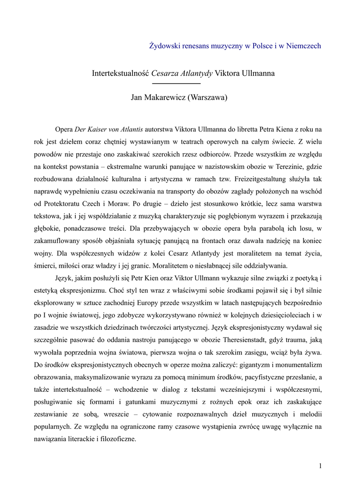 Żydowski renesans muzyczny w Polsce i w Niemczech Intertekstualność Cesarza Atlantydy Viktora Ullmanna Jan Makarewicz (Warszawa) Opera Der Kaiser von Atlantis autorstwa Viktora Ullmanna do libretta Petra Kiena z roku na rok jest dziełem coraz chętniej wystawianym w teatrach operowych na całym świecie. Z wielu powodów nie przestaje ono zaskakiwać szerokich rzesz odbiorców. Przede wszystkim ze względu na kontekst powstania – ekstremalne warunki panujące w nazistowskim obozie w Terezinie, gdzie rozbudowana działalność kulturalna i artystyczna w ramach tzw. Freizeitgestaltung służyła tak naprawdę wypełnieniu czasu oczekiwania na transporty do obozów zagłady położonych na wschód od Protektoratu Czech i Moraw. Po drugie – dzieło jest stosunkowo krótkie, lecz sama warstwa tekstowa, jak i jej współdziałanie z muzyką charakteryzuje się pogłębionym wyrazem i przekazują głębokie, ponadczasowe treści. Dla przebywających w obozie opera była parabolą ich losu, w zakamuflowany sposób objaśniała sytuację panującą na frontach oraz dawała nadzieję na koniec wojny. Dla współczesnych widzów z kolei Cesarz Atlantydy jest moralitetem na temat życia, śmierci, miłości oraz władzy i jej granic. Moralitetem o niesłabnącej sile oddziaływania. Język, jakim posłużyli się Petr Kien oraz Viktor Ullmann wykazuje silne związki z poetyką i estetyką ekspresjonizmu. Choć styl ten wraz z właściwymi sobie środkami pojawił się i był silnie eksplorowany w sztuce zachodniej Europy przede wszystkim w latach następujących bezpośrednio po I wojnie światowej, jego zdobycze wykorzystywano również w kolejnych dziesięcioleciach i w zasadzie we wszystkich dziedzinach twórczości artystycznej. Język ekspresjonistyczny wydawał się szczególnie pasować do oddania nastroju panującego w obozie Theresienstadt, gdyż trauma, jaką wywołała poprzednia wojna światowa, pierwsza wojna o tak szerokim zasięgu, wciąż była żywa. Do środków ekspresjonistycznych obecnych w operze można zaliczyć: gigantyzm i monumentalizm obrazowania, maksymalizowanie wyrazu za pomocą minimum środków, pacyfistyczne przesłanie, a także intertekstualność – wchodzenie w dialog z tekstami wcześniejszymi i współczesnymi, posługiwanie się formami i gatunkami muzycznymi z rożnych epok oraz ich zaskakujące zestawianie ze sobą, wreszcie – cytowanie rozpoznawalnych dzieł muzycznych i melodii popularnych. Ze względu na ograniczone ramy czasowe wystąpienia zwrócę uwagę wyłącznie na nawiązania literackie i filozoficzne. 1 Żydowski renesans muzyczny w Polsce i w Niemczech Można na wstępie postawić zarzut, iż w tak krótkim dziele, jak Cesarz Atlantydy, będzie można odnaleźć odniesienia tak naprawdę do wszystkiego, co tylko nasunie się badaczowi w zależności od jego erudycji. Jednak do takich konsekwencji prowadzi rozumienie terminu „intertekstualność”, który pojawił się po raz pierwszy w pracach językoznawczyni Julii Kristevej. W swoim artykule zatytułowanym Słowo, dialog i powieść odniosła się do poglądów Michaiła Bachtina, rosyjskiego badacza twórczości Fiodora Dostojewskiego. Bachtin zauważył, że jakiekolwiek dzieło sztuki słowa zawiera w sobie coś, co można zaobserwować w doświadczeniu żywej mowy, mianowicie – pomiędzy słowem zapisanym w tekście a jego czytelnikiem rozpościera się swego rodzaju siatka innych, cudzych słów o tym samym przedmiocie, na ten sam temat. Innymi słowy, dzieło sztuki słowa nie jest całkowicie autonomiczne, lecz zawsze pozostaje uwikłane w to, co już powiedziano wcześniej o tym, co stanowi przedmiot tego dzieła. Bachtin określa to pojęciem dialogu. Zarówno literatura, jak i jej odbiorca, zanurzają się niejako w tym nieustannym dialogu. Dla Bachtina nie ma on jednak charakteru literackiego, lecz składają się nań „społeczno-ideologiczne głosy epoki”, a więc całokształt zjawisk składających się na dyskurs epoki, bez zawężania go wyłącznie do dyskursu literackiego 1. Ekspresjonizm z jego wielością motywacji i uwikłań oraz tendencją do godzenia sprzeczności jawi się zatem jako par excellence dialogiczny, intertekstualny, na przykład Cesarz Atlantydy wchodzi w dialog z tekstami i dziełami sztuki będącymi reakcją na I wojnę światową. Julia Kristeva z kolei dokonała tutaj daleko idącej generalizacji pojęcia tekstu – w jej koncepcji tekst wpisuje się w ogólną semiotykę kultury, gdzie każdy system kulturowy może być rozpatrywany jako tekst 2. W tym świetle dla formacji ekspresjonistycznej tekstem byłyby nie tylko dramaty, poezja, malarstwo czy dzieła muzyczne, lecz także tradycja niemieckiego idealizmu, polityka niemiecka czasów Bismarcka, I wojna światowa, pacyfizm czy aktywizm3. Intertekstualność może przybrać różne perspektywy, w zależności od tego, jak bardzo nawiązania do innych dzieł są widoczne w analizowanych utworach. To pociąga za sobą przenoszenie punktu ciężkości raz na autora, innym razem na samo dzieło, jeszcze w innym przypadku – na odbiorcę, który w procesie interpretacji odkrywa źródła nieznane bądź niekonkretyzowane wprost przez autora. Henryk Markiewicz wymienia zatem następujące rodzaje intertekstualności: genetyczną, a więc uwzględniającą tylko te teksty, które uczestniczyły w genezie 1 Zob. Manfred Pfister, Koncepcje intertekstualności, przeł. M. Łukasiewicz, „Pamiętnik Literacki” 1991, z. 4, s. 186. 2 Ibidem, s. 188. 3 W pracy zatytułowanej Le Texte du roman z 1970 roku poświęconym późnośredniowiecznym tekstom narracyjnym Julija Kristeva pod pojęciem tekstu rozpatruje nawet całą średniowieczną tradycję myślenia scholastycznego. Zob. ibidem, s. 189. 2 Żydowski renesans muzyczny w Polsce i w Niemczech utworu, intencjonalną – zamierzoną przez autora, immanentną – wyznaczoną lub sugerowaną w samym utworze i recepcyjną – odkrywaną pr