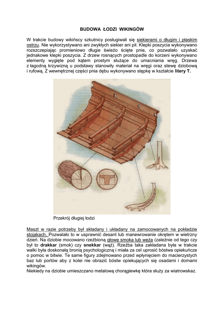 BUDOWA ŁODZI WIKINGÓW W trakcie budowy wikińscy szkutnicy posługiwali się siekierami o długim i płaskim ostrzu. Nie wykorzystywano ani zwykłych siekier ani pił. Klepki poszycia wykonywano rozszczepiając promieniowo długie świeżo ścięte pnie, co pozwalało uzyskać jednakowe klepki poszycia. Z drzew rosnących prostopadle do korzeni wykonywano elementy wygięte pod kątem prostym służące do umacniania wręg. Drzewa z łagodną krzywizną u podstawy stanowiły materiał na wręgi oraz stewę dziobową i rufową. Z wewnętrznej części pnia dębu wykonywano stępkę w kształcie litery T. Przekrój długiej łodzi Maszt w razie potrzeby był składany i układany na zamocowanych na pokładzie stojakach. Pozwalało to w usprawnić desant lub manewrowanie okrętem w wietrzny dzień. Na dziobie mocowano rzeźbioną głowę smoka lub węża (zależnie od tego czy był to drakkar (smok) czy snekkar (wąż). Rzeźba taka zakładana była w trakcie walki była doskonałą bronią psychologiczną i miała za cel uprosić bóstwa opiekuńcze o pomoc w bitwie. Te same figury zdejmowano przed wpłynięciem do macierzystych baz lub portów aby z kolei nie obrazić bóstw opiekujących się osadami i domami wikingów. Niekiedy na dziobie umieszczano metalową chorągiewkę która służy za wiatrowskaz. Głowa smoka z dziobu repliki okrętów wikingów Helge Ask. pozłacana chorągiewka z brązu służąca za wiatrowskaz OPRACOWANIE: Wiesław Taras na podstawie: W.Urbanowicz "Architektura Okrętów"; John R.Hale "Długie łodzie wikingów"; Świat Nauki nr. Kwiecień 1998; H.Holender "Wikingowie"; Młody Technik nr. Październik 1980 Łódź z Gokstad Łódź znaleziona w Gokstad została zbudowana około roku 890. Prawdopodobnie należała do któregoś ze skandynawskich wodzów lub królów, który używał jej w celach reprezentacyjnych i do podróży ( wskazuje na to dość duża szerokość łodzi w stosunku do jej długości- łodzie typowo bojowe były znacznie węższe- oraz jej wyjątkowo staranne wykonanie). Natomiast po śmierci posłużyła mu, zgodnie ze skandynawskim obrządkiem pogrzebowym, za grobowiec. Wielmoża został pochowany na łodzi wraz z wyposażeniem, które mogłoby być mu przydatne w świecie umarłych. Nad łodzią usypano wysoki kurhan. Okręt miał 23,3 m długości i 5,3 m szerokości; wysokość kadłuba na śródokręciu od dolnej krawędzi stępki do górnej deski poszycia wynosiła 1,95 m. Była wyposażona w 32 wiosła (mogła więc przewozić około 70- 80 osób) oraz żagiel, rozpięty na mierzącym prawdopodobnie 10 m maszcie. Sam maszt ważył ok. 360 kg, a cała łódź wraz z ekwipunkiem 18 ton. Pierwsza wierna replika w skali 1 do 1 wraku z Gokstad, o nazwie "Viking", została zbudowana w Norwegii w 1893 roku. Łódź ta wzięła następnie udział w rejsie eksperymentalnym przez Atlantyk i dotarła do Ameryki Północnej. Opis konstrukcji Do stępki o wymiarach 110 mm grubości i 380 mm wysokości, złączonej z trzech kawałków, przymocowane są stewy, obie w części przystępkowej o wymiarach 110 mm/400 mm, w częściach górnych zwężające się do 80/200 mm. Poszycie zakładkowe zbudowane jest z 11 pasów na burcie, o grubości klepki 28 mm, nitowane miedzianymi gwoździami o średnicy 4 mm na podkładkach z blachy miedzianej o grubości 2 mm. Klepki mocowane są do stew gwoździami żelaznymi o średnicy 6 mm, kutymi na wzór gwoździ gotyckich. Poszczególne klepki składają się z desek o szerokości od 12 do 22 cm i długości od 70 do 450 cm. Deski wąskie i krótkie stosowane są na dziobie i rufie, ze względu na charakterystyczne podgięcia poszycia do góry przy wysokich stewach. Wręgi o wymiarach 80/80 mm, (lewe ramię łączone jest z prawym na zakos na stępce), łącznie z przykrywającym je pokładnikiem o wymiarach 110/50 mm stanowią sztywny trójkąt wzmocnienia poprzecznego. Co drugi trójkąt wręgowy, od mocnicy burtowej schodzą w dół półwręgi o wymiarach 50/80 mm, sięgające w dół minimum trzy klepki poszycia głębiej, niż górne końce trójkątów wręgowych. Wręgi i półwręgi nitowane są do poszycia gwoździami miedzianymi o średnicy 6 mm. Ostatni pas poszycia wzmocniony jest mocnicą burtową o wymiarach 80/80 mm. Kadłub konserwowany jest pokostem na gorąco oraz smołą węglową (karboleum) i drzewną (oleum pini) na gorąco.