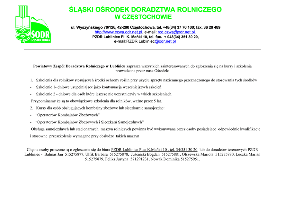 ŚLĄSKI OŚRODEK DORADZTWA ROLNICZEGO W CZĘSTOCHOWIE ul. Wyszyńskiego 70/126, 42-200 Częstochowa, tel. +48(34) 37 70 100; fax. 36 20 489 http://www.czwa.odr.net.pl, e-mail: [email protected] PZDR Lubliniec Pl. K. Mańki 10, tel. fax. + 048(34) 351 30 20, e-mail:RZDR [email protected] Powiatowy Zespół Doradztwa Rolniczego w Lublińcu zaprasza wszystkich zainteresowanych do zgłoszenia się na kursy i szkolenia prowadzone przez nasz Ośrodek: 1. Szkolenia dla rolników stosujących środki ochrony roślin przy użyciu sprzętu naziemnego przeznaczonego do stosowania tych środków - Szkolenie 1- dniowe uzupełniające jako kontynuacja wcześniejszych szkoleń - Szkolenie 2 - dniowe dla osób które jeszcze nie uczestniczyły w takich szkoleniach. Przypominamy że są to obowiązkowe szkolenia dla rolników, ważne przez 5 lat. 2. Kursy dla osób obsługujących kombajny zbożowe lub sieczkarnie samojezdne: - “Operatorów Kombajnów Zbożowych” - “Operatorów Kombajnów Zbożowych i Sieczkarń Samojezdnych” Obsługa samojezdnych lub stacjonarnych maszyn rolniczych powinna być wykonywana przez osoby posiadające odpowiednie kwalifikacje i stosowne przeszkolenie wymagane przy obsłudze takich maszyn Chętne osoby proszone są o zgłoszenie się do biura PZDR Lubliniec Plac K.Mańki 10 , tel. 34/351 30 20 lub do doradców terenowych PZDR Lubliniec - Balmas Jan 515275877, Ulfik Barbara 515275878, Juściński Bogdan 515275881, Olszewska Mariola 515275880, Łuczka Marian 515275879, Feliks Justyna 571291231, Nowak Dominika 515275951.
