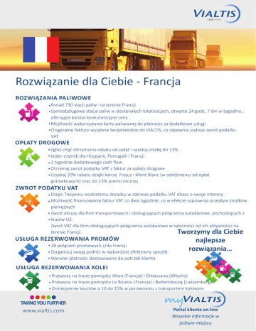 a company Rozwiązanie dla Ciebie - Francja ROZWIĄZANIA PALIWOWE Ponad 730 stacji paliw - na terenie Francji Samoobsługowe stacje paliw w doskonałych lokalizacjach, otwarte 24 godz, 7 dni w tygodniu, oferujące bardzo konkurencyjne ceny Możliwość wykorzystania karty paliwowej do płatności za dodatkowe usługi Oryginalne faktury wysyłane bezpośrednio do VIALTIS, co zapewnia szybszy zwrot podatku VAT OPŁATY DROGOWE Zgłoś chęć otrzymania rabatu od opłat i uzyskaj zniżkę do 13% Jeden czytnik dla Hiszpanii, Portugalii i Francji 2 tygodnie dodatkowego cash flow Otrzymaj zwrot podatku VAT z faktur za opłaty drogowe Uzyskaj 20% rabatu dzięki karcie Frejus i Mont Blanc (w odróżnieniu od opłat gotówkowych) oraz do 13% premii rocznej ZWROT PODATKU VAT Dzięki Twojemu osobistemu doradcy w zakresie podatku VAT dbasz o swoje interesy Możliwość finansowania faktur VAT co dwa tygodnie, co w efekcie usprawnia przepływ środków pieniężnych Zwrot akcyzy dla firm transportowych i obsługujących połączenia autokarowe, pochodzących z krajów UE. Zwrot VAT dla firm obsługujących połączenia autokarowe w zależności od ich aktywności na terenie Francji. Tworzymy dla Ciebie USŁUGA REZERWOWANIA PROMÓW 28 połączeń promowych z/do Francji Zorganizuj swoją podróż w najbardziej efektywny sposób Warunki płatności dostosowane do potrzeb klienta najlepsze rozwiązania… ozwiązaania… USŁUGA REZERWOWANIA KOLEI Przewozy na trasie pomiędzy Aiton (Francja) i Orbassano (Włochy) Przewozy na trasie pomiędzy Le Boulou (Francja) i Be embourg (Luksemburg) Zmniejszenie kosztów o 10 do 15% w porównaniu z transportem kołowym www.vial www vial s.com s com Portal klienta on-line Wszyskie informacje w jednym miejscu