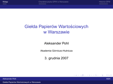 Wstep ˛ Charakterystyka GPW w Warszawie Historia GPW Giełda Papierów Wartościowych w Warszawie Aleksander Pohl Akademia Górniczo-Hutnicza 3. grudnia 2007 Aleksander Pohl Giełda Papierów Wartościowych w Warszawie AGH Wstep ˛ Charakterystyka GPW w Warszawie Historia GPW Plan prezentacji ◮ Czym jest Giełda Papierów Wartościowych? ◮ Charakterystyka GPW w Warszawie. ◮ Krótka historia warszawskiej GPW. Aleksander Pohl Giełda Papierów Wartościowych w Warszawie AGH Wstep ˛ Charakterystyka GPW w Warszawie Historia GPW Czym jest Giełda Papierów Wartościowych? Giełda – to organizowane w określonym miejscu i czasie spotkanie handlowe, na którym sa˛ sprzedawana ściśle określone towary po cenach ogłoszonych w codziennych notowaniach. Giełda papierów wartościowych – to rynek, na którym dokonywane sa˛ transakcje kupna/sprzedaży akcji, obligacji, opcji, warrantów oraz innych instrumentów finansowych. Giełda Papierów Wartościowych w Warszawie jest instytucja˛ powstała˛ w 1991, umożliwiajac ˛ a˛ obrót papierami wartościowymi dopuszczonymi do obrotu giełdowego. Aleksander Pohl Giełda Papierów Wartościowych w Warszawie AGH Wstep ˛ Charakterystyka GPW w Warszawie Historia GPW Rysunek: GPW w Warszawie. Źródło: Wikipedia Aleksander Pohl Giełda Papierów Wartościowych w Warszawie AGH Wstep ˛ Charakterystyka GPW w Warszawie Historia GPW Papiery wartościowe notowane na GPW ◮ ◮ ◮ ◮ akcje – PW łacz ˛ ace ˛ w sobie prawa o charakterze majatkowym ˛ i niemajatkowym, ˛ wynikajace ˛ z uczestnictwa w spółce akcyjnej obligacje – PW, w których emitent stwierdza, że jest dłużnikiem obligatariusza i zobowiazuje ˛ sie˛ wobec niego do spełnienia określonego świadczenia opcje – PW dajace ˛ posiadaczowi prawo do kupna lub sprzedaży określonego dobra (np. akcji) po cenie, która określona jest z góry kontrakty terminowe – rodzaj umowy zawieranej pomiedzy ˛ giełda˛ a kupujacym ˛ (sprzedajacym), ˛ w której obliguje sie˛ on do kupna (sprzedaży) określonego dobra po określonej cenie, w określonym terminie Aleksander Pohl Giełda Papierów Wartościowych w Warszawie AGH Wstep ˛ Charakterystyka GPW w Warszawie Historia GPW Rynek GPW GPW w Warszawie stanowi główny element rynku wtórnego dla akcji, obligacji i innych instrumentów finansowych. Dzieli sie˛ ona na: ◮ rynek podstawowy ◮ rynek równoległy Wymogi stawiane firmom wchodzacym ˛ na rynek podstawowy sa˛ znacznie wyższe, niż tym wchodzacym ˛ na rynek równoległy. Powoduje to z jednej strony wieksze ˛ koszty wejścia na giełde, ˛ ale również zwieksza ˛ prawdopodobieństwo uzyskania środków finansowych w wyniku emisji akcji. Aleksander Pohl Giełda Papierów Wartościowych w Warszawie AGH Wstep ˛ Charakterystyka GPW w Warszawie Historia GPW Indeksy GPW w Warszawie Podstawowymi wskaźnikami giełdowymi sa˛ ceny akcji notowanych spółek oraz wysokości obrotów. Ceny akcji odzwierciedlane sa˛ poprzez indeksy giełdowe: ◮ WIG – podstawowy indeks spółek giełdowych ◮ WIG20 – indeks 20 najwiekszych ˛ i najpłynniejszych spółek ◮ mWIG40 i sWIG80 – indeksy kolejnych 40 i 80 spółek giełdowych ◮ WIG PL – indeks spółek krajowych ◮ TechWIG – indeks spółek innowacyjnych technologii ◮ WIG banki, WIG budownictwo, WIG informatyka, WIG media, WIG developerzy, WIG paliwa, WIG spożywczy, WIG telekomunikacja – indeksy branżowe Aleksander Pohl Giełda Papierów Wartościowych w Warszawie AGH Wstep ˛ Charakterystyka GPW w Warszawie Historia GPW Indeks WIG Rysunek: Zmiana indeksu WIG od 16. kwietnia 1991 (1000) do 30. listopada 2007 (56680). Źródło: www.gpw.pl Aleksander Pohl Giełda Papierów Wartościowych w Warszawie AGH Wstep ˛ Charakterystyka GPW w Warszawie Historia GPW Notowania giełdowe Harmonogram notowań ciagłych: ˛ 8.30 – 9.30 Przyjmowanie zleceń na otwarcie 9.30 Określenie kursu na otwarcie (Fixing) ˛ 9.30 – 16.10 Notowania ciagłe 16.10 – 16.20 Przyjmowanie zleceń na zamkniecie ˛ 16.20 Określenie kursu na zamkniecie (Fixing) 16.20 – 16.30 Dogrywka 16.30 – 16.35 Przyjmowanie zleceń na otwarcie nastepnej ˛ sesji Aleksander Pohl Giełda Papierów Wartościowych w Warszawie AGH Wstep ˛ Charakterystyka GPW w Warszawie Historia GPW Statystyki Liczba spółek: Rynek podstawowy Rynek równoległy RAZEM S. krajowe 301 23 324 S. zagraniczne 21 0 21 Razem 322 23 345 Kapitalizacja (mln zł): Rynek podstawowy Rynek równoległy RAZEM Aleksander Pohl Giełda Papierów Wartościowych w Warszawie S. krajowe 515 679,90 2 919,42 518 599,32 S. zagraniczne 299 741,67 0,00 299 741,67 Razem 815 421,57 2 919,42 818 340,99 AGH Wstep ˛ Charakterystyka GPW w Warszawie Historia GPW Historia GPW Rysunek: Centrum Bankowo-Finansowe, była siedziba Giełdy Papierów Wartościowych. Źródło: Wikipedia. Aleksander Pohl Giełda Papierów Wartościowych w Warszawie AGH Wstep ˛ Charakterystyka GPW w Warszawie Historia GPW Historia GPW w Warszawie 1991 – 1999 ◮ 22. marca 1991 – Sejm uchwalił ustawe˛ Prawo o publicznym obrocie papierami wartościowymi i funduszach powierniczych ◮ 16 kwietnia 1991 r. – Odbyła sie˛ pierwsza sesja giełdowa. Sesje odbywały sie˛ raz w tygodniu. ◮ 22 kwietnia 1993 r. – Uruchomiono rynek równoległy. ◮ 3 października 1994 r. – Notowania na warszawskiej giełdzie odbywaja˛ sie˛ pieć ˛ dni w tygodniu. ◮ 15 lipca 1997 r. – Wprowadzono do notowań ciagłych ˛ akcje pierwszych pieciu ˛ spółek. ◮ 16 stycznia 1998 r. – Uruchomiono rynek instrumentów pochodnych. Aleksander Pohl Giełda Papierów Wartościowych w Warszawie AGH Wstep ˛ Charakterystyka GPW w Warszawie Historia GPW Historia GPW w Warszawie 2000 – 2006 ◮ 17 listopada 2000 r. – Uruchomiono Nowy System Giełdowy Warset. ◮ 22 stycznia 2001 r. – Wprowadzono kontrakty terminowe. ◮ 22 września 2003 r. – Debiut opcji na WIG20. ◮ 14 października 2003 r. – Debiut pierwszej spółki. 