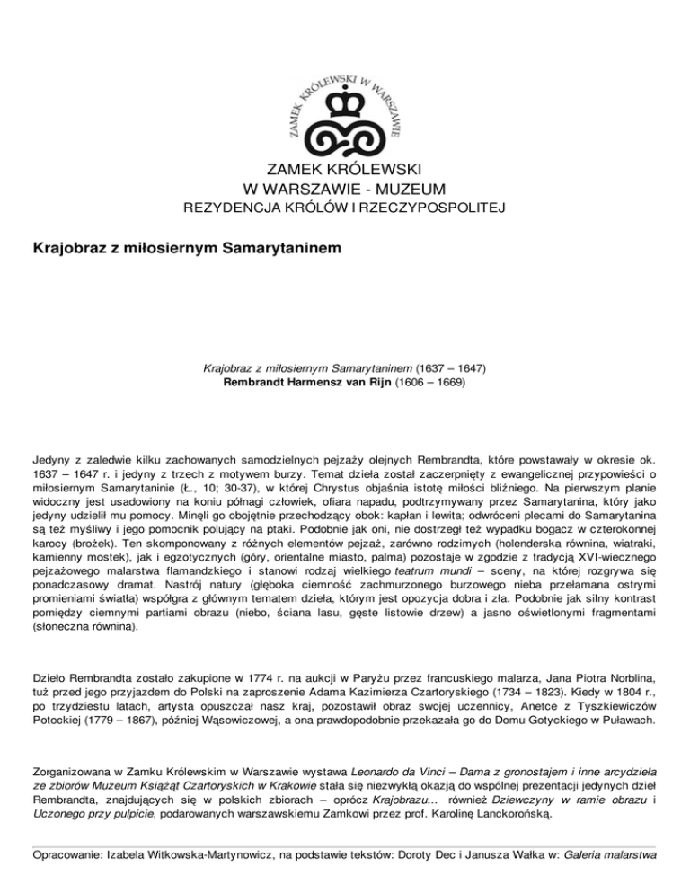 ZAMEK KRÓLEWSKI W WARSZAWIE - MUZEUM REZYDENCJA KRÓLÓW I RZECZYPOSPOLITEJ Krajobraz z miłosiernym Samarytaninem Krajobraz z miłosiernym Samarytaninem (1637 – 1647) Rembrandt Harmensz van Rijn (1606 – 1669) Jedyny z zaledwie kilku zachowanych samodzielnych pejzaży olejnych Rembrandta, które powstawały w okresie ok. 1637 – 1647 r. i jedyny z trzech z motywem burzy. Temat dzieła został zaczerpnięty z ewangelicznej przypowieści o miłosiernym Samarytaninie (Ł., 10; 30-37), w której Chrystus objaśnia istotę miłości bliźniego. Na pierwszym planie widoczny jest usadowiony na koniu półnagi człowiek, ofiara napadu, podtrzymywany przez Samarytanina, który jako jedyny udzielił mu pomocy. Minęli go obojętnie przechodzący obok: kapłan i lewita; odwróceni plecami do Samarytanina są też myśliwy i jego pomocnik polujący na ptaki. Podobnie jak oni, nie dostrzegł też wypadku bogacz w czterokonnej karocy (brożek). Ten skomponowany z różnych elementów pejzaż, zarówno rodzimych (holenderska równina, wiatraki, kamienny mostek), jak i egzotycznych (góry, orientalne miasto, palma) pozostaje w zgodzie z tradycją XVI-wiecznego pejzażowego malarstwa flamandzkiego i stanowi rodzaj wielkiego teatrum mundi – sceny, na której rozgrywa się ponadczasowy dramat. Nastrój natury (głęboka ciemność zachmurzonego burzowego nieba przełamana ostrymi promieniami światła) współgra z głównym tematem dzieła, którym jest opozycja dobra i zła. Podobnie jak silny kontrast pomiędzy ciemnymi partiami obrazu (niebo, ściana lasu, gęste listowie drzew) a jasno oświetlonymi fragmentami (słoneczna równina). Dzieło Rembrandta zostało zakupione w 1774 r. na aukcji w Paryżu przez francuskiego malarza, Jana Piotra Norblina, tuż przed jego przyjazdem do Polski na zaproszenie Adama Kazimierza Czartoryskiego (1734 – 1823). Kiedy w 1804 r., po trzydziestu latach, artysta opuszczał nasz kraj, pozostawił obraz swojej uczennicy, Anetce z Tyszkiewiczów Potockiej (1779 – 1867), później Wąsowiczowej, a ona prawdopodobnie przekazała go do Domu Gotyckiego w Puławach. Zorganizowana w Zamku Królewskim w Warszawie wystawa Leonardo da Vinci – Dama z gronostajem i inne arcydzieła ze zbiorów Muzeum Książąt Czartoryskich w Krakowie stała się niezwykłą okazją do wspólnej prezentacji jedynych dzieł Rembrandta, znajdujących się w polskich zbiorach – oprócz Krajobrazu... również Dziewczyny w ramie obrazu i Uczonego przy pulpicie, podarowanych warszawskiemu Zamkowi przez prof. Karolinę Lanckorońską. Opracowanie: Izabela Witkowska-Martynowicz, na podstawie tekstów: Doroty Dec i Janusza Wałka w: Galeria malarstwa europejskiego. Przewodnik Muzeum Książąt Czartoryskich, Kraków 2009 Zamek Królewski w Warszawie - Muzeum. Rezydencja Królów i Rzeczypospolitej www.zamek-krolewski.pl