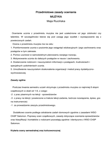 Przedmiotowe zasady oceniania MUZYKA Maja Rucińska Ocenianie ucznia z przedmiotu muzyka nie jest uzależnione od jego zdolności czy talentów. W szczególności bierze się pod uwagę jego wysiłek i wywiązywanie się z powierzonych zadań. Ocena z przedmiotu muzyka ma na celu: 1. Poinformowanie ucznia o poziomie jego osiągnięć edukacyjnych i jego zachowaniu oraz postępów w tym zakresie. 2. Pomoc uczniowi w samodzielnym planowaniu swojego rozwoju. 3. Motywowanie ucznia do dalszych postępów w nauce i zachowaniu. 4. Dostarczanie rodzicom i nauczycielom informacji o postępach, trudnościach i specjalnych uzdolnieniach ucznia. 5. Umożliwienie nauczycielom doskonalenia organizacji i metod pracy dydaktycznowychowawczej. Zasady ogólne Podczas trwania semestru uczeń otrzymuje z przedmiotu muzyka co najmniej 6 stopni cząstkowych w skali od 1-6, z czego: -2 z prac pisemnych na lekcji - sprawdzianów -3 z pracy na lekcji ( powierzone w trakcie lekcji zadania, twórcze rozwiązania, śpiew, gra na instrumencie) -1 za prowadzenie zeszytu przedmiotowego. Dodatkowo ocenie podlega odrabianie zadań domowych zgodnie z zasadami WSO ChSP Salomon. Poprawy ocen cząstkowych, zasady dotyczące oceniania sprawdzianów oraz klasyfikacji i kontaktów z rodzicami pozostają zgodnie i identyczne z WSO ChSP Salomon. Kryteria oceny semestralnej oraz końcoworocznej Ocenę celującą (6) otrzymuje uczeń, który spełnia wszystkie wymagania na ocenę bardzo dobrą, a także: – szczególnie interesuje się muzyką, posiada rozszerzone wiadomości z zakresu wiedzy o muzyce oraz umiejętności z zakresu tworzenia i ekspresji muzycznej, – ma wzorowo zorganizowany warsztat pracy, – jest wyróżniająco aktywny na lekcjach, – samodzielnie i twórczo rozwija indywidualne uzdolnienia artystyczne i zainteresowania muzyczne na zajęciach pozalekcyjnych, np. w zespole wokalnym, zespole instrumentalnym, zespole tanecznym, – sprawnie posługuje się zdobytymi wiadomościami w praktycznych i teoretycznych zadaniach muzycznych, – proponuje rozwiązania oryginalne i wykraczające poza materiał programowy, – prezentuje swoje umiejętności muzyczne w szkolnych i środowiskowych uroczystościach, akademiach, imprezach artystycznych, – reprezentuje szkołę w konkursach muzycznych. Ocenę bardzo dobrą ( 5) otrzymuje uczeń, który opanował na wysokim poziomie zakres wiedzy i umiejętności określony programem nauczania muzyki, a ponadto: – posługuje się w szerokim zakresie zdobytymi wiadomościami w praktycznych i teoretycznych zadaniach muzycznych, – pewnie realizuje pomysły muzyczne rozwijając własne uzdolnienia i zainteresowania muzyczne, – ma bardzo dobrze zorganizowany warsztat pracy, – wykazuje dużą aktywność podczas lekcji, – starannie wykonuje zadania i ćwiczenia praktyczne, – bardzo dobrze wywiązuje się z powierzonych zadań, – prezentuje twórczą postawę, jest zawsze przygotowany do zajęć. Ocenę dobrą (4) otrzymuje uczeń, który opanował zakres wiedzy w stopniu dobrym, a także: – potrafi wykorzystać zdobyte wiadomości i umiejętności w ćwiczeniach i zadaniach muzycznych, – stara się wywiązywać ze swoich obowiązków, – ma dobrze zorganizowany warsztat pracy, – samodzielnie rozwiązuje typowe zadania praktyczne i teoretyczne, – zazwyczaj pracuje systematycznie i efektywnie (indywidualnie i w zespole), – poprawnie formułuje wnioski, – dobrze wywiązuje się z powierzonych zadań, – bierze czynny udział w zajęciach lekcyjnych. Ocenę dostateczną (3) otrzymuje uczeń, który częściowo opanował zakres wiedzy i umiejętności określony programem nauczania muzyki oraz: – najczęściej uzyskuje dostateczne oceny cząstkowe, – wykonuje typowe ćwiczenia i zadania muzyczne o średnim stopniu trudności, często z pomocą nauczyciela, - ma słabo zorganizowany warsztat pracy, – nie zawsze pracuje systematycznie, – rzadko uczestniczy w dyskusjach i pracach zespołowo-grupowych, – przejawia niezdecydowanie i powściągliwość w działaniach muzycznych. Ocenę dopuszczającą (2) otrzymuje uczeń, który na poziomie elementarnym opanował zakres wiedzy i umiejętności określony programem nauczania muzyki, a także: – z pomocą nauczyciela realizuje ćwiczenia i zadania muzyczne o łatwym stopniu trudności, – nie potrafi samodzielnie wykonać działań w poszczególnych formach aktywności, – nie pracuje systematycznie, – niestarannie wykonuje ćwiczenia, – niechętnie podejmuje działania muzyczne, – prezentuje bierną postawę podczas zajęć, – z trudnością organizuje swój warsztat pracy, -nie wywiązuje się z obowiązków i powierzonych zadań. Ocenę niedostateczną (1) otrzymuje uczeń, który nie opanował minimum wiadomości określonych programem nauczania oraz: – nie przejawia zainteresowania przedmiotem oraz żadną aktywnością muzyczną, – wykazuje lekceważący stosunek do przedmiotu, – nie opanował żadnych umiejętności muzycznych, – jest nieprzygotowany do lekcji, – nie prowadzi zeszytu przedmiotowego, nie uzupełnia ćwiczeń, – nie wykazuje żadnej chęci poprawy oceny, – ocena ta nie wynika z możliwości czy z braku uzdolnień ucznia, lecz z całkowitej niechęci do przedmiotu oraz pracy na lekcjach muzyki.