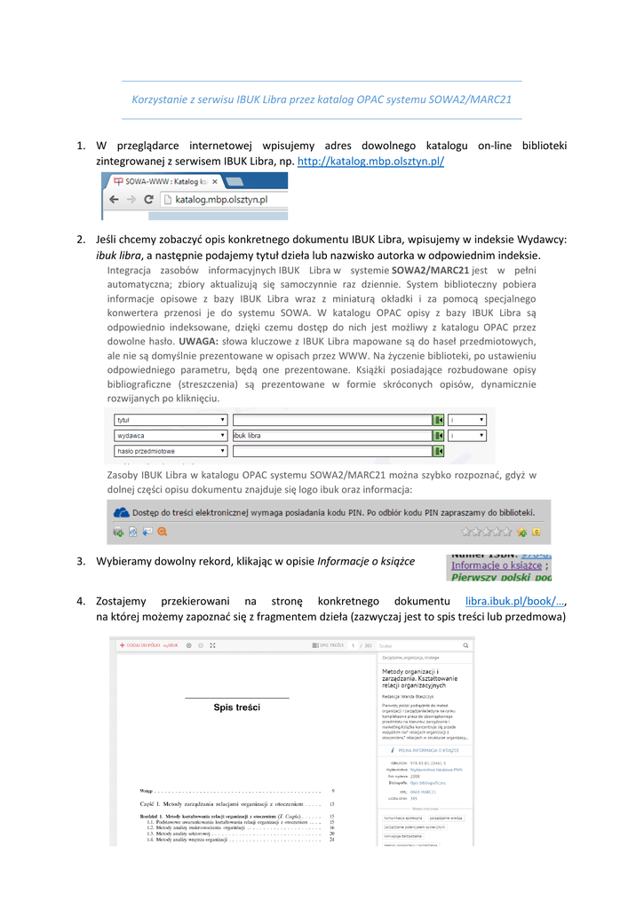 Korzystanie z serwisu IBUK Libra przez katalog OPAC systemu SOWA2/MARC21 1. W przeglądarce internetowej wpisujemy adres dowolnego katalogu on-line biblioteki zintegrowanej z serwisem IBUK Libra, np. http://katalog.mbp.olsztyn.pl/ 2. Jeśli chcemy zobaczyć opis konkretnego dokumentu IBUK Libra, wpisujemy w indeksie Wydawcy: ibuk libra, a następnie podajemy tytuł dzieła lub nazwisko autorka w odpowiednim indeksie. Integracja zasobów informacyjnych IBUK Libra w systemie SOWA2/MARC21 jest w pełni automatyczna; zbiory aktualizują się samoczynnie raz dziennie. System biblioteczny pobiera informacje opisowe z bazy IBUK Libra wraz z miniaturą okładki i za pomocą specjalnego konwertera przenosi je do systemu SOWA. W katalogu OPAC opisy z bazy IBUK Libra są odpowiednio indeksowane, dzięki czemu dostęp do nich jest możliwy z katalogu OPAC przez dowolne hasło. UWAGA: słowa kluczowe z IBUK Libra mapowane są do haseł przedmiotowych, ale nie są domyślnie prezentowane w opisach przez WWW. Na życzenie biblioteki, po ustawieniu odpowiedniego parametru, będą one prezentowane. Książki posiadające rozbudowane opisy bibliograficzne (streszczenia) są prezentowane w formie skróconych opisów, dynamicznie rozwijanych po kliknięciu. Zasoby IBUK Libra w katalogu OPAC systemu SOWA2/MARC21 można szybko rozpoznać, gdyż w dolnej części opisu dokumentu znajduje się logo ibuk oraz informacja: 3. Wybieramy dowolny rekord, klikając w opisie Informacje o książce 4. Zostajemy przekierowani na stronę konkretnego dokumentu libra.ibuk.pl/book/…, na której możemy zapoznać się z fragmentem dzieła (zazwyczaj jest to spis treści lub przedmowa) 5. Jeśli chcemy uzyskać dostęp do treści dokumentu, musimy zarejestrować się na stronie http://libra.ibuk.pl/ (rejestracja jest darmowa i wymaga podania tylko adresu e-mail i hasła) 6. Korzystanie z IBUK Libra: a. jeśli korzystamy z komputera znajdującego się w sieci lokalnej biblioteki – automatycznie uzyskujemy aktywny dostęp zdalny do zbiorów wykupionych przez bibliotekę lub konsorcjum bibliotek b. jeśli korzystamy z komputera znajdującego się poza siecią lokalną biblioteki – musimy w lewym górnym rogu, wybrać +DODAJ BIBLIOTEKĘ i wprowadzić podany przez bibliotekarza kod PIN c. warto kliknąć +OTWÓRZ w myIBUK, aby dodać dokument na wirtualną półkę oraz swobodnie korzystać z wbudowanego czytnika (można zaznaczać fragmenty tekstu, opisywać je, tworzyć tagi, generować bibliografię, korzystać ze słownika i encyklopedii; nie jest możliwy wydruk treści dokumentu). UWAGA: zasoby informacyjne IBUK Libra w katalogu on-line są traktowane tak jak wszystkie inne opisy bibliograficzne. Dotyczy to także generowania zestawień liniowych przez WWW. Rekordy IBUK Libra w systemie SOWA2/MARC21 Rekordy IBUK Libra w systemie SOWA2/MARC21 są widoczne w module katalogowania. Można je rozpoznać po ikonie (w prawym górnym rogu). Rekordy IBUK Libra można „otworzyć”, ale nie można ich edytować (zakładka opis MARC21). W zakładce pola lokalne możliwe jest zmodyfikowanie rekordu poprzez dodanie haseł przedmiotowych. W tym celu należy skorzystać z opcji Dodaj a następnie Pole haseł przedmiotowych. Hasła przedmiotowe można dodać korzystając z lokalnego słownika haseł lub ze słownika BN CKHW. Dodane hasło przedmiotowe w systemie bibliotecznym jest widoczne w katalogu internetowym biblioteki. UWAGA: Postępowanie przy modyfikacji rekordów „Wolnych Lektur” jest takie samo jak w przypadku rekordów IBUK Libra.