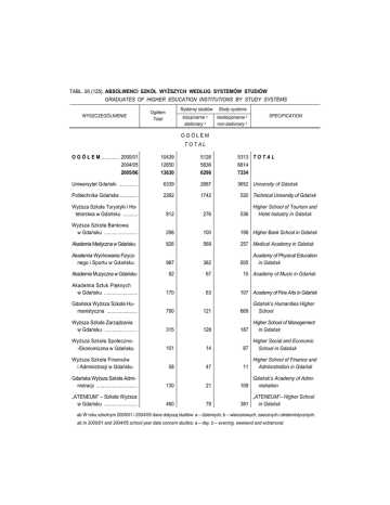 TABL. 26 (125). ABSOLWENCI SZKÓŁ WYŻSZYCH WEDŁUG SYSTEMÓW STUDIÓW GRADUATES OF HIGHER EDUCATION INSTITUTIONS BY STUDY SYSTEMS WYSZCZEGÓLNIENIE Systemy studiów Ogółem Total stacjonarne a stationary a Study systems niestacjonarne b non-stationary b SPECIFICATION OGÓŁEM TOTAL O G Ó Ł E M............................ 2000/01 2004/05 2005/06 10439 12650 13630 5126 5836 6296 5313 T O T A L 6814 7334 Uniwersytet Gdański .............. 6339 2687 3652 University of Gdańsk Politechnika Gdańska ............. 2262 1742 Wyższa Szkoła Turystyki i Hotelarstwa w Gdańsku ........... 812 276 536 Wyższa Szkoła Bankowa w Gdańsku ......................... 298 100 198 Higher Bank School in Gdańsk Akademia Medyczna w Gdańsku 826 569 257 Medical Academy in Gdańsk Akademia Wychowania Fizycznego i Sportu w Gdańsku 987 382 605 Akademia Muzyczna w Gdańsku 82 67 15 Academy of Music in Gdańsk Akademia Sztuk Pięknych w Gdańsku ......................... 170 63 107 Academy of Fine Arts in Gdańsk Gdańska Wyższa Szkoła Humanistyczna ....................... 790 121 669 Gdańsk’s Humanities Higher School Wyższa Szkoła Zarządzania w Gdańsku ......................... 315 128 187 Higher School of Management in Gdańsk Wyższa Szkoła Społeczno-Ekonomiczna w Gdańsku 101 14 87 Higher Social and Economic School in Gdańsk Wyższa Szkoła Finansów i Administracji w Gdańsku 58 47 11 Higher School of Finance and Administration in Gdańsk Gdańska Wyższa Szkoła Administracji ............................... 130 21 109 Gdańsk’s Academy of Administration „ATENEUM” – Szkoła Wyższa w Gdańsku ......................... 460 79 381 „ATENEUM”– Higher School in Gdańsk 520 Technical University of Gdańsk Higher School of Tourism and Hotel Industry in Gdańsk Academy of Physical Education in Gdańsk ab W roku szkolnym 2000/01 i 2004/05 dane dotyczą studiów: a – dziennych, b – wieczorowych, zaocznych i eksternistycznych. ab In 2000/01 and 2004/05 school year data concern studies: a – day, b – evening, weekend and extramural. TABL. 26 (125). ABSOLWENCI SZKÓŁ WYŻSZYCH WEDŁUG SYSTEMÓW STUDIÓW (dok.) GRADUATES OF HIGHER EDUCATION INSTITUTIONS BY STUDY SYSTEMS (cont.) WYSZCZEGÓLNIENIE Systemy studiów Ogółem Total stacjonarne a stationary a Study systems niestacjonarne b non-stationary b SPECIFICATION W tym KOBIETY Of which FEMALES O G Ó Ł E M............................ 2000/01 2004/05 2005/06 6461 8193 8848 2860 3522 3712 3601 T O T A L 4671 5136 Uniwersytet Gdański .............. 4648 1893 2755 University of Gdańsk Politechnika Gdańska ............. 892 656 236 Technical University of Gdańsk Wyższa Szkoła Turystyki i Hotelarstwa w Gdańsku ........... 557 172 385 Wyższa Szkoła Bankowa w Gdańsku ......................... 242 76 166 Higher Bank School in Gdańsk Akademia Medyczna w Gdańsku 657 418 239 Medical Academy in Gdańsk Akademia Wychowania Fizycznego i Sportu w Gdańsku 451 178 273 Akademia Muzyczna w Gdańsku 50 44 6 Academy of Music in Gdańsk Akademia Sztuk Pięknych w Gdańsku ......................... 131 45 86 Academy of Fine Arts in Gdańsk Gdańska Wyższa Szkoła Humanistyczna ....................... 564 82 482 Gdańsk’s Humanities Higher School Wyższa Szkoła Zarządzania w Gdańsku ......................... 113 39 74 Higher School of Management in Gdańsk Wyższa Szkoła Społeczno-Ekonomiczna w Gdańsku 52 3 49 Higher Social and Economic School in Gdańsk Wyższa Szkoła Finansów i Administracji w Gdańsku 47 36 11 Higher School of Finance and Administration in Gdańsk Gdańska Wyższa Szkoła Administracji ............................... 90 12 78 Gdańsk’s Academy of Administration „ATENEUM” – Szkoła Wyższa w Gdańsku ......................... 354 58 296 „ATENEUM”– Higher School in Gdańsk Higher School of Tourism and Hotel Industry in Gdańsk Academy of Physical Education in Gdańsk ab W roku szkolnym 2000/01 i 2004/05 dane dotyczą studiów: a – dziennych, b – wieczorowych, zaocznych i eksternistycznych. ab In 2000/01 and 2004/05 school year data concern studies: a – day, b – evening, weekend and extramural.