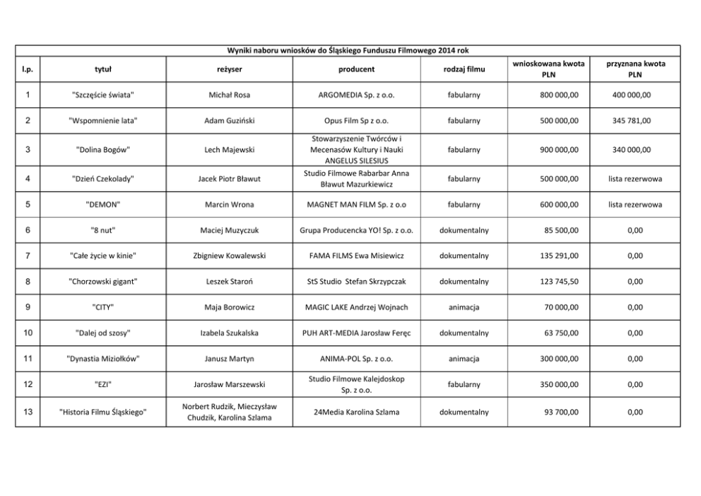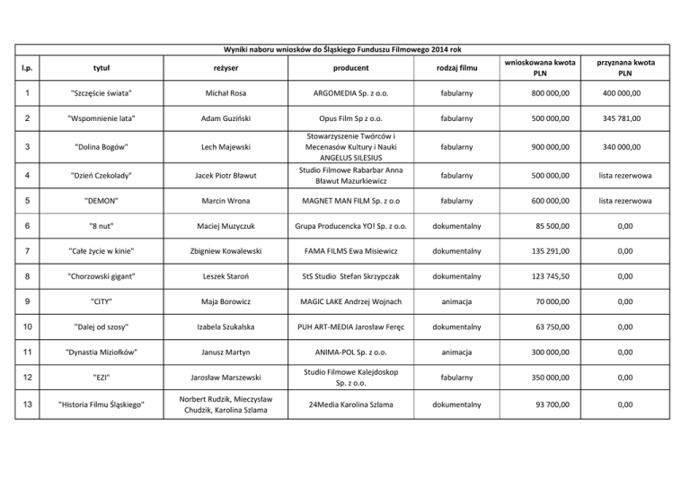 Wyniki naboru wniosków do Śląskiego Funduszu Filmowego 2014 rok wnioskowana kwota PLN przyznana kwota PLN l.p. tytuł reżyser producent rodzaj filmu 1 "Szczęście świata" Michał Rosa ARGOMEDIA Sp. z o.o. fabularny 800 000,00 400 000,00 2 "Wspomnienie lata" Adam Guziński Opus Film Sp z o.o. fabularny 500 000,00 345 781,00 3 "Dolina Bogów" Lech Majewski fabularny 900 000,00 340 000,00 4 "Dzień Czekolady" Jacek Piotr Bławut fabularny 500 000,00 lista rezerwowa 5 "DEMON" Marcin Wrona MAGNET MAN FILM Sp. z o.o fabularny 600 000,00 lista rezerwowa 6 "8 nut" Maciej Muzyczuk Grupa Producencka YO! Sp. z o.o. dokumentalny 85 500,00 0,00 7 "Całe życie w kinie" Zbigniew Kowalewski FAMA FILMS Ewa Misiewicz dokumentalny 135 291,00 0,00 8 "Chorzowski gigant" Leszek Staroń StS Studio Stefan Skrzypczak dokumentalny 123 745,50 0,00 9 "CITY" Maja Borowicz MAGIC LAKE Andrzej Wojnach animacja 70 000,00 0,00 10 "Dalej od szosy" Izabela Szukalska PUH ART-MEDIA Jarosław Feręc dokumentalny 63 750,00 0,00 11 "Dynastia Miziołków" Janusz Martyn ANIMA-POL Sp. z o.o. animacja 300 000,00 0,00 12 "EZI" Jarosław Marszewski Studio Filmowe Kalejdoskop Sp. z o.o. fabularny 350 000,00 0,00 13 "Historia Filmu Śląskiego" Norbert Rudzik, Mieczysław Chudzik, Karolina Szlama 24Media Karolina Szlama dokumentalny 93 700,00 0,00 Stowarzyszenie Twórców i Mecenasów Kultury i Nauki ANGELUS SILESIUS Studio Filmowe Rabarbar Anna Bławut Mazurkiewicz 14 "Informacje niejawne" Gerwazy Paweł Reguła Alternative Studio Marek Klimaszewski fabularny 600 000,00 0,00 15 "Krzyżoki" Anna Gawlita KIJORA ANNA GAWLITA dokumentalny 45 000,00 0,00 16 "LIFE MUST GO ON!" Maciej Migas Instytucja Filmowa FILM-ART. fabularny 200 000,00 0,00 17 "MARZYCIEL I METAFIZYKA" Dagmara Drzazga TVP S.A. O/K-ce dokumentalny 89 400,00 0,00 18 "Michał Spisak - listy rozproszone" Violetta Rotter Kozera TVP S.A. O/K-ce dokumentalny 90 000,00 0,00 19 "Niekoniecznie o Jędrzeju" Olga Kałagate Stowarzyszenie Filmowców Polskich fabularny 45 000,00 0,00 20 "NIEPODLEGŁOŚĆ" Krzysztof Talczewski Grupa dr. A.R Kwiecińskiego dokumentalny 300 000,00 0,00 21 "Obrona Męki Bożej" Stefan Skrzypczak StS Studio Stefan Skrzypczak dokumentalny 66 554,00 0,00 22 "ORŁY" Wojciech Klimala NORDFILM Sp. z o.o. fabularny 500 000,00 0,00 23 "Pan Toti" Łukasz Słuszkiewicz, Jaroslav Baran ORANGE Studio Animacji Sp. z o.o. animacja 160 160,00 0,00 24 "Perfect killing" Antonio Ernesto Galdamez Munoz TOFI PRODUCTIONS S.C. T. Morawski, F. Haman fabularny 75 000,00 0,00 25 "Photon" Norman Leto (Łukasz Banach) Lightcraft Advertising Sp. z o.o. animacja 385 800,00 0,00 26 "Pieroński styl" Aleksander Kozłowski, Michał Muzyczuk Grupa Producencka YO! Sp. z o.o. dokumentalny 70 000,00 0,00 27 "Przekraczając granice Kapuściński" Andreas Hoessli CENTRALA DISTRIBUTION Sp. z o.o. dokumentalny 98 163,84 0,00 28 "Rekonstrukcja mitu-Stanisław Szukalski zapomniany wizjoner" Wojciech Królikowski PUH ART-MEDIA Jarosław Feręc dokumentalny 75 000,00 0,00 29 "Skaza niewinnych" Radosław Markiewicz GFM Grupa Fresh Media Jacek Czepułkowski fabularny 375 780,00 0,00 30 "Szurman" Paweł Smolorz ANTENA GÓRNOŚLĄSKA Studio Programów i Filmów Telewizyjnych dokumentalny 85 102,51 0,00 31 "Ucho wewnętrzne" Magdalena Gubała, Szymon Uliasz MAGIC PRODUCTION Sp. z o.o. dokumentalny 150 000,00 0,00 32 "Życie jak muzyka - ballada o zespole Dżem" Paweł Bogocz "DŻEM" S.C. L. Martinek i wspólnicy dokumentalny 187 310,00 0,00 33 "Biskup robotników" Wojciech Sarnowicz ANTENA GÓRNOŚLĄSKA Studio Programów i Filmów Telewizyjnych dokumentalny 93 289,00 wniosek wycofany na prośbę producenta 34 "Gwiazdy" Jan Kidawa - Błoński Film Point Group Sp. z o.o. fabularny 500 000,00 wniosek złożony po wymaganym terminie 35 "Kalafiory o smaku kiwi" Tomasz Jurkiewicz CENTRALA DISTRIBUTION Sp. z o.o. fabularny 200 000,00 wniosek wycofany na prośbę producenta 36 "Miesiąc miodowy" Andy Fetscher Papermoon films gmbh fabularny 250 000,00 wniosek nie spełniał wymogów formalnych 37 "Ojczulek Polaków" Grzegorz Łubczyk Fundacja Dobre Wieści dokumentalny 80 000,00 wniosek złożony po wymaganym terminie
