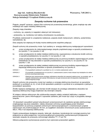 mgr inż. Andrzej Boczkowski Stowarzyszenie Elektryków Polskich Sekcja Instalacji i Urządzeń Elektrycznych Warszawa, 7.05.2013 r. Zespoły ruchome lub przewoźne Pojęcie „zespół” oznacza pojazd i/lub ruchomą lub przewoźną konstrukcję, gdzie znajduje się cała instalacja lub część instalacji elektrycznej. Zespoły mają charakter - ruchomy, np. pojazdy (z napędem własnym lub holowane); - przewoźny, np. kontenery lub kabiny zmontowane na podwoziu. Przykłady zastosowań to urządzenia nadawcze, pojazdy służb medycznych, reklamy, pożarnictwa, warsztatowe, itp. Dwa zespoły lub większą ich liczbę można elektrycznie wspólnie połączyć. Zespół ruchomy lub przewoźny może być zasilany w energię elektryczną następującymi sposobami: a) przez przyłączenie do niskonapięciowego zespołu prądotwórczego w sposób przedstawiony na rysunku 1 i na rysunku 2, lub b) przez przyłączenie do stałej instalacji elektrycznej, wyposażonej w skuteczne środki ochrony w sposób przedstawiony na rysunku 3 i na rysunku 4 , lub c) przez przyłączenie do stałej instalacji elektrycznej za pomocą środków zapewniających proste oddzielenie od niej obwodów w sposób przedstawiony na rysunku 5, na rysunku 6 i na rysunku 7, lub d) przez przyłączenie do stałej instalacji elektrycznej za pomocą środków zapewniających separację elektryczną obwodów w sposób przedstawiony na rysunku 8. UWAGA 1 W przypadkach podanych w punktach a), b) i c) można zastosować uziom. UWAGA 2 W przypadku przedstawionym na rysunku 5, zastosowanie uziomu może okazać się niezbędne do celów ochrony przeciwporażeniowej. UWAGA 3 Właściwe jest zastosowanie prostego oddzielenia obwodów lub separacji elektrycznej, na przykład, gdy w zespole zastosowany jest sprzęt informatyczny lub gdy konieczne jest zmniejszenie oddziaływania elektromagnetycznego. Zespół ruchomy lub przewoźny może być zasilany w energię elektryczną dowolnym ze sposobów podanych w punktach a), b), c) lub d) lub sposobem podanym w punkcie a) w powiązaniu z jednym z pozostałych sposobów. Źródła napięcia zasilającego, jak również środki służące do prostego oddzielenia obwodów lub separacji elektrycznej mogą znajdować się wewnątrz zespołu. W miejscu dobrze widocznym dla użytkownika zespołu należy umieścić tabliczkę z napisem jednoznacznie i jasno informującym o sposobie zasilania, jaki może być użyty w przypadku danego zespołu. W obwodach wszystkich gniazd wtyczkowych przeznaczonych do zasilania sprzętu elektrycznego znajdującego się poza zespołem, należy stosować ochronę uzupełniającą przed dotykiem bezpośrednim za pomocą urządzeń ochronnych różnicowoprądowych o znamionowym prądzie różnicowym nie przekraczającym 30 mA, za wyjątkiem obwodów chronionych przez zastosowanie SELV, PELV lub separacji elektrycznej. Części przewodzące dostępne zespołu, takie jak: obudowa, konstrukcja lub rurociągi powinny być połączone ze sobą wzajemnie i za pomocą głównych przewodów wyrównawczych przyłączone wewnątrz zespołu do przewodu ochronnego układów TT, IT lub TN. Główne połączenie wyrównawcze powinno być wykonane przewodem giętkim. 1 Połączenie zespołu ze źródłem zasilania należy wykonać przewodami o przekroju co najmniej 2 2,5 mm Cu. Przewody giętkie należy wprowadzać do zespołu za pomocą przepustów tak, aby zminimalizować możliwość uszkodzenia izolacji lub powstania zwarcia i w efekcie pojawienia się napięcia na częściach przewodzących dostępnych zespołu. Powłoka przewodów powinna być pewnie przymocowana do zespołu. Urządzenia, stosowane do połączenia zespołu ze źródłem zasilania, powinny spełniać następujące wymagania: - wtyczki powinny mieć obudowę z materiału izolacyjnego, - wtyczki i gniazda wtyczkowe, znajdujące się na zewnątrz zespołu, powinny zapewniać stopień ochrony nie niższy niż IP44, - obudowy wtyczek odbiornikowych powinny zapewniać stopień ochrony co najmniej IP55, - wtyczka odbiornikowa powinna być usytuowana na zespole. Gniazda wtyczkowe usytuowane na zewnątrz zespołu powinny mieć obudowy zapewniające stopień ochrony nie niższy niż IP54. 2 L1 RCD L2 L3 14 1c N PE 7 15 14 15 7a 16a 5 15 13 M 6 6 RCD 30 mA 18 2 7b 15 7d 7c i/lub 7e 15 4 10 10 UWAGA: Ochrona polegająca na samoczynnym wyłączeniu zasilania za pomocą urządzenia ochronnego różnicowoprądowego (RCD) Rys. 1. Przykład połączenia zespołu ruchomego lub przewoźnego z niskonapięciowym zespołem prądotwórczym I lub II klasy ochronności, umieszczonym wewnątrz zespołu (z uziomem lub bez uziomu) 3 Niskonapięciowy zespół prądotwórczy II klasy ochronności L1 RCD L2 L3 14 N 1c PE 7 15 14 15 15 7a 5 16a 13 M 6 6 RCD 30 mA 18 2 7b 15 7d 7c i/lub 7e 15 4 10 Rys.2. 10 Przykład połączenia zespołu ruchomego lub przewoźnego z niskonapięciowy zespołem prądotwórczym II klasy ochronności, umieszczonym poza zespołem(z uziomem lub bez uziomu) Objaśnienia do rysunku 1 i rysunku 2 1c Przyłączenie do niskonapięciowego zespołu prądotwórczego 2 Obudowa II klasy ochronności lub o izolacji równoważnej, obejmująca pierwsze urządzenie zabezpieczające, zapewniające samoczynne wyłączenie zasilania 4 Schodki przewodzące, jeżeli przewidziano schodki 5 Przyłączenie punktu neutralnego (lub, jeżeli jest on niedostępny, przewodu fazowego) do przewodzącej konstrukcji zespołu 6 Gniazda wtyczkowe do wyłącznego stosowania w zespole 7 Połączenie wyrównawcze główne: 7a do masztu anteny, jeżeli przewidziano taki 7b do przewodzących schodów zewnętrznych stykających się z ziemią, jeżeli przewidziano takie 7c do funkcjonalnego uziomu (w razie potrzeby) 7d do przewodzącej obudowy zespołu 7e do uziomu do celów ochrony, jeżeli przewidziano taki 10 Gniazda wtyczkowe do zasilania sprzętu elektrycznego, przeznaczonego do stosowania poza zespołem 4 13 Sprzęt elektryczny do zastosowania w ze
