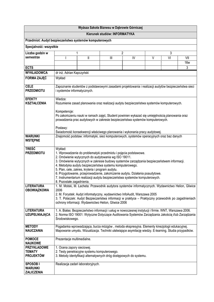WyŜsza Szkoła Biznesu w Dąbrowie Górniczej Kierunek studiów: INFORMATYKA Przedmiot: Audyt bezpieczeństwa systemów komputerowych Specjalność: wszystkie Liczba godzin w semestrze 1 I 2 II III IV V 3 VI VII 16w 3 ECTS WYKŁADOWCA dr inŜ. Adrian Kapczyński FORMA ZAJĘĆ Wykład CELE PRZEDMIOTU Zapoznanie studentów z podstawowymi zasadami projektowania i realizacji audytów bezpieczeństwa sieci i systemów informatycznych. EFEKTY KSZTAŁCENIA Wiedza: Rozumienie zasad planowania oraz realizacji audytu bezpieczeństwa systemów komputerowych. Kompetencje: Po zakończeniu nauki w ramach zajęć, Student powinien wykazać się umiejętnością planowania oraz prowadzenia prac audytowych w zakresie bezpieczeństwa systemów komputerowych. WARUNKI WSTĘPNE TREŚĆ PRZEDMIOTU LITERATURA OBOWIĄZKOWA Postawy: Świadomość konsekwencji właściwego planowania i wykonania pracy audytowej. Znajomość podstaw: informatyki, sieci komputerowych, systemów operacyjnych oraz baz danych Wykład: 1. Wprowadzenie do problematyki przedmiotu i pojęcia podstawowe. 2. Omówienie wytycznych do audytowania wg ISO 19011. 3. Omówienie wytycznych w zakresie budowy systemów zarządzania bezpieczeństwem informacji. 4. Metodyka audytu bezpieczeństwa systemu komputerowego. 5. Plan, cele, zakres, kryteria i program audytu. 6. Przygotowanie, przeprowadzenie, zakończenie audytu. Działania poaudytowe. 7. Instrumentarium realizacji audytu bezpieczeństwa systemów komputerowych. 8. Pozostałe zagadnienia. 1. M. Molski, M. Łacheta: Przewodnik audytora systemów informatycznych. Wydawnictwo Helion, Gliwice 2006 2. M. Forystek: Audyt informatyczny, wydawnictwo InfoAudit, Warszawa 2005 3. T. Polaczek: Audyt Bezpieczeństwa informacji w praktyce – Praktyczny przewodnik po zagadnieniach ochrony informacji. Wydawnictwo Helion, Gliwice 2006 LITERATURA UZUPEŁNIAJĄCA 1. A. Białas: Bezpieczeństwo informacji i usług w nowoczesnej instytucji i firmie. WNT, Warszawa 2006. 2. Norma ISO 19001: Wytyczne Dotyczące Auditowania Systemów Zarządzania Jakością i/lub Zarządzania Środowiskowego. METODY NAUCZANIA Pogadanka wprowadzająca, burza mózgów , metoda ekspresyjna. Elementy kinezjologii edukacyjnej. Mapowanie umysłu. Wizualizacja. Techniki ułatwiające asymilację wiedzy. E-learning. Studia przypadków. POMOCE NAUKOWE PRZYKŁADOWE TEMATY PROJEKTÓW Prezentacje multimedialne. SPOSÓB I WARUNKI ZALICZENIA Realizacja zadań laboratoryjnych. 1. Ocena zapory sieciowej. 2. Testy penetracyjne systemu komputerowego. 3. Metody identyfikacji alternatywnych dróg dostępowych do systemu. PRZEDMIOTU PRZYKŁADOWE 1. Definicje normatywne atrybutów bezpieczeństwa informacji. ZAGADNIENIA (ew. 2. Komputerowe narzędzia wspomagające dokumentowanie prac audytora. pytania) EGZAMINU/ ZALICZENIA