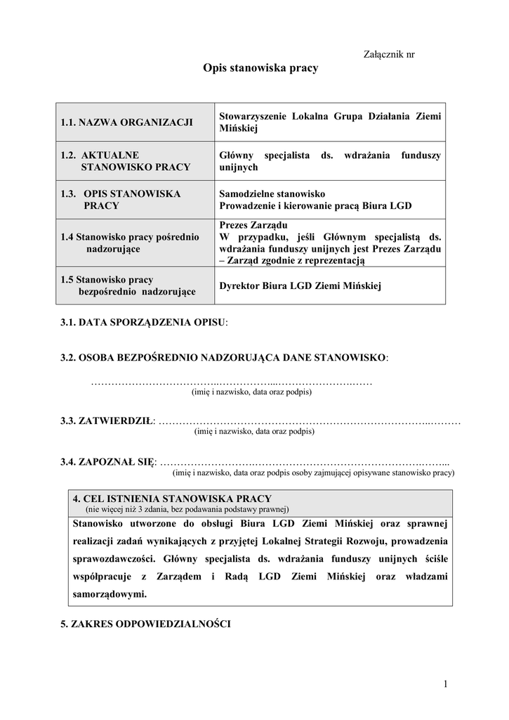 Załącznik nr Opis stanowiska pracy 1.1. NAZWA ORGANIZACJI Stowarzyszenie Lokalna Grupa Działania Ziemi Mińskiej 1.2. AKTUALNE STANOWISKO PRACY Główny specjalista unijnych 1.3. OPIS STANOWISKA PRACY Samodzielne stanowisko Prowadzenie i kierowanie pracą Biura LGD 1.4 Stanowisko pracy pośrednio nadzorujące Prezes Zarządu W przypadku, jeśli Głównym specjalistą ds. wdrażania funduszy unijnych jest Prezes Zarządu – Zarząd zgodnie z reprezentacją 1.5 Stanowisko pracy bezpośrednio nadzorujące Dyrektor Biura LGD Ziemi Mińskiej ds. wdrażania funduszy 3.1. DATA SPORZĄDZENIA OPISU: 3.2. OSOBA BEZPOŚREDNIO NADZORUJĄCA DANE STANOWISKO: ………………………………..……………...………………….…… (imię i nazwisko, data oraz podpis) 3.3. ZATWIERDZIŁ: ……………………………………………………………………..……… (imię i nazwisko, data oraz podpis) 3.4. ZAPOZNAŁ SIĘ: ……………………….………………………………………….……... (imię i nazwisko, data oraz podpis osoby zajmującej opisywane stanowisko pracy) 4. CEL ISTNIENIA STANOWISKA PRACY (nie więcej niż 3 zdania, bez podawania podstawy prawnej) Stanowisko utworzone do obsługi Biura LGD Ziemi Mińskiej oraz sprawnej realizacji zadań wynikających z przyjętej Lokalnej Strategii Rozwoju, prowadzenia sprawozdawczości. Główny specjalista ds. wdrażania funduszy unijnych ściśle współpracuje z Zarządem i Radą LGD Ziemi Mińskiej oraz władzami samorządowymi. 5. ZAKRES ODPOWIEDZIALNOŚCI 1 a) prowadzenie doradztwa oraz szkoleń i warsztatów dla beneficjentów w sprawie możliwości i warunków otrzymania dofinansowania zgodnie z Planem Komunikacji LSR, b) udział w posiedzeniach organu decyzyjnego LGD i świadczenie bieżącej pomocy członkom Rady w przygotowaniu i wypełnianiu kart oceny operacji, c) informowanie, zgodnie z przyjętymi procedurami, o wynikach oceny i możliwości wniesienia protestu po zakończonej ocenie wniosków przez Radę, d) zamieszczenie informacji o posiedzeniu Rady i protokołu z posiedzenia na stronie internetowej LGD, e) prowadzenie rejestru interesu członków Rady i aktualizacja informacji zawartych w rejestrze, współpraca w tym zakresie z Przewodniczącym Rady, f) zbieranie wniosków dotyczących zmiany i aktualizacji kryteriów wyboru operacji i ich analiza w celu realizacji procedury zmiany lokalnych kryteriów wyboru przyjętej przez LGD, g) realizowanie innych zadań zleconych przez Dyrektora Biura. h) gromadzenie i udostępnianie informacji i dokumentacji z zakresu działalności Stowarzyszenia, i) opracowywanie projektów zmian w statucie i regulaminach organizacyjnych, j) nadzór nad przygotowaniem i wdrażaniem projektów w ramach Lokalnej Strategii Rozwoju LGD, k) nadzór nad prowadzeniem działań związanych z podnoszeniem kwalifikacji zawodowych pracowników Biura wg zatwierdzonego planu szkoleń, l) udział w różnego rodzaju naradach, sympozjach, szkoleniach, uroczystościach związanych z działalnością LGD m) prowadzenie monitoringu w zakresie nowych wytycznych (rozporządzenia, ustawy) związane z realizacją projektu, n) monitorowanie problematyki związanej z Funduszami Unii Europejskiej, o) udział w innych pracach wynikających z zadań LGD, p) prowadzenie działań związanych ze współpracą międzyregionalną i międzynarodową w celu realizacji Projektów Współpracy LGD, q) monitorowanie realizacji LSR r) prowadzenie promocji LGD s) redagowanie notatek prasowych i informacji na stronę internetową t) nadzór nad prawidłowym funkcjonowaniem i aktualizacją strony internetowej LGD u) koordynowanie działań związanych z aktualizacją LSR 2 v) współpraca z organizacjami pozarządowymi w) udzielanie informacji o działalności o LGD, odpowiedzi i wyjaśnień dot. wdrażania LSR – telefonicznie, ustnie, pisemnie lub za pośrednictwem Internetu x) realizacja projektów LGD, w szczególności w zakresie organizacyjno-promocyjnym y) kierowanie pracami w Biurze, pracownikami, zleceniobiorcami z) organizacja szkoleń dla beneficjentów LGD, spotkań i konferencji 6. UPOWAŻNIENIA Upoważnia się pracownika do reprezentowania LGD Ziemi Mińskiej w obszarze wynikającym z powierzonych zadań oraz do odbioru i składania odpowiednich dokumentów. Upoważnia się pracownika do posługiwania się pieczątką firmową Stowarzyszenia LGD Ziemi Mińskiej i podpisywania korespondencji w sprawach organizacyjnych i administracyjnych. Upoważnia się pracownika do prowadzenia korespondencji z partnerami zagranicznymi. 7. ZŁOŻONOŚĆ / KREATYWNOŚĆ Od pracownika oczekuje się: kreatywności i aktywności, - komunikatywności i sprawnej obsługi interesantów. - umiejętności wykorzystania posiadanej wiedzy w praktyce i szybkiego podejmowania decyzji, - dobrego planowania i organizacja pracy swojej i zespołu, - efektywne współdziałanie w zespole, - skuteczne porozumiewanie się, - odpowiedzialności i rzetelności, - dokładności i skrupulatności, - silnej motywacji do podnoszenia kwalifikacji i doskonalenia umiejętności. 8. KONTAKTY ZEWNĘTRZNE: Utrzymywanie stałych kontaktów z jednostkami wdrażającymi program Leader. Stała współpraca z samorządami lokalnymi, samorządem powiatowym i wojewódzkim. Współpraca z innymi LGD w kraju i zagranicą. Kontakty z podmiotami, które mogą być partnerami w realizacji zadań jakie przyjęła LGD Ziemi Mińskiej w LSR. 9. NIEZBĘDNA SAMODZIELNOŚĆ I INICJATYWA: Od pracownika oczekuje się samodzielności w podejmowaniu decyzji, umiejętności nadzorowania zespołów ludzi, 3 Umiejętności w określaniu priorytetów odpowiednich do problemu i kalkulacji następstw decyzji oraz podejmowania ryzyka, Umiejętności w kontaktach z innymi ludźmi i stałe doskonalenie pracy Biura LGD. 10. WARUNKI PRACY 1. Pracownikowi przysługuje samodzielne stanowisko pracy. 2. Stanowisko pracy jest wyposażone w komputer, telefon i inne niezbędn
