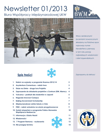 Newsletter 01/2013 Biura Współpracy Międzynarodowej UKW Wraz z serdecznymi życzeniami noworocznymi składamy na Państwa ręce najnowszy numer Newslettera z pierwszą w tym roku porcją najświeższych wiadomości i ofert stypendialnych. Spis treści Zapraszamy do lektury! 1. Nabór na wyjazdy w programie Erasmus 2013/14 2 2. Asystentura Comeniusa – nabór trwa 3 3. Staże na Litwie – druga tura Projektu 4 4. Zaproszenie do składania projektów z Centrum ZEW, Niemcy 4 5. Vulcanus – praktyki dla studentów w Japonii 5 6. Nagroda Innovact Campus 6 7. Beijing Government Scholarship 7 8. Międzynarodowe Letnie Szkoły w Oslo 8 9. FRSE – nabór wniosków na wizyty przygotowawcze 9 10. Zostań ekspertem w programie Polsko-Norweska Współpraca Badawcza 10 11. Informacje z Działu Nauki 11 12. Wiadomości 13 13. 7 Program Ramowy - wydarzenia 13 14. Nie przegap terminu 14 Nabór na wyjazdy w programie Erasmus w roku akademickim 2013/14 UKW otwiera nabór na wyjazdy na studia i praktykę realizowane w ramach programu Erasmus w roku akademickim 2012/2013. Zgłoszenia będą przyjmowane do 31 marca - studia, 30 maja praktyka. Student zainteresowany udziałem w rekrutacji na studia i praktykę zobowiązany jest złożyć w BIURZE WSPÓŁPRACY MIĘDZYNARODOWEJ następujące dokumenty: formularz zgłoszeniowy (dostępny w zakładce Dla studentów Formularz na wyjazdy na studia dostępny jest Zgłoszenia przyjmowane będą: - do 31 marca – studia - do 30 maja praktyka w wersji online. zaświadczenie o średniej z toku studiów (wystawia dziekanat) potwierdzenie znajomości języka (certyfikat, zaświadczenie ze szkoły językowej, lektoratu, itp.) zaświadczenie o dodatkowych osiągnięciach (działalność na rzecz uczelni, udział w programach/projektach międzynarodowych) NIE CZEKAJ, ZGŁOŚ SIĘ JUŻ DZIŚ! erasmus.ukw.edu.pl Uwaga! Spotkanie informacyjne dla osób zainteresowanych uczestnictwem w programie odbędzie się w środę, 20 lutego o godzinie 15.00. O miejscu poinformujemy w późniejszym terminie na stronie internetowej Biura Współpracy Międzynarodowej UKW: bwm.ukw.edu.pl. Zapraszamy też i w tym semestrze wszystkich studentów władających językiem angielskim do wzięcia udziału w programie MENTOR – opieka nad studentem zagranicznym. Strona 2 Newsletter BWM ● Numer 01/2013, ● www.bwm.ukw.edu.pl●[email protected] (052) 34 19 108 Asystentura Comeniusa – nabór trwa Narodowa Agencja Programu „Uczenie się przez całe życie” zaprasza na kolejną edycję Asystentury Comeniusa (staże pedagogiczne dla przyszłych nauczycieli w szkołach europejskich Termin składania projektów: 31 stycznia 2013 trwające 3-10 miesięcy). Do głównych zadań asystenta podczas praktyki należy nauczanie jednego z języków krajów Unii Szczegóły na stronie programu: Europejskiej lub innego przedmiotu. Program skierowany jest do studentów kierunków nauczycielskich, comenius.org.pl którzy w momencie składania wniosku mają ukończone co najmniej 2 lata studiów. W trakcie pobytu na asystenturze studenci otrzymują stypendium. Dzięki Asystenturze Comeniusa przyszli nauczyciele osiągają szereg korzyści, m.in.: wszechstronny rozwój zawodowy, cenne doświadczenia w pracy w innym systemie oświatowym, doskonalenie języka obcego. UWAGA: Osoby, o dostarczenie które kopii będą dokumentów aplikować do Biura proszone są Współpracy Międzynarodowej. Szczegóły: comenius.org.pl Strona 3 Newsletter BWM ● Numer 01/2013, ● www.bwm.ukw.edu.pl●[email protected] (052) 34 19 108 Staże na Litwie – druga tura Projektu 22 stycznia do Wilna wyjedzie druga grupa absolwentów UKW wyłonionych w rekrutacji do drugiej tury Projektu. Tym razem młodzi nauczyciele przez 3 miesiące pracować będą w trzech szkołach polskich Rejonu Wileńskiego: Szkoła Średnia im. Józefa Obrębskiego w Mejszagole Szkoła Podstawowa w Szumsku Szkoła Podstawowa w Rzeszy Wyłoniono absolwentów filologii polskiej, filologii angielskiej, matematyki i pedagogiki. Ich relacje z uczestnictwa w Projekcie śledzić można na stronie internetowej: stazenalitwie.ukw.edu.pl Zaproszenie do składania projektów z Centrum ZEW, Niemcy Centre for European Economic Research (ZEW) w Mannheim w Niemczech ogłosiło możliwość składania wspólnych projektów badawczych w ramach programu “Strengthening Efficiency and Competitiveness in the European Knowledge Economies (SEEK)”. Projekty mogą trwać od 12 do 18 miesięcy i mają dotyczyć następujących dziedzin: • Generation of Knowledge and Innovations • Diffusion and Adoption of Knowledge and Innovations • The Use of Knowledge by Entrepreneurs and Industries • Consequences of a Knowledge-Based Economy • Challenges of a Knowledge-Based Economy for Economic Policy Termin składania wniosków to 31 stycznia 2013. Więcej informacji TUTAJ. Strona 4 Newsletter BWM ● Numer 01/2013, ● www.bwm.ukw.edu.pl●[email protected] (052) 34 19 108 Vulcanus (ヴルカヌス) – praktyki dla studentów w Kraju Kwitnącej Wiśni Program mający na celu wzrost współpracy przemysłowej i lepsze zrozumienie między Japonią a Unią Europejską. Obejmuje praktyki przemysłowe dla studentów z Europy. Praktyki zaczynają się we wrześniu a kończą w sierpniu następnego roku. W tym czasie studenci uczestniczą w: tygodniowym seminarium dotyczącym Japonii, czteromiesięcznym intensywnym kursie języka japońskiego, ośmiomiesięcznych praktykach w firmie japońskiej. W programie mogą uczestniczyć obywatele Unii Europejskiej: kierunków ścisłych, takich jak: informatyka, inżynieria naukowa, mechaniczna, chemiczna, elektronika, biotechnologia, elektronika, fizyka, telekomunikacja itp. Osoby ubiegające się o wyjazd muszą być studentami na co najmniej trzeciego roku na jednym z uniwersytetów w UE. Staż odbędzie się zgodnie z zasadami danego uniwersytetu - może, ale nie musi być zaliczony do czasu nauki na danym uniwersytecie. Program jest f
