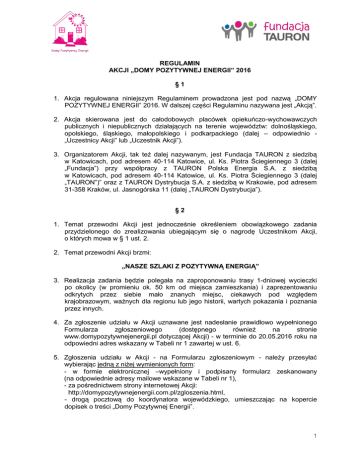 REGULAMIN AKCJI „DOMY POZYTYWNEJ ENERGII” 2016 §1 1. Akcja regulowana niniejszym Regulaminem prowadzona jest pod nazwą „DOMY POZYTYWNEJ ENERGII” 2016. W dalszej części Regulaminu nazywana jest „Akcją”. 2. Akcja skierowana jest do całodobowych placówek opiekuńczo-wychowawczych publicznych i niepublicznych działających na terenie województw: dolnośląskiego, opolskiego, śląskiego, małopolskiego i podkarpackiego (dalej – odpowiednio „Uczestnicy Akcji” lub „Uczestnik Akcji”). 3. Organizatorem Akcji, tak też dalej nazywanym, jest Fundacja TAURON z siedzibą w Katowicach, pod adresem 40-114 Katowice, ul. Ks. Piotra Ściegiennego 3 (dalej „Fundacja”) przy współpracy z TAURON Polska Energia S.A. z siedzibą w Katowicach, pod adresem 40-114 Katowice, ul. Ks. Piotra Ściegiennego 3 (dalej „TAURON”)” oraz z TAURON Dystrybucja S.A. z siedzibą w Krakowie, pod adresem 31-358 Kraków, ul. Jasnogórska 11 (dalej „TAURON Dystrybucja”). §2 1. Temat przewodni Akcji jest jednocześnie określeniem obowiązkowego zadania przydzielonego do zrealizowania ubiegającym się o nagrodę Uczestnikom Akcji, o których mowa w § 1 ust. 2. 2. Temat przewodni Akcji brzmi: „NASZE SZLAKI Z POZYTYWNĄ ENERGIĄ” 3. Realizacja zadania będzie polegała na zaproponowaniu trasy 1-dniowej wycieczki po okolicy (w promieniu ok. 50 km od miejsca zamieszkania) i zaprezentowaniu odkrytych przez siebie mało znanych miejsc, ciekawych pod względem krajobrazowym, ważnych dla regionu lub jego historii, wartych pokazania i poznania przez innych. 4. Za zgłoszenie udziału w Akcji uznawane jest nadesłanie prawidłowo wypełnionego Formularza zgłoszeniowego (dostępnego również na stronie www.domypozytywnejenergii.pl dotyczącej Akcji) - w terminie do 20.05.2016 roku na odpowiedni adres wskazany w Tabeli nr 1 zawartej w ust. 6. 5. Zgłoszenia udziału w Akcji - na Formularzu zgłoszeniowym - należy przesyłać wybierając jedną z niżej wymienionych form: - w formie elektronicznej –wypełniony i podpisany formularz zeskanowany (na odpowiednie adresy mailowe wskazane w Tabeli nr 1), - za pośrednictwem strony internetowej Akcji: http://domypozytywnejenergii.com.pl/zgloszenia.html, - drogą pocztową do koordynatora wojewódzkiego, umieszczając na kopercie dopisek o treści „Domy Pozytywnej Energii”. 1 Tabela nr 1 adres koordynator Uczestnicy Akcji z województwa dolnośląskiego TAURON Dystrybucja S.A. Oddział w Wałbrzychu ul. Wysockiego 11, 58-300 Wałbrzych Elżbieta MAREK, tel. 74 88 98 760, tel. kom.: 665 354 611 [email protected] Uczestnicy Akcji z województwa opolskiego TAURON Dystrybucja S.A. Oddział w Opolu ul. Waryńskiego 1, 45-047 Opole Małgorzata SOBOL, tel. 77 88 99 389, tel. kom.: 782 820 193 [email protected] Uczestnicy Akcji z województwa śląskiego TAURON Dystrybucja S.A. Oddział w Będzinie ul. Małobądzka 141, 42-500 Będzin Piotr ŻYDEK, tel. 32 766 21 50, tel. kom.: 516 112 017 [email protected] Uczestnicy Akcji z województwa małopolskiego TAURON Dystrybucja S.A. ul. Jasnogórska 11, 31-358 Kraków Agata KOTAPKA, tel. 12 261 10 86, tel. kom.: 516 110 020 [email protected] TAURON Dystrybucja S.A. Uczestnicy Akcji Oddział w Tarnowie z województwa podkarpackiego ul. Lwowska 72-96b, 33-100 Tarnów Beata BORYCZKO, tel. 14 631 12 19, tel. kom.: 516 115 904 [email protected] 6. Ocenie będą poddane prace konkursowe - prezentacje, które zostaną przesłane pocztą na nośniku CDR lub pen-drive we wskazanym w harmonogramie Akcji terminie, to jest do 15.07.2016 roku (określonym w Tabeli nr 2 zawartej w ust. 9). Oceniana będzie pomysłowość, oryginalność i atrakcyjność trasy turystycznej. Na ocenę nie będzie miała wpływu forma i walory estetyczne prezentacji – opisu trasy (te będą narzucone w regulaminie, aby zapobiec kontrowersjom i uniknąć rozbieżności). 7. Oceny nadesłanych przez Uczestników Akcji prezentacji dokona, a także wyłoni na tej podstawie Laureatów Akcji, przyznając im tytuły „Domów Pozytywnej Energii” i nagrody finansowe - Kapituła Akcji (zwana dalej Kapitułą), o której jest mowa w § 4. 8. Organizator Akcji nie przyjmuje prac niezwiązanych z tematem przewodnim Akcji. 9. Harmonogram Akcji zawiera Tabela nr 2: 2 Tabela nr 2 Data Wydarzenie 27 kwietnia 2016 r. START AKCJI – przesłanie przez organizatora Akcji do Uczestników: 1. zaproszeń do udziału w Akcji, 2. formularzy zgłoszeniowych, 3. Regulaminu Akcji wraz z załącznikami 20 maja 2016 r. Ostateczny termin nadsyłania zgłoszeń uczestnictwa w Akcji 15 lipca 2016 r. Ostateczny termin nadsyłania prac konkursowych 18 lipca – 12 sierpnia 2016 r. Ocena nadesłanych prac konkursowych 15 – 30 sierpnia 2016 r. Rozesłanie zaproszeń dla laureatów na Galę Finałową 7 – 16 września 2016 r. GALA FINAŁOWA Ogłoszenie laureatów Akcji na poziomie danego województwa i przekazanie im przez Organizatora Akcji symbolicznych czeków oraz ogłoszenie zwycięzców tegorocznej edycji Akcji wrzesień / październik 2016 r. Zawarcie umów darowizny i przekazanie nagród finansowych na rachunki bankowe Laureatów Akcji §3 1. Laureaci będą wyłaniani na poziomie wojewódzkim. 2. W każdym województwie zostanie wyłoniony i maksymalnie 3 zdobywców wyróżnień. 1 3. Organizator przewiduje 15 wyróżnień. głównych przyznanie 5 nagród Laureat nagrody oraz głównej maksymalnie 4. Każdy Laureat nagrody głównej otrzyma nagrodę finansową w wysokości 50.000 zł (słownie: pięćdziesiąt tysięcy złotych). 5. Każdy Wyróżniony otrzyma nagrodę finansową w wysokości 10.000 zł (słownie: dziesięć tysięcy złotych). 6. Organizator zastrzega sobie możliwość nieprzyznania wymienionej w pkt. 3 ilości wyróżnień. 3 7. Laureaci nagród głównych i wyróżnień otrzymają nagrody finansowe na podstawie umów darowizny. 8. Wszyscy Laureaci są zobowiązani do dostarczenia niezbędnej dokumentacji, o której mowa w Formularzu Zg