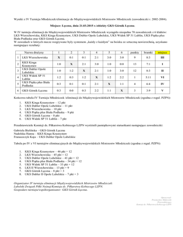 Wyniki z IV Turnieju Młodziczek/eliminacje do Międzywojewódzkich Mistrzostw Młodziczek (zawodniczki r. 2002-2004). Miejsce: Łęczna, dnia 21.03.2015 r./obiekty GKS Górnik Łęczna. W IV turnieju eliminacji do Międzywojewódzkich Mistrzostw Młodziczek wystąpiło niespełna 70 zawodniczek z 6 klubów: LKS Wierzchowiska, KKS Kinga Krasnystaw, UKS Dubler Opole Lubelskie, UKS Widok SP 51 Lublin, UKS Piątka plus Biała Podlaska oraz GKS Górnik Łęczna. W zawodach w których mecze rozgrywane były systemem „każdy z każdym” na boisku ze sztuczną nawierzchnią, uzyskano następujące rezultaty: 1 Nazwa drużyny 1 2 3 4 5 6 punkty bramki miejsce LKS Wierzchowiska X 0:1 0:1 2:1 3:0 3:0 9 8:3 III 1:0 X 2:1 3:0 1:0 0:0 13 7:1 I 1:0 1:2 X 2:1 1:0 3:0 12 8:3 II 1:2 0:3 1:2 X 1:2 2:2 1 5:11 VI 0:3 0:1 0:1 2:1 X 1:1 4 6:4 IV 0:3 0:0 0:3 2:2 1:1 X 3 3:9 V KKS Kinga Krasnystaw UKS Dubler Opole Lubelskie UKS Widok SP 51 Lublin UKS Piątka plus Biała Podlaska 2 3 4 5 GKS Górnik Łęczna 6 Końcowa tabela IV Turnieju Młodziczek /eliminacji do Międzywojewódzkich Mistrzostw Młodziczek (zgodna z regul. PZPN): 1. 2. 3. 4. 5. 6. KKS Kinga Krasnystaw – 12 pkt UKS Dubler Opole Lubelskie – 11 pkt LKS Wierzchowiska – 10 pkt UKS Piątka plus Biała Podlaska – 9 pkt GKS Górnik Łęczna – 8 pkt UKS Widok SP 51 Lublin – 7 pkt Przedstawiciele Komisji ds. Piłkarstwa Kobiecego LZPN wyróżnili pamiątkowymi statuetkami następujące zawodniczki: Gabriela Bielińska – GKS Górnik Łęczna Nadolska Hanna – KKS Kinga Krasnystaw Franaszczyk Kaja – UKS Dubler Opole Lubelskie Tabela po IV z VI turniejów eliminacyjnych do Międzywojewódzkich Mistrzostw Młodziczek (zgodna z regul. PZPN): 1. 2. 3. 4. 5. 6. 7. 8. KKS Kinga Krasnystaw – 46 pkt + 12 LKS Wierzchowiska – 45 pkt + 12 UKS Dubler Opole Lubelskie – 41 pkt + 12 UKS Piątka plus Biała Podlaska – 34 pkt + 12 UKS Widok SP 51 Lublin – 33 pkt + 12 LKS II Wierzchowiska – 13 pkt + 9 GKS Górnik Łęczna – 8 pkt + 3 UKS Dubler II Opole Lubelskie – 7 pkt + 3 Organizator IV turnieju eliminacji Międzywojewódzkich Mistrzostw Młodziczek: Lubelski Związek Piłki Nożnej/Komisja ds. Piłkarstwa Kobiecego LZPN. Gospodarz turnieju/współorganizator: GKS Górnik Łęczna. Opracował: Przemysław Makowski Przewodniczący Komisji ds. Piłkarstwa Kobiecego LZPN